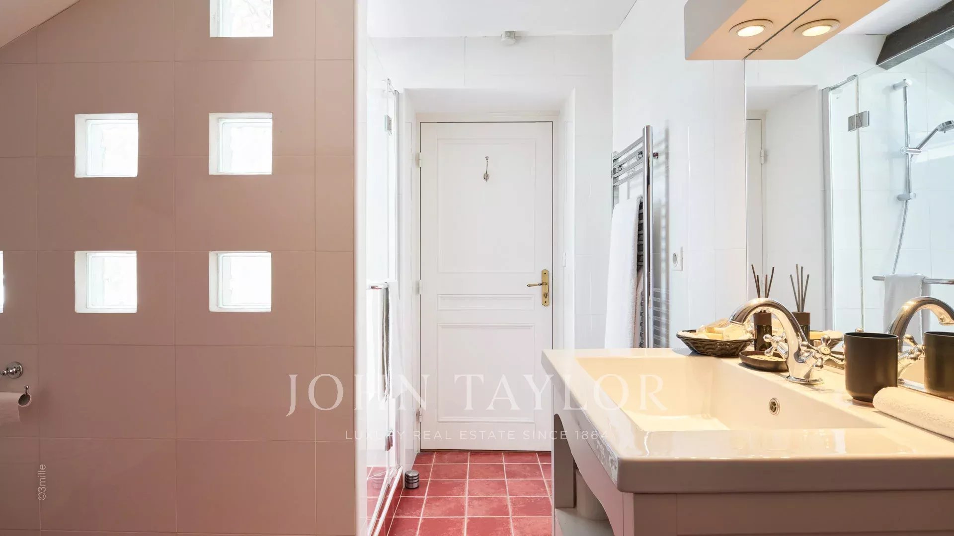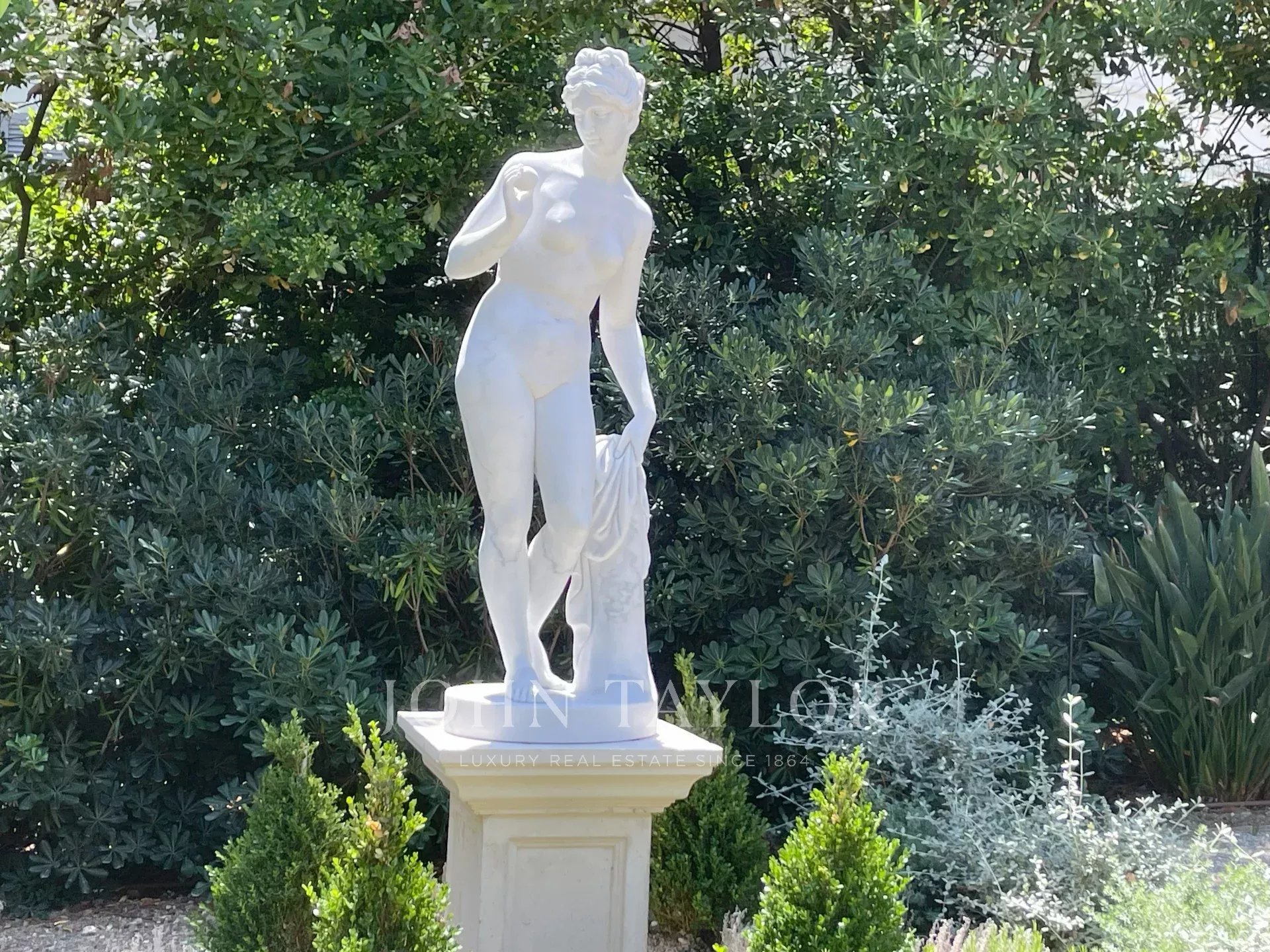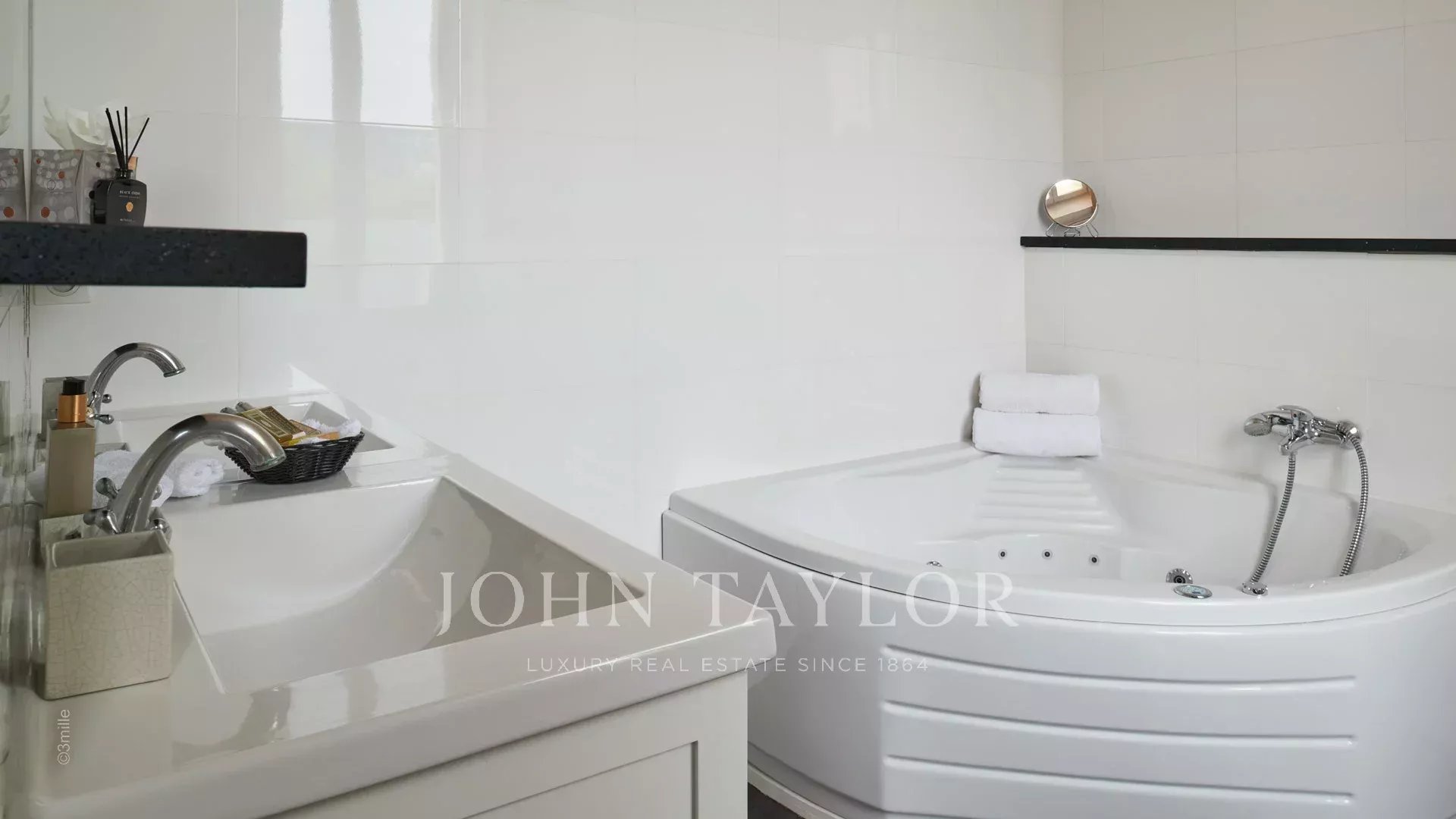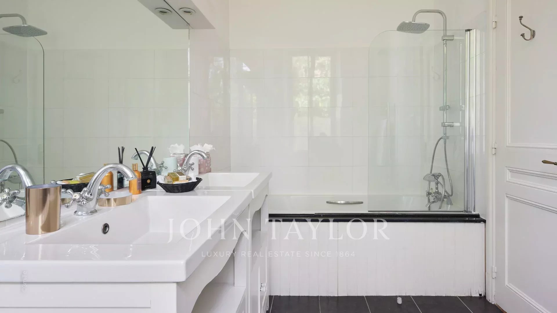 Элегантная прихожая, ведущая в тройную гостиную, выходящую на террасу площадью 60 м2 с видом на бассейн.