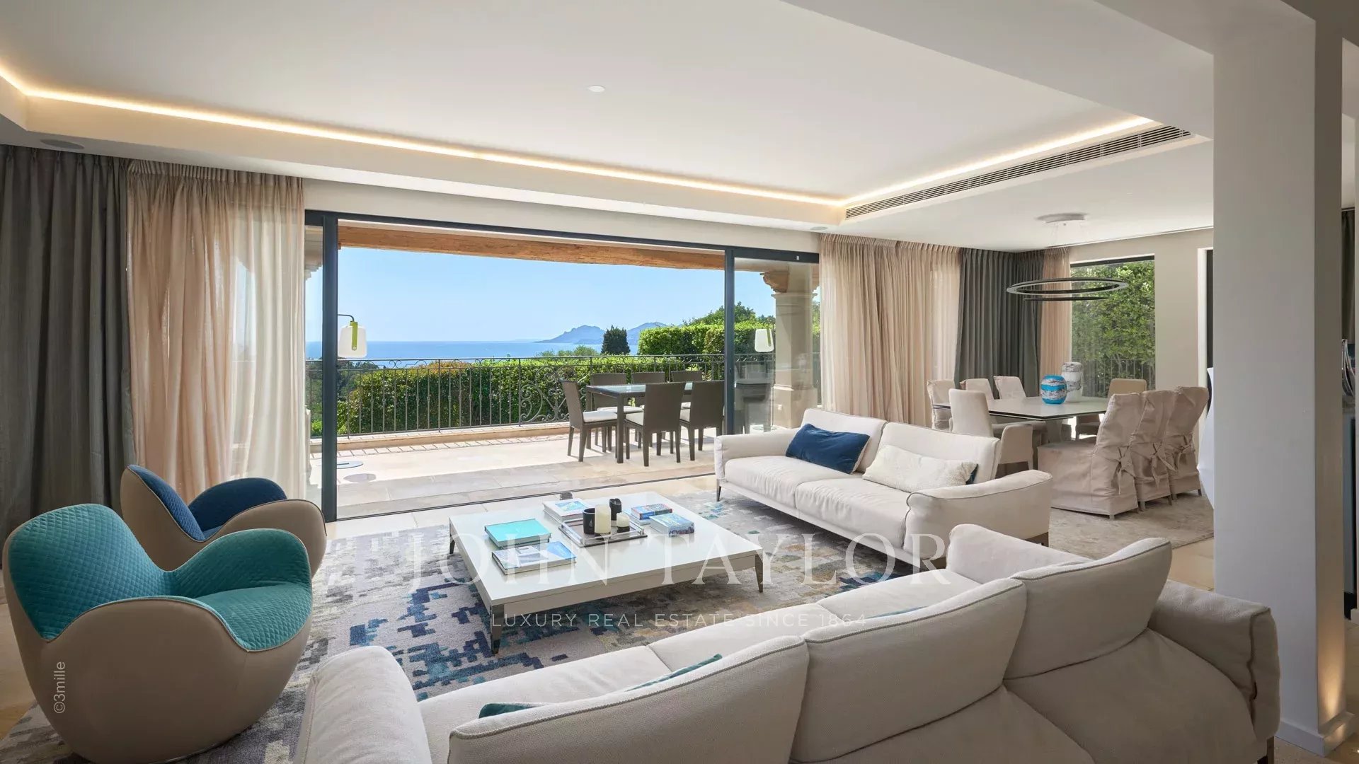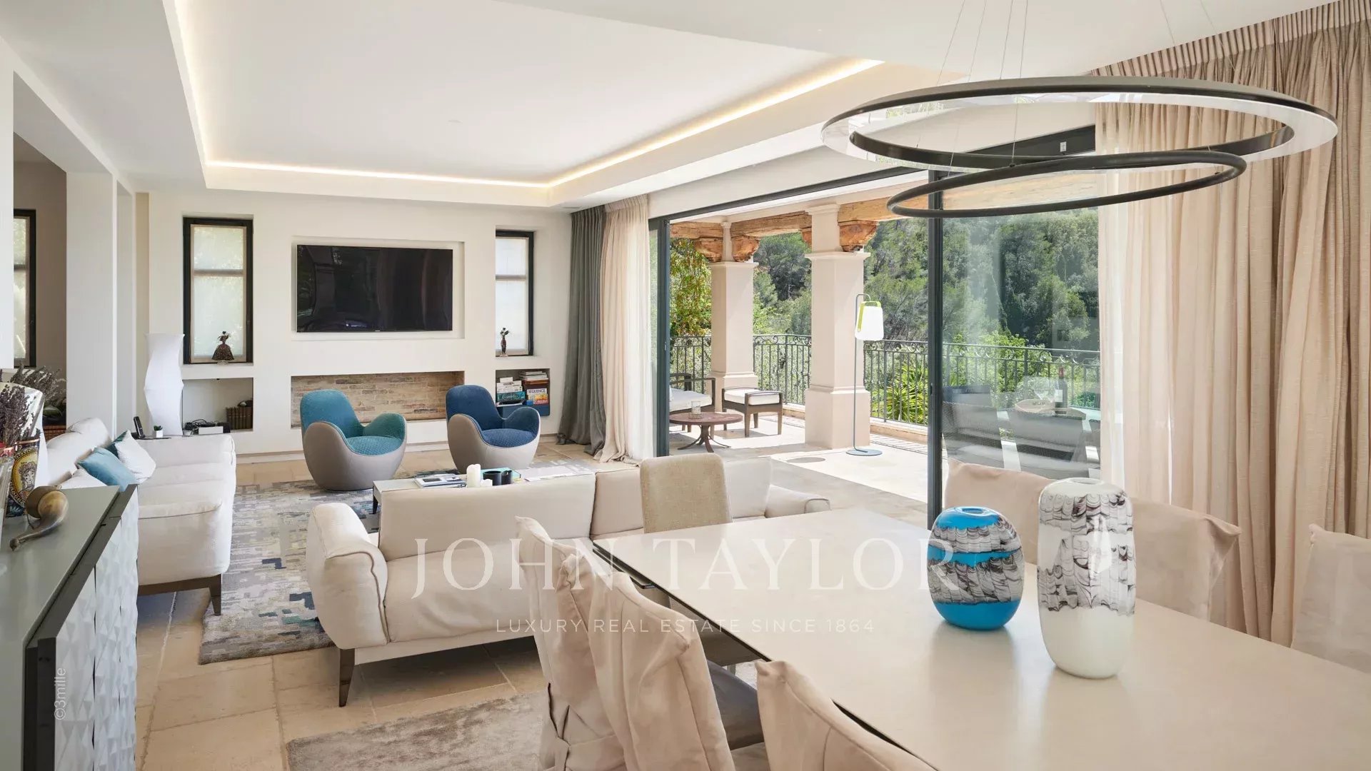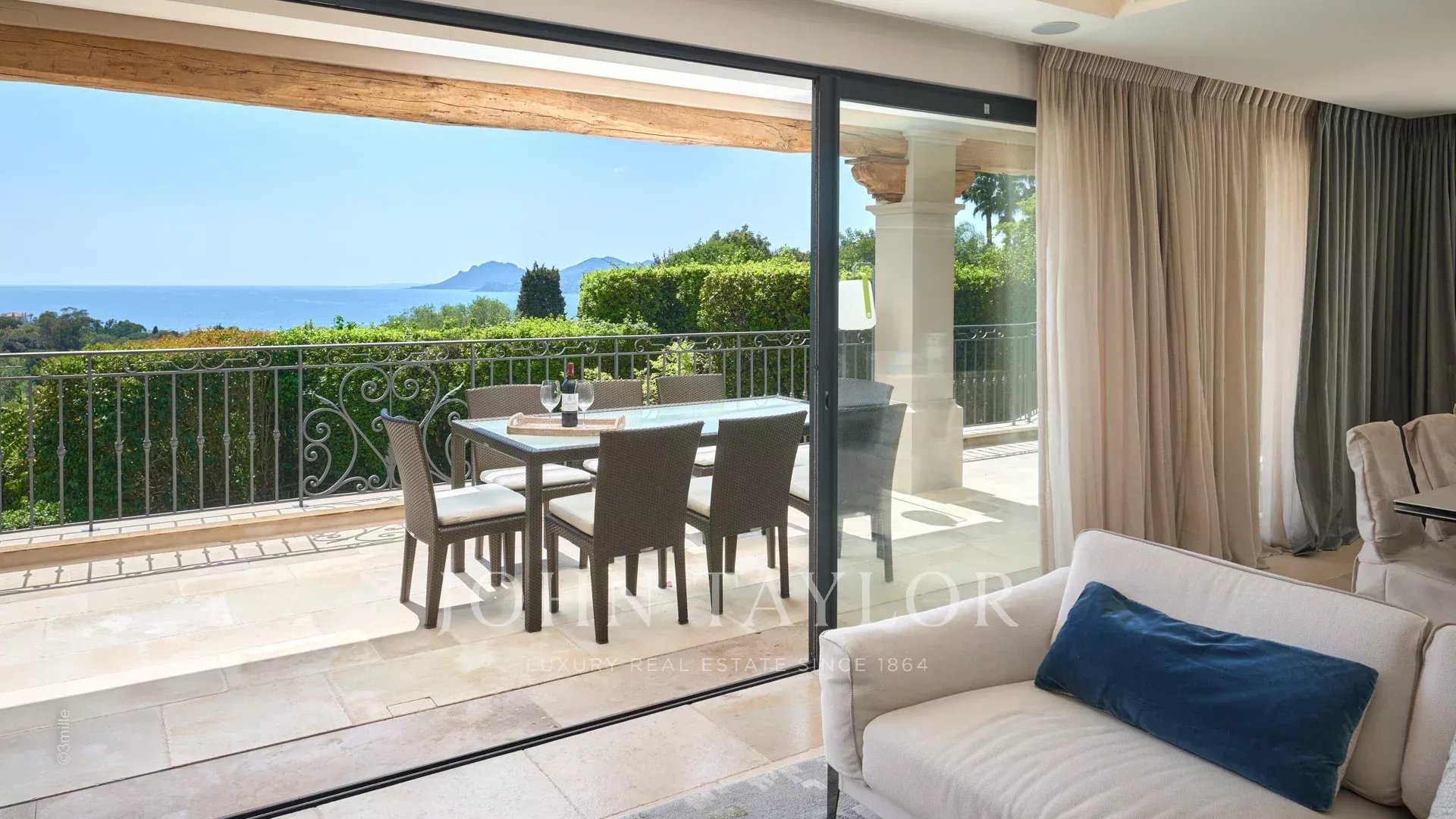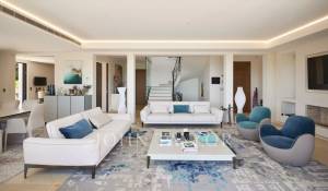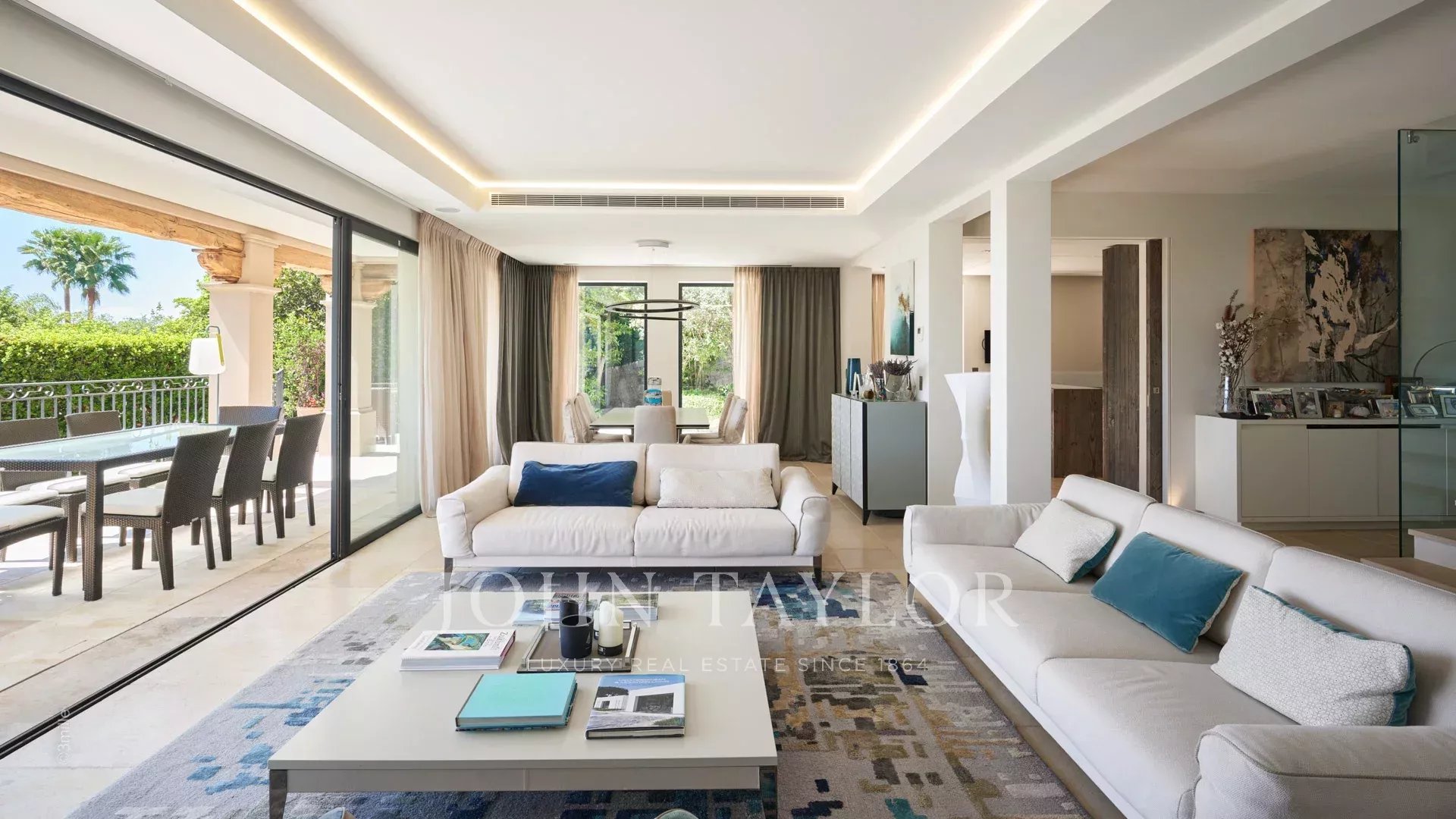 Прихожая, ведущая в гостиную, столовую и кухню открытого плана, выходящую на террасу с панорамным видом на Каннский залив.