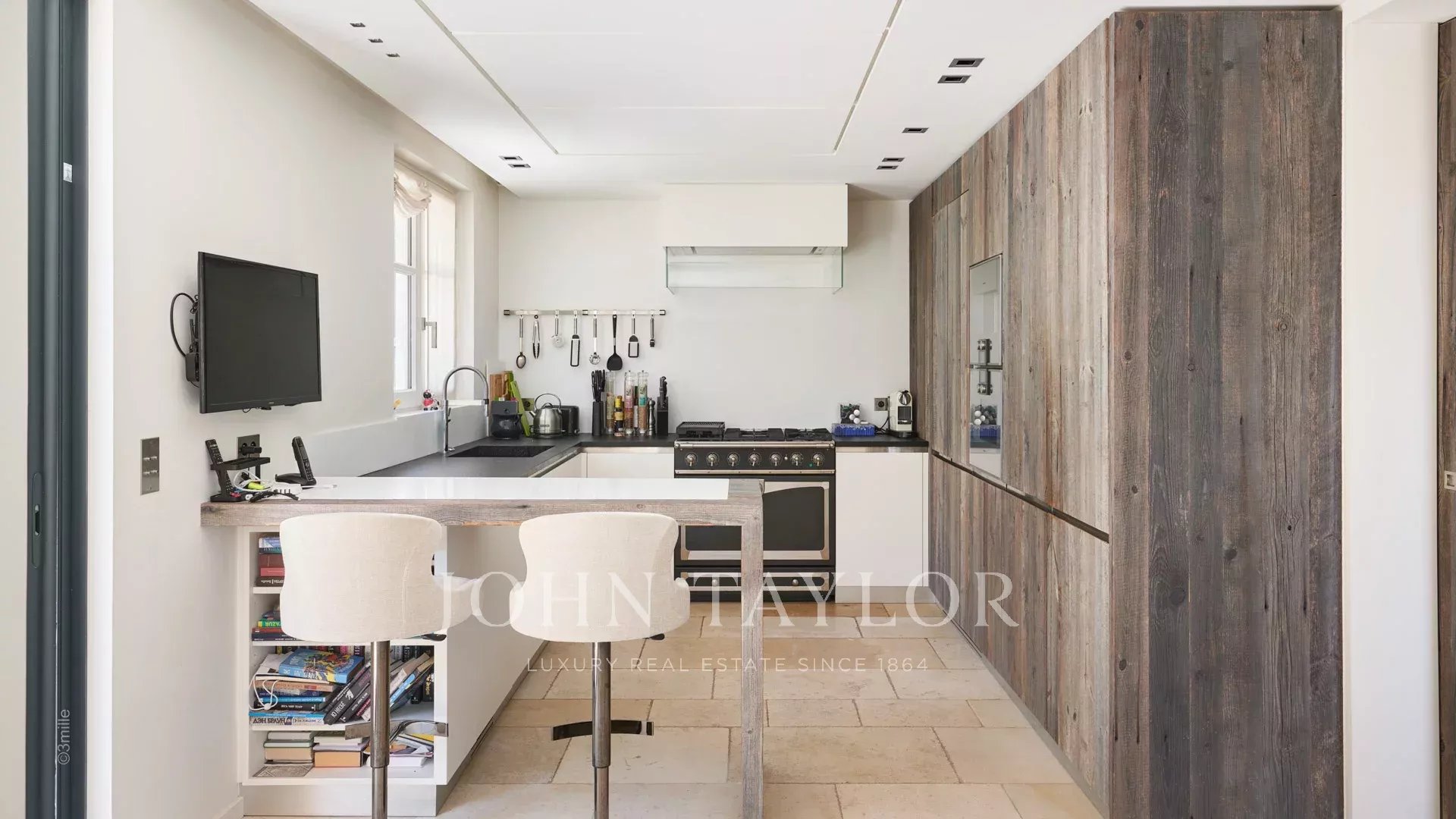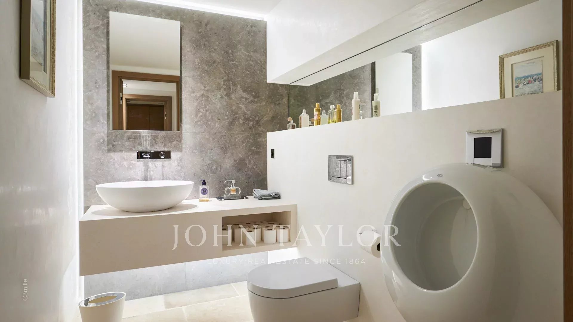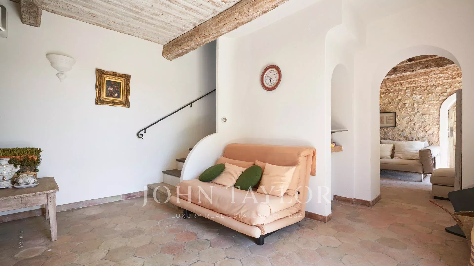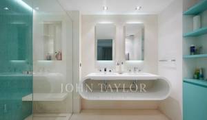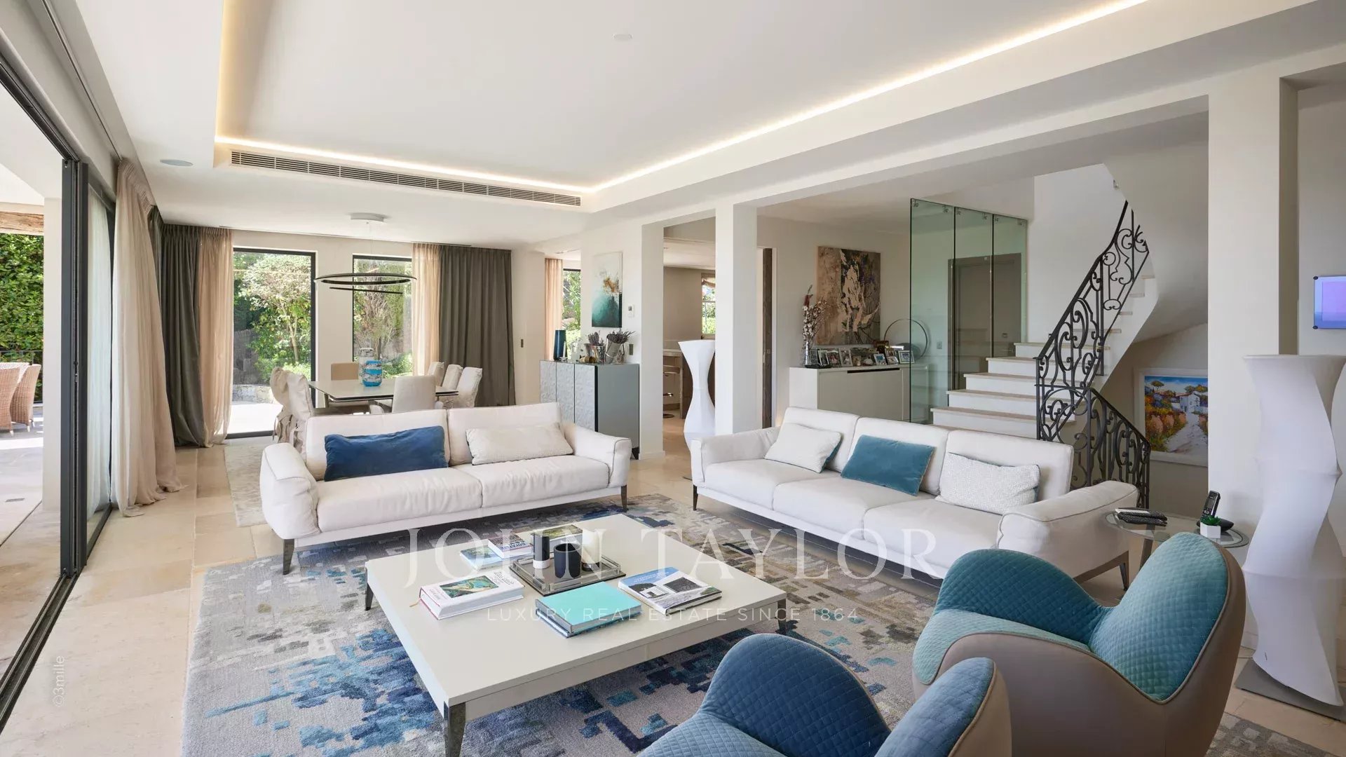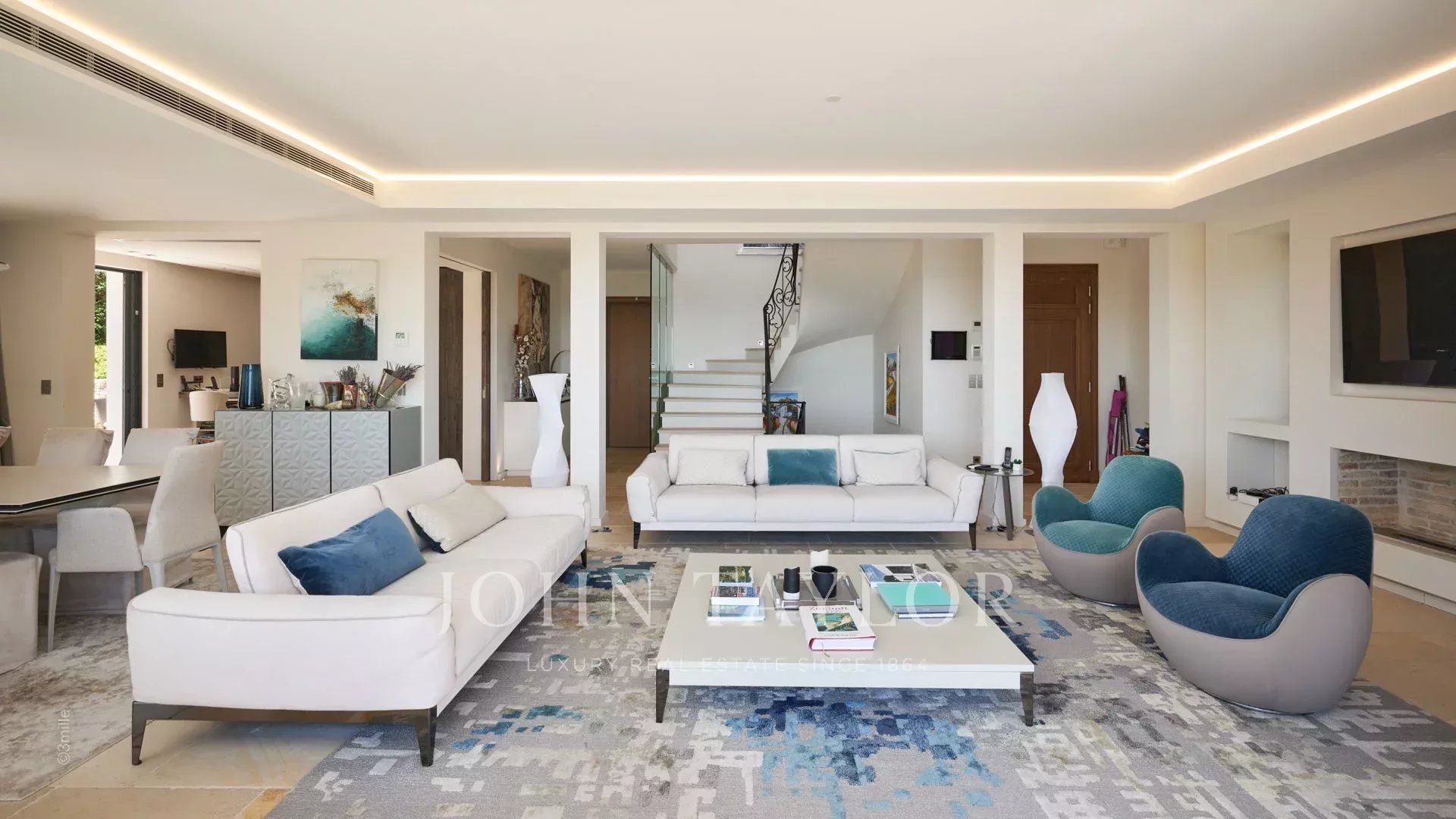 Прихожая, ведущая в гостиную, столовую и кухню открытого плана, выходящую на террасу с панорамным видом на Каннский залив.