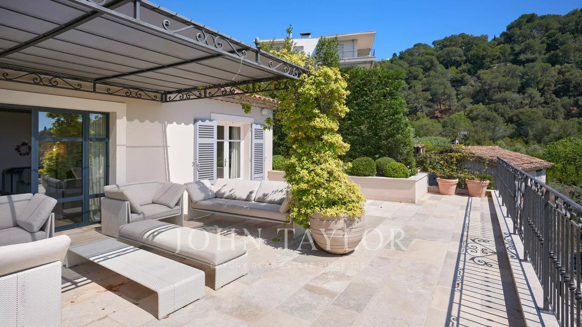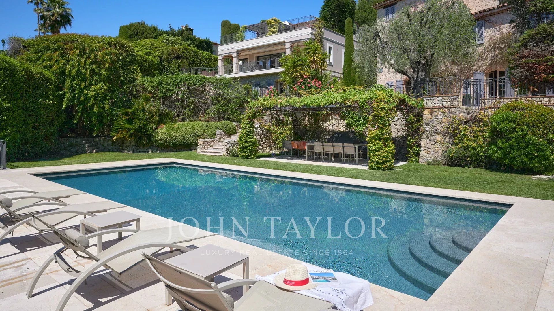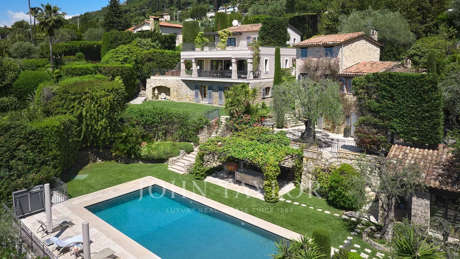 Недалеко от центра Канн, на территории площадью 2 500 м2 расположен великолепный особняк, состоящий из старинного загородного дома и гостевого домика.