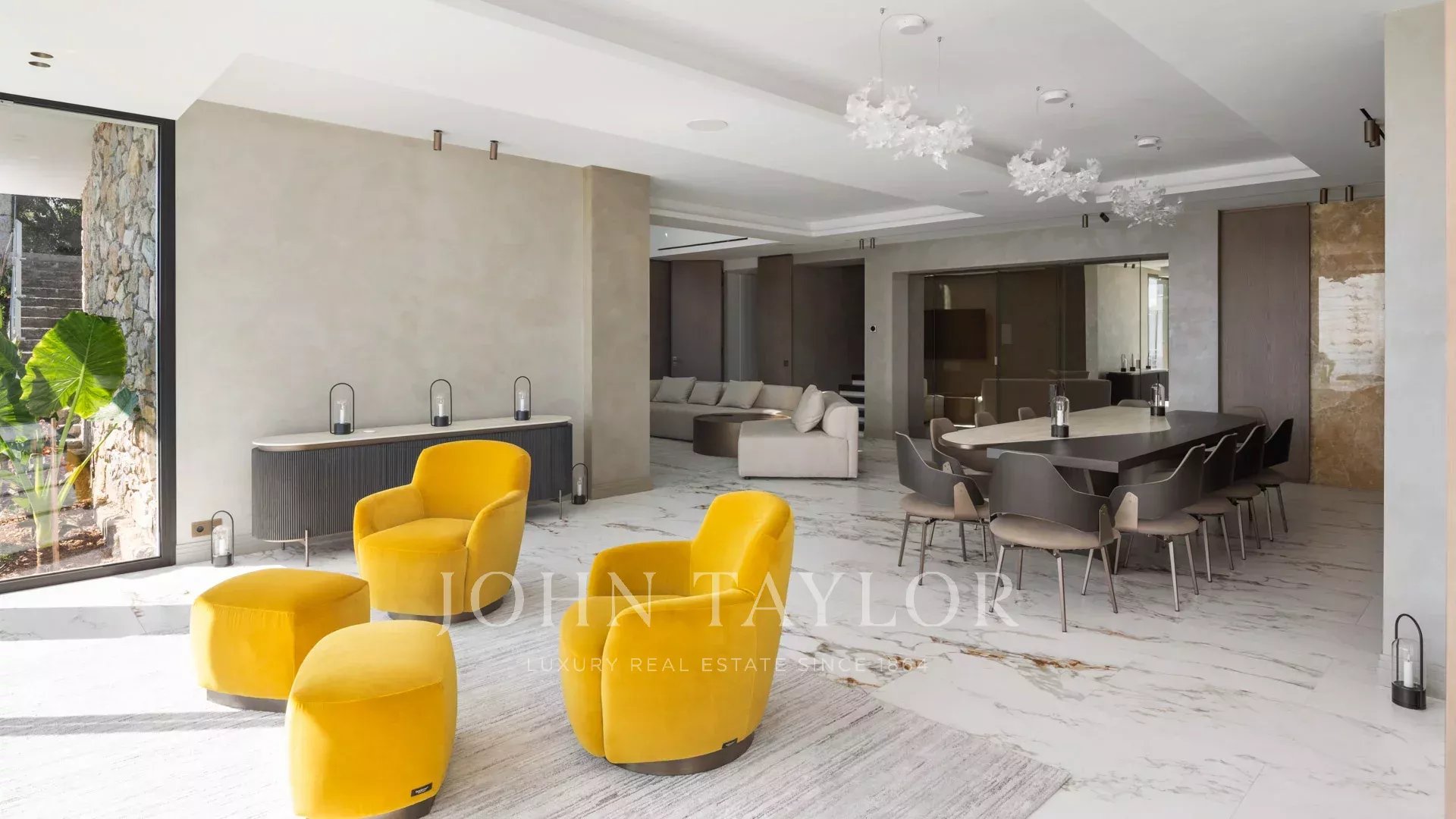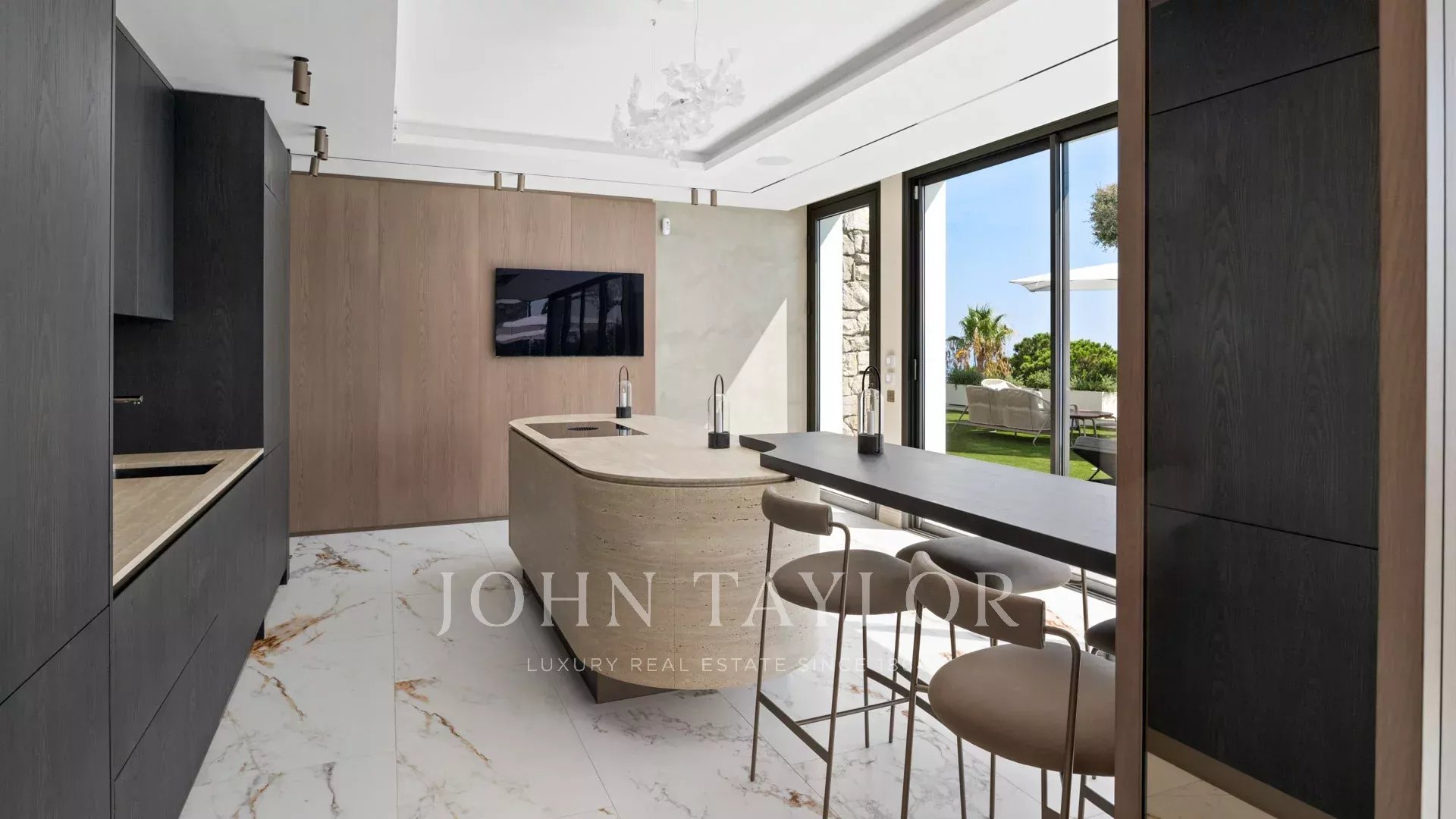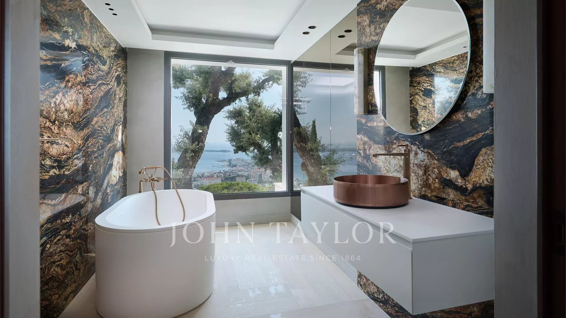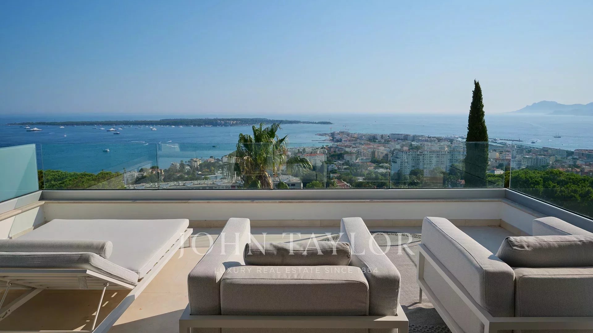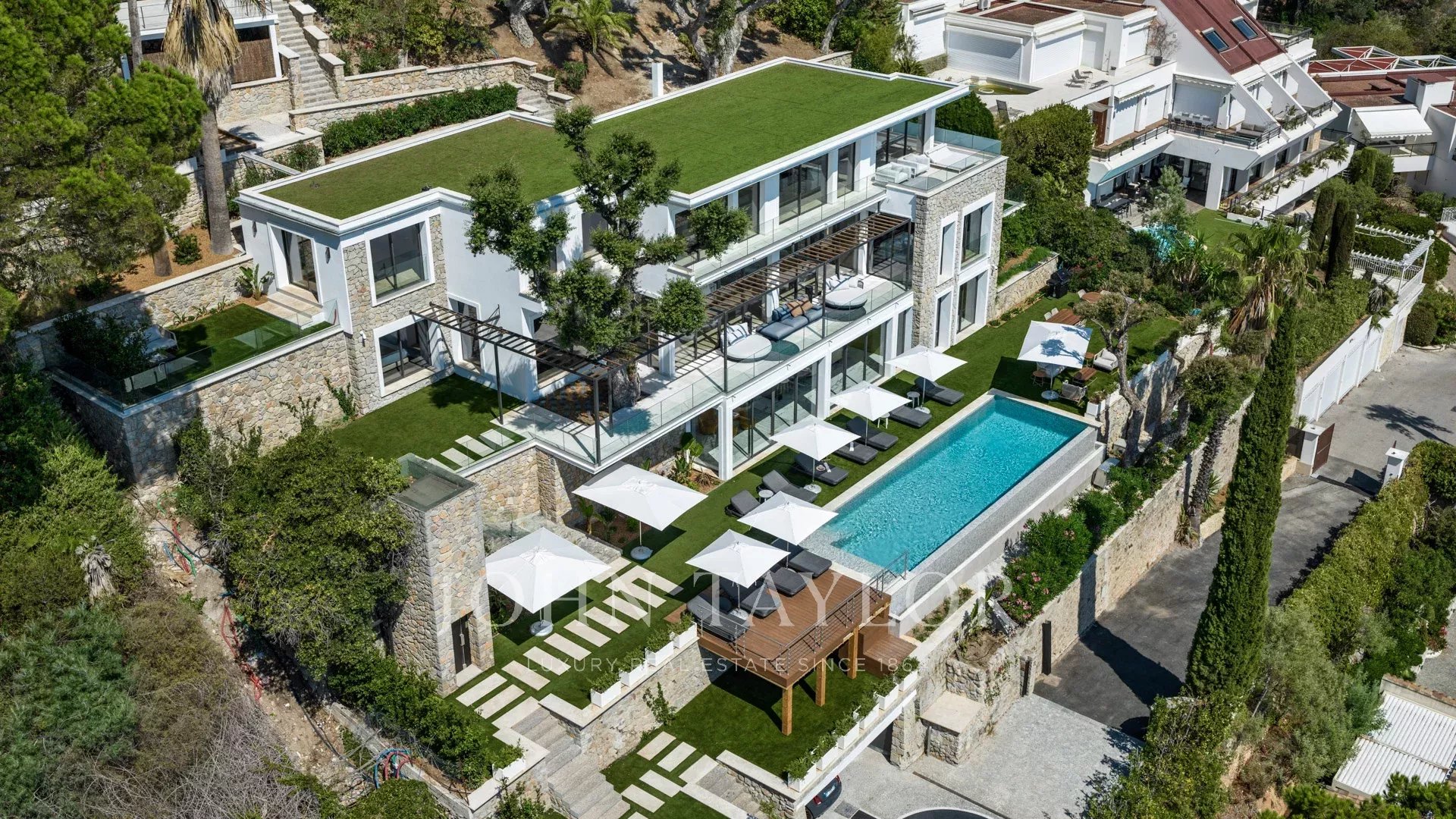 Жилая площадь виллы составляет 550 м², она оформлена в изысканном стиле, а из окон открываются захватывающие панорамы на Каннский залив и Леринские острова.