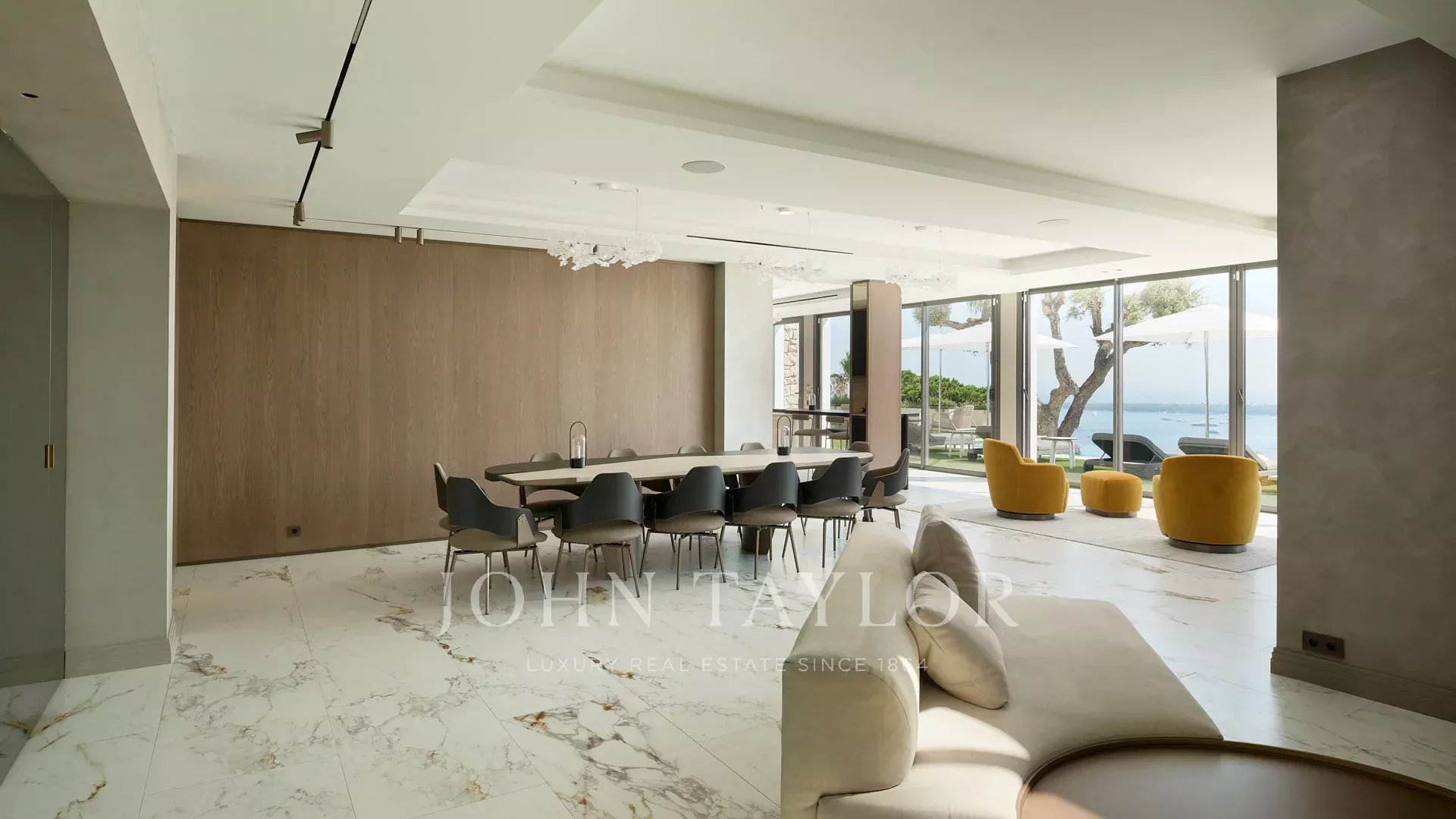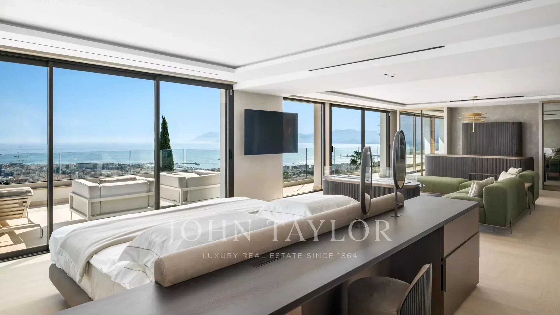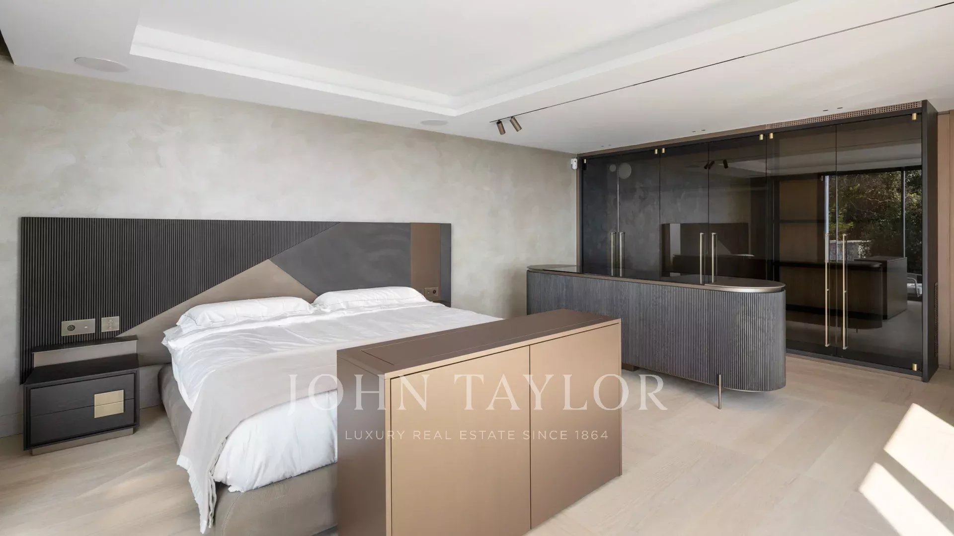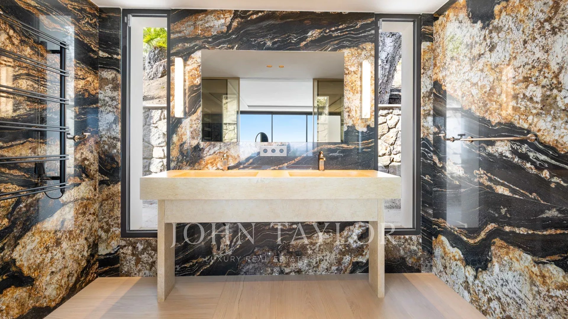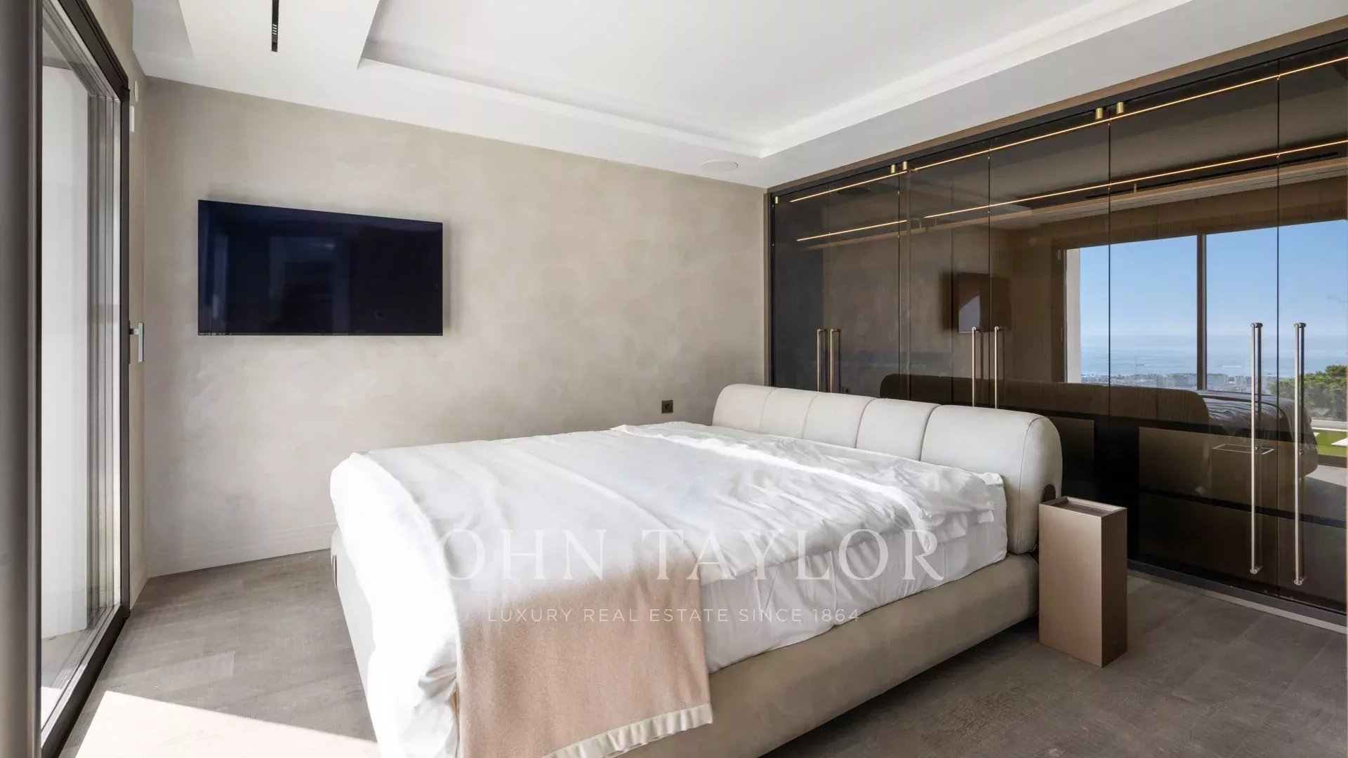 Жилая площадь виллы составляет 550 м², она оформлена в изысканном стиле, а из окон открываются захватывающие панорамы на Каннский залив и Леринские острова.