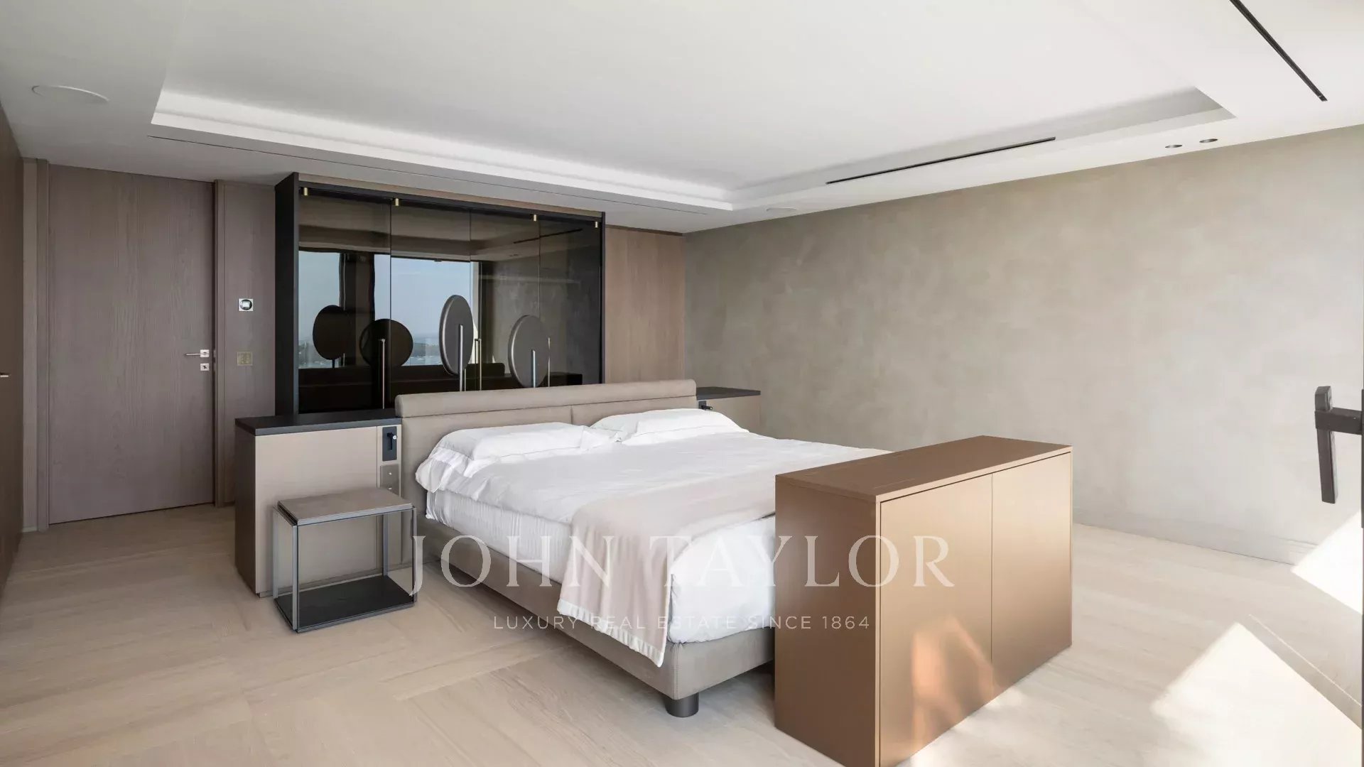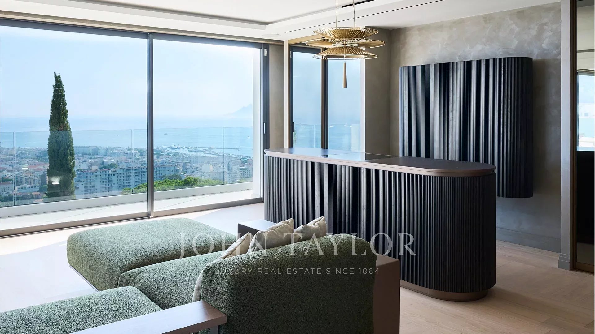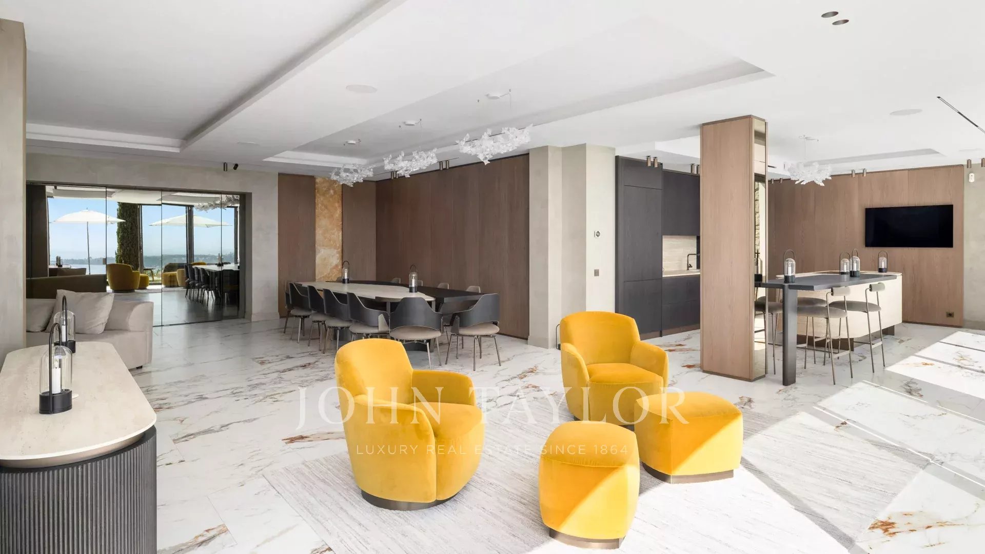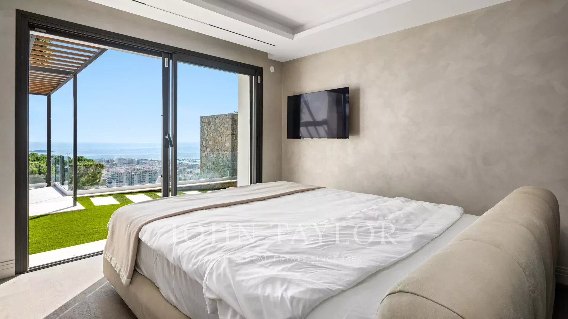 Жилая площадь виллы составляет 550 м², она оформлена в изысканном стиле, а из окон открываются захватывающие панорамы на Каннский залив и Леринские острова.