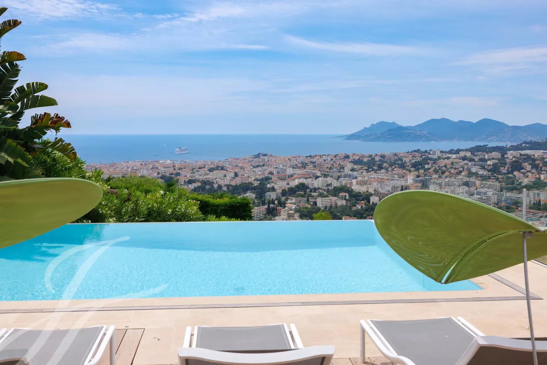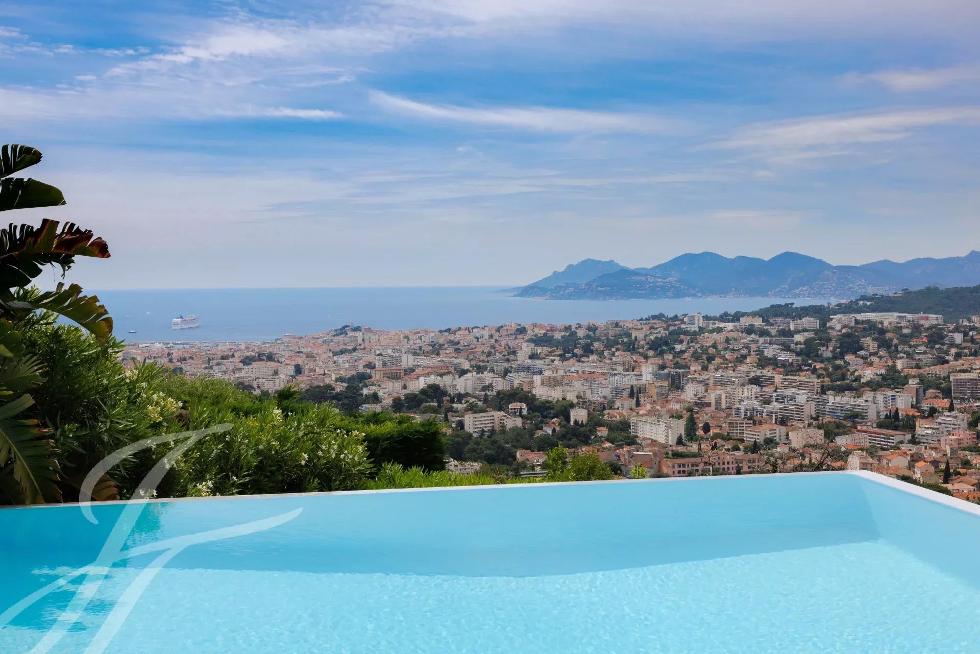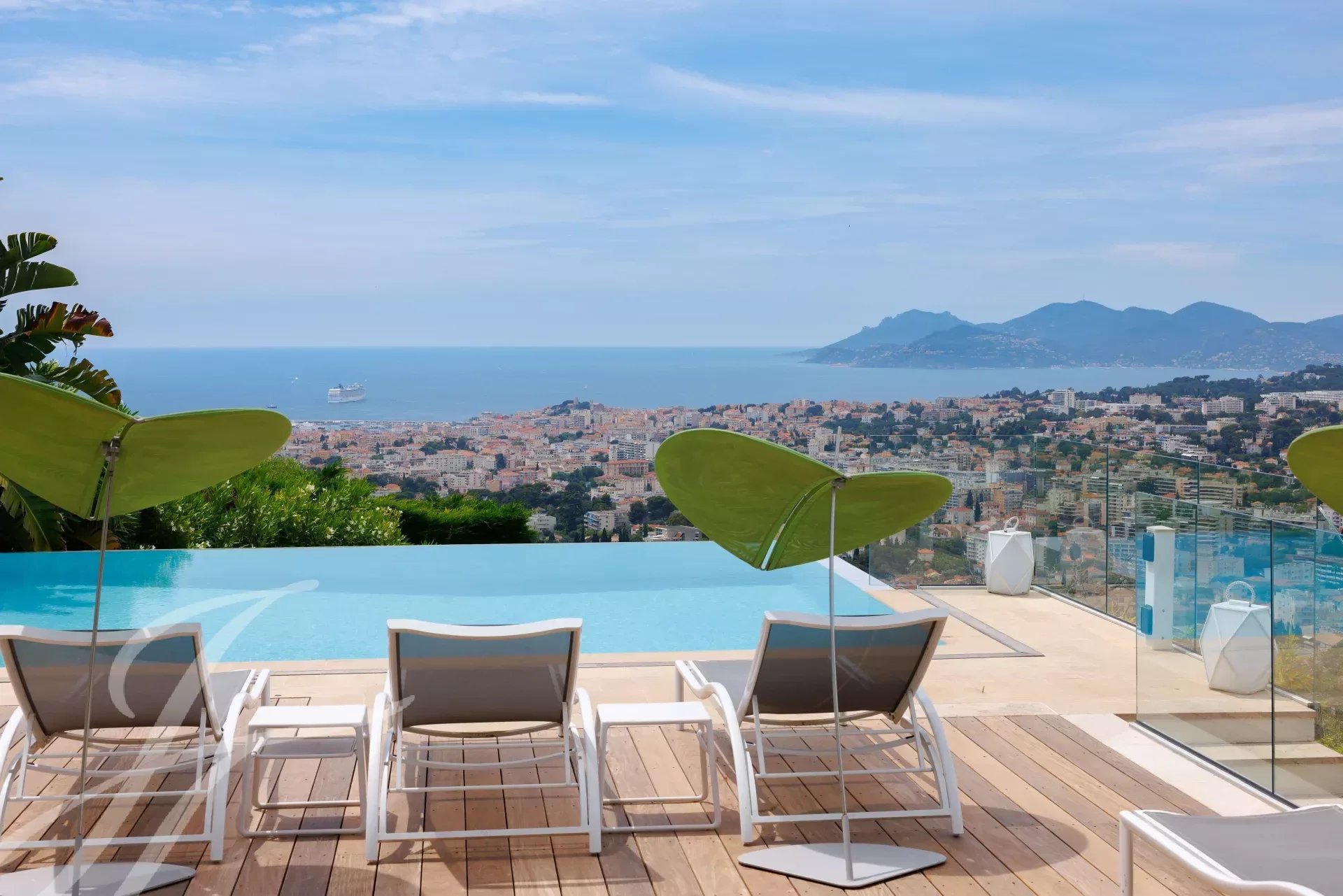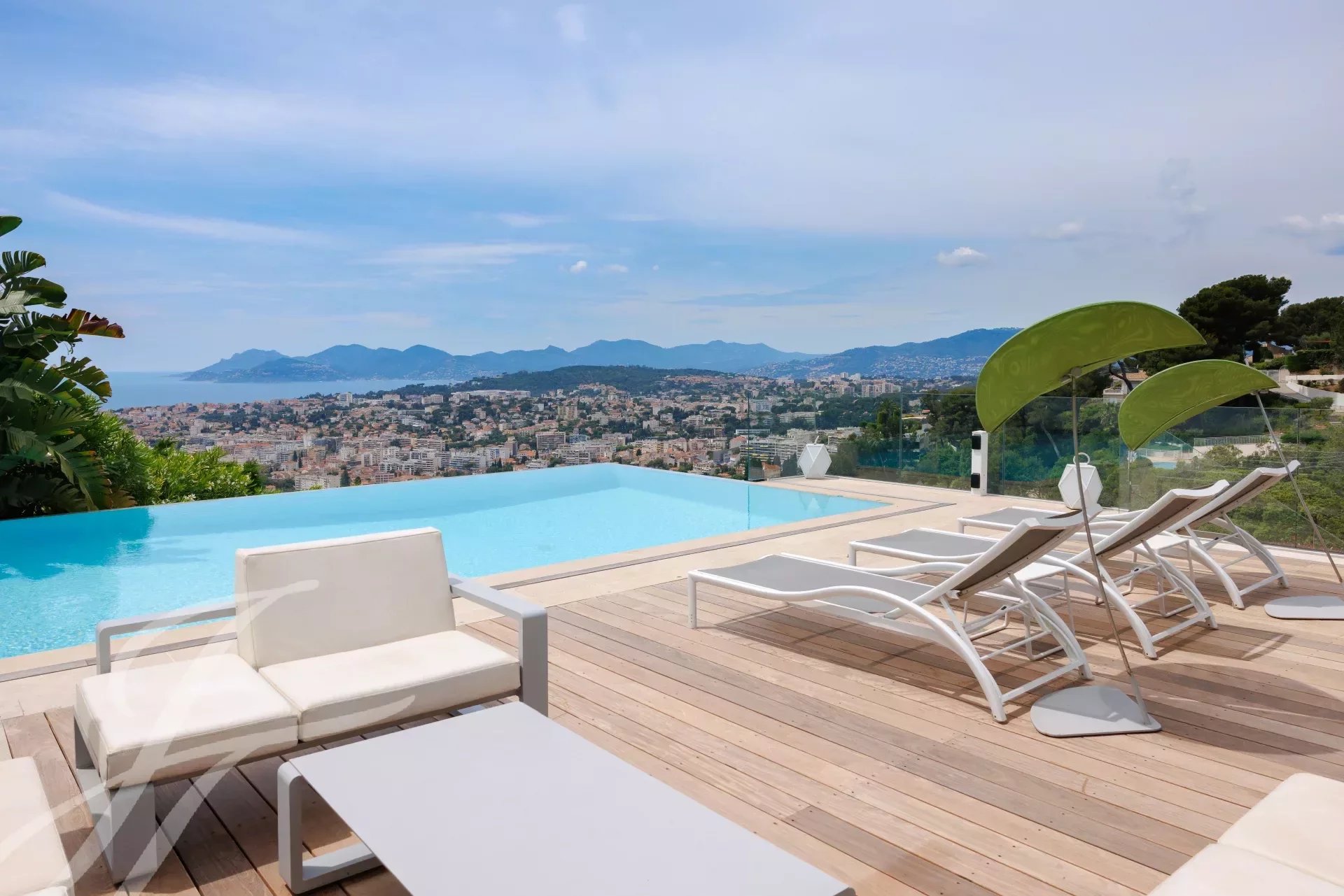 Расположенный на высотах Канн в частном домене, эта великолепная новая современная вилла, полностью оборудованная кондиционером, имеет прекрасный вид на море, на залив Канн и на горы Эстерель.