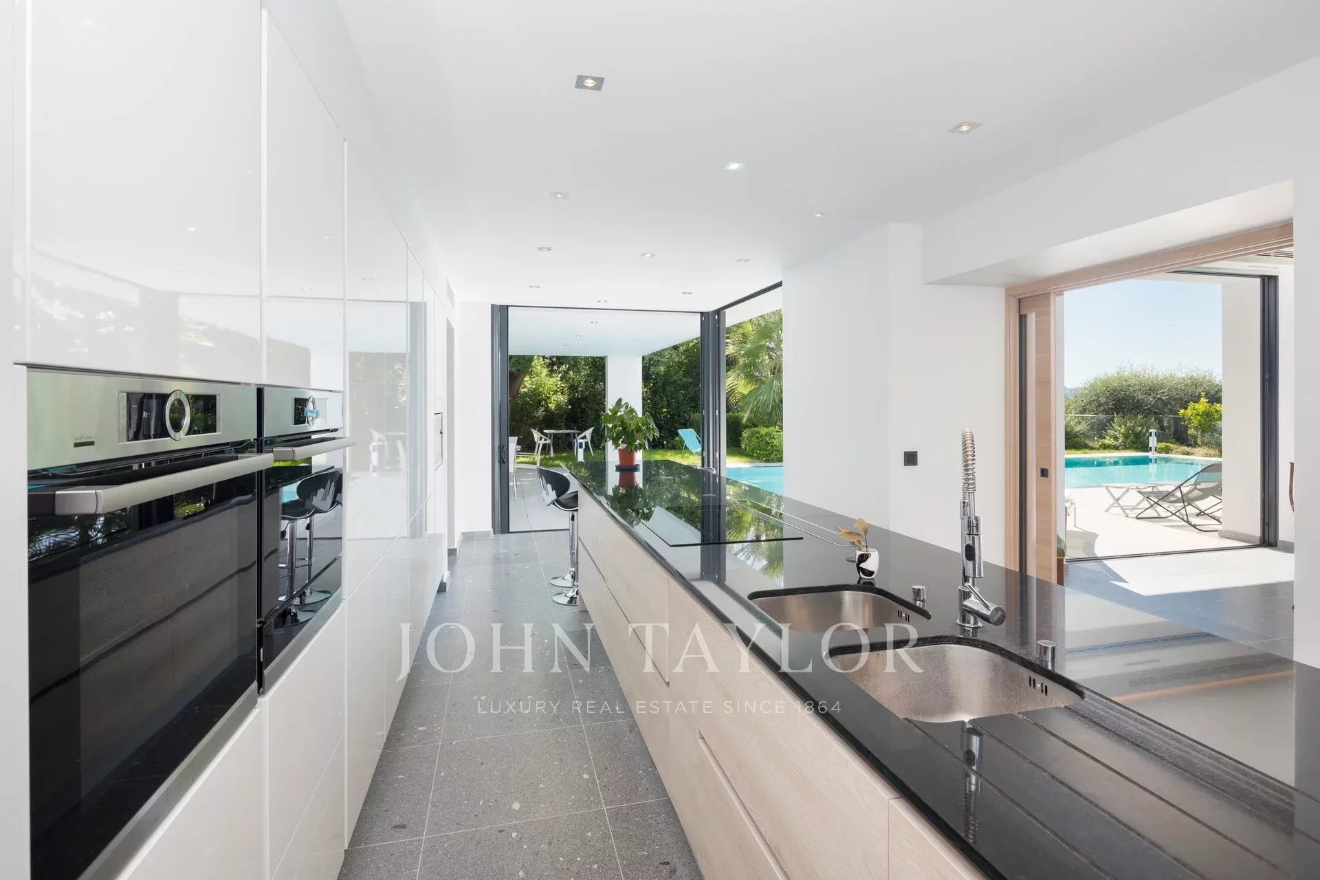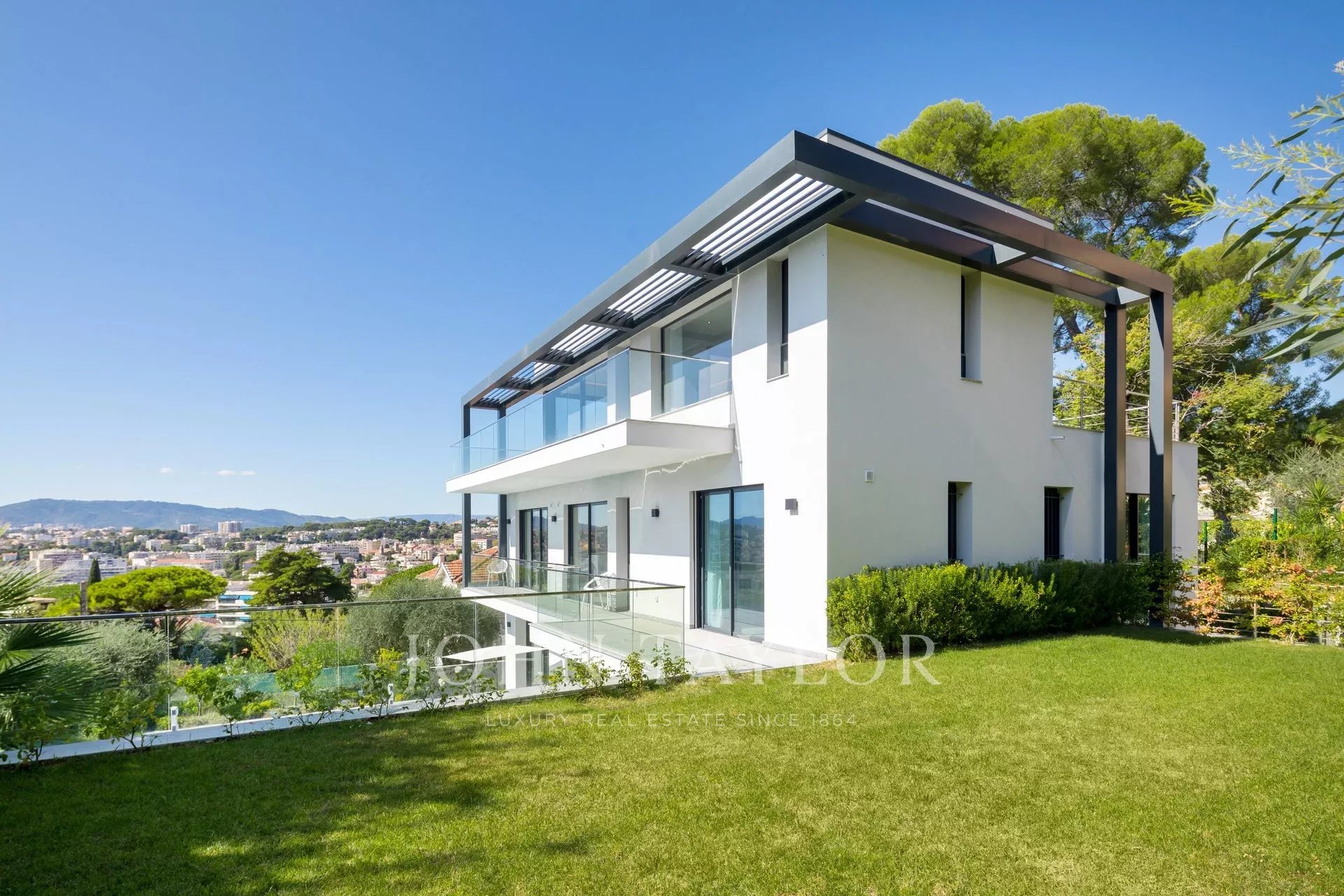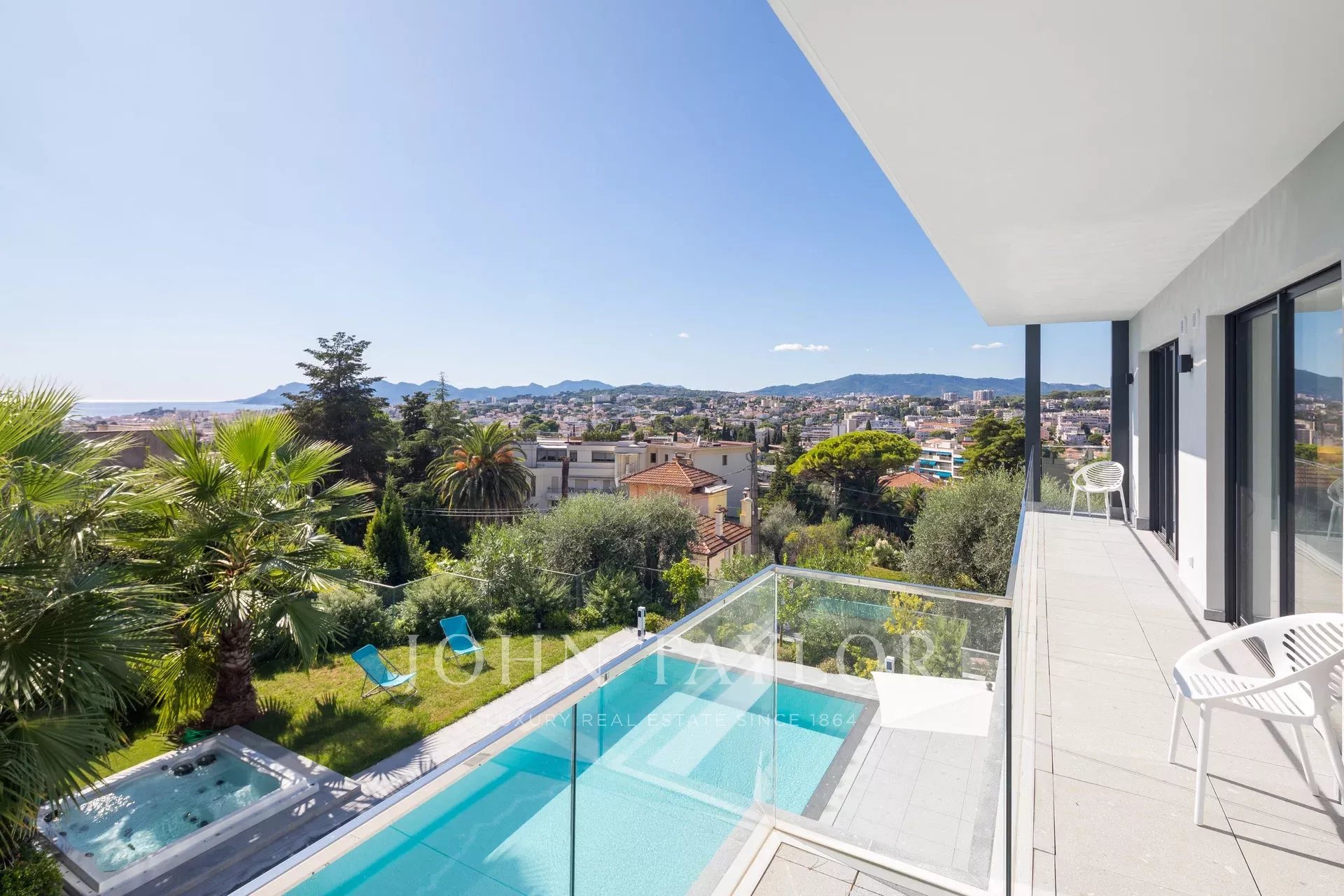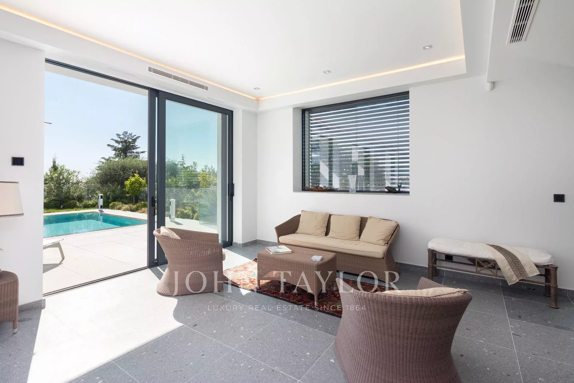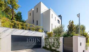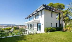 Новый современный дом площадью 450 м2 с кондиционером, расположенный на холмах недалеко от центра Канн, занимает территорию площадью 1 200 м2, с которой открываются виды на окружающие холмы и Ле Сюке.