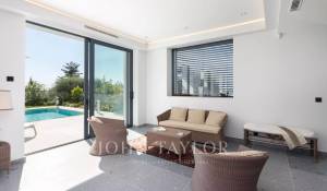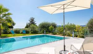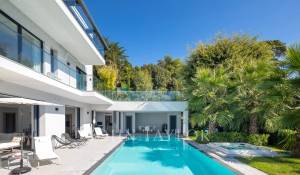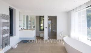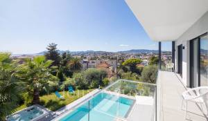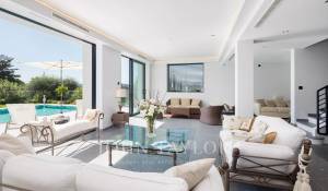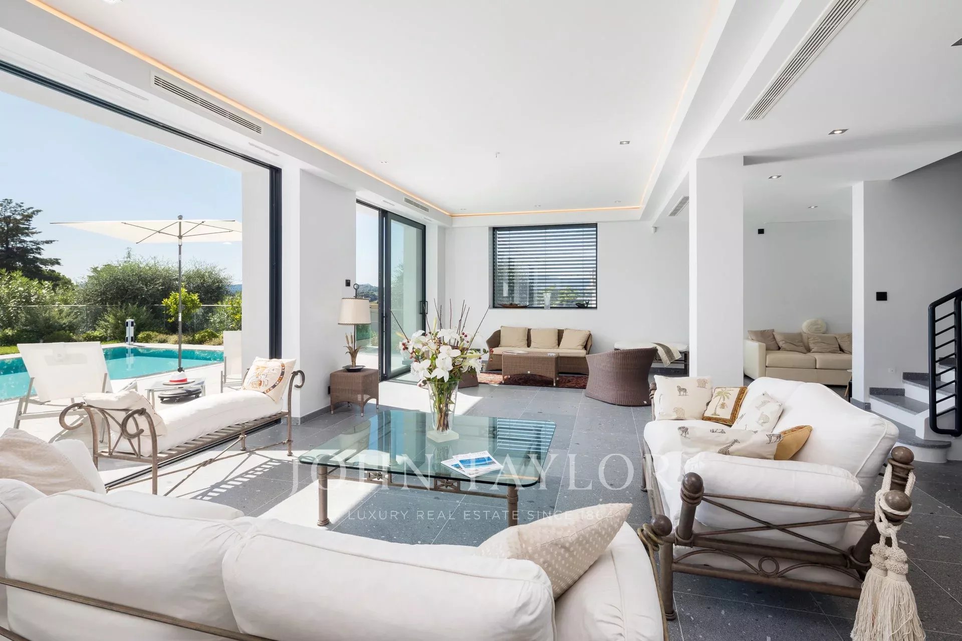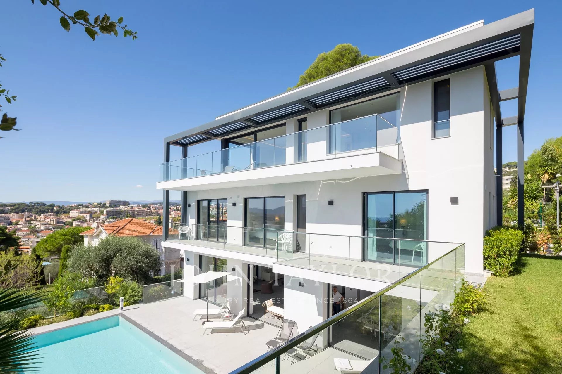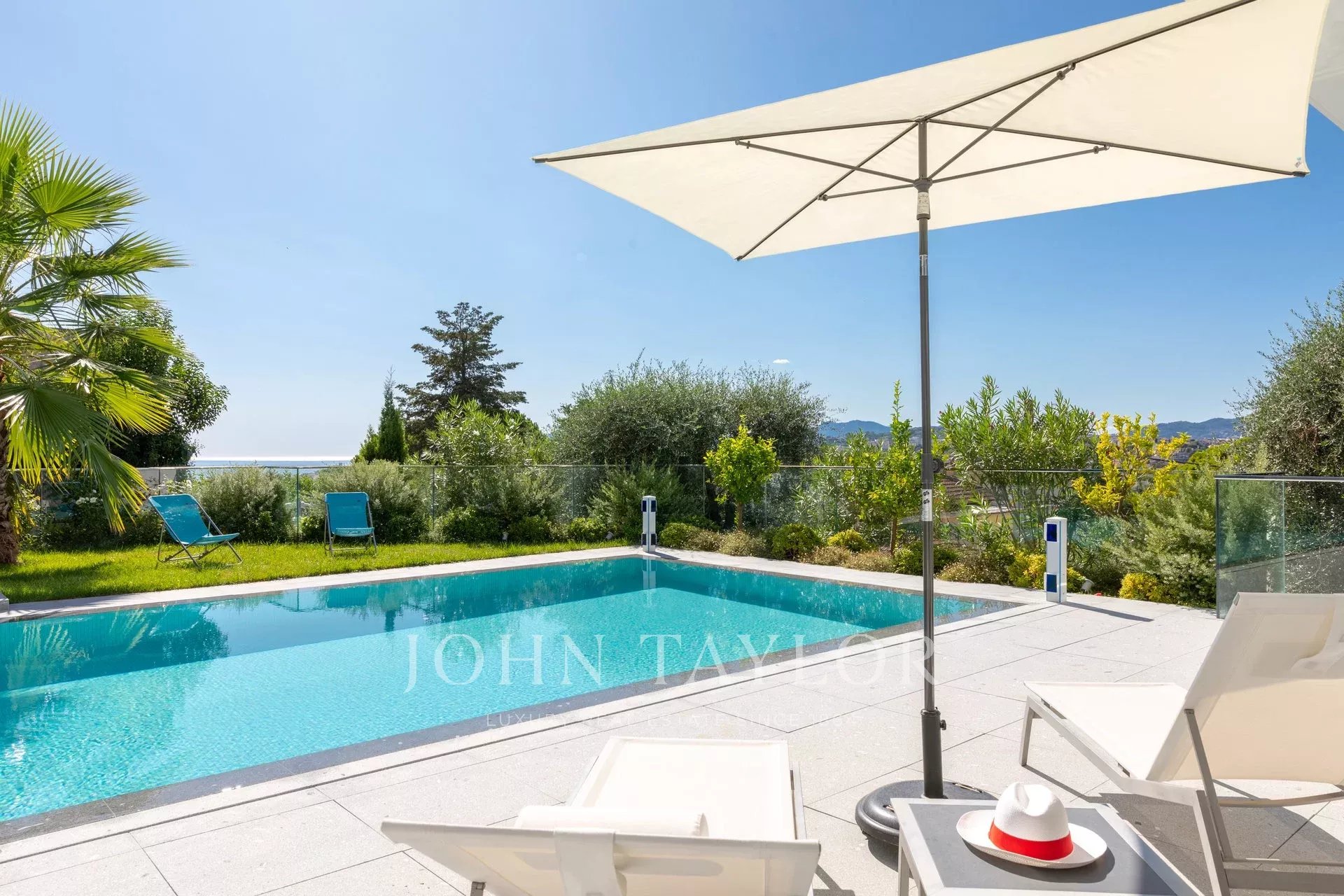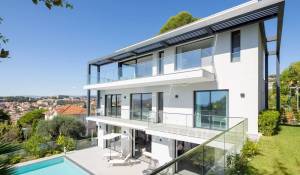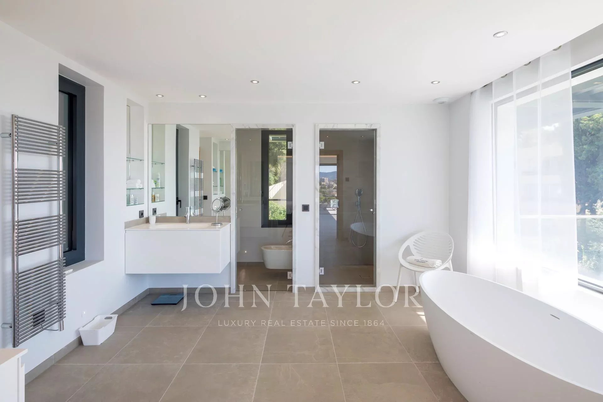 Новый современный дом площадью 450 м2 с кондиционером, расположенный на холмах недалеко от центра Канн, занимает территорию площадью 1 200 м2, с которой открываются виды на окружающие холмы и Ле Сюке.