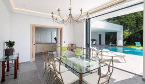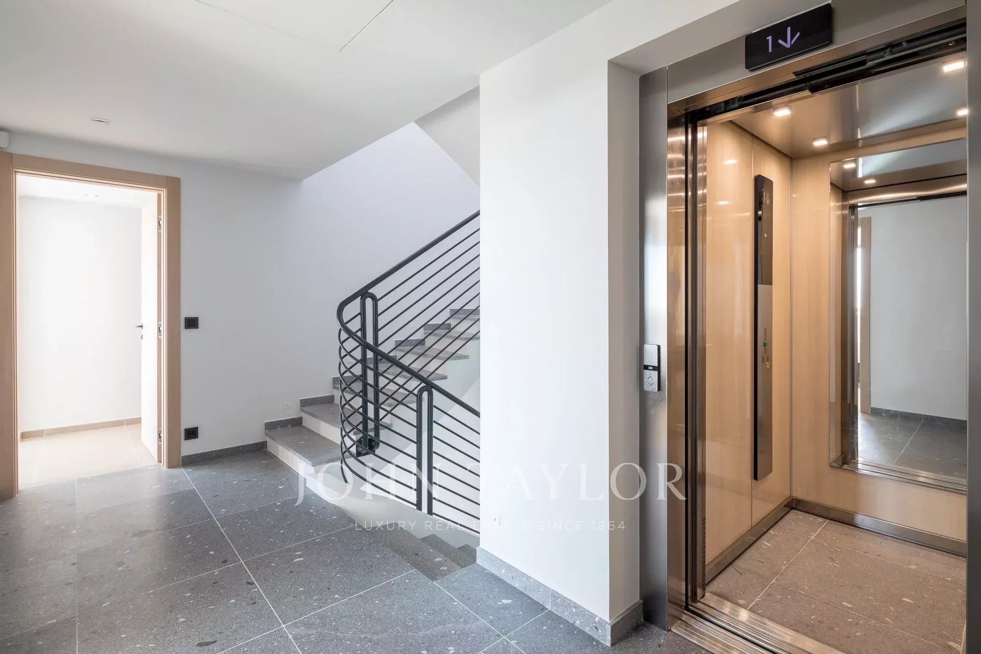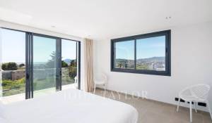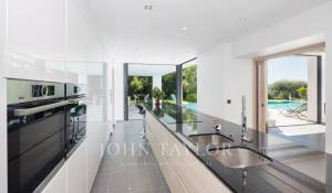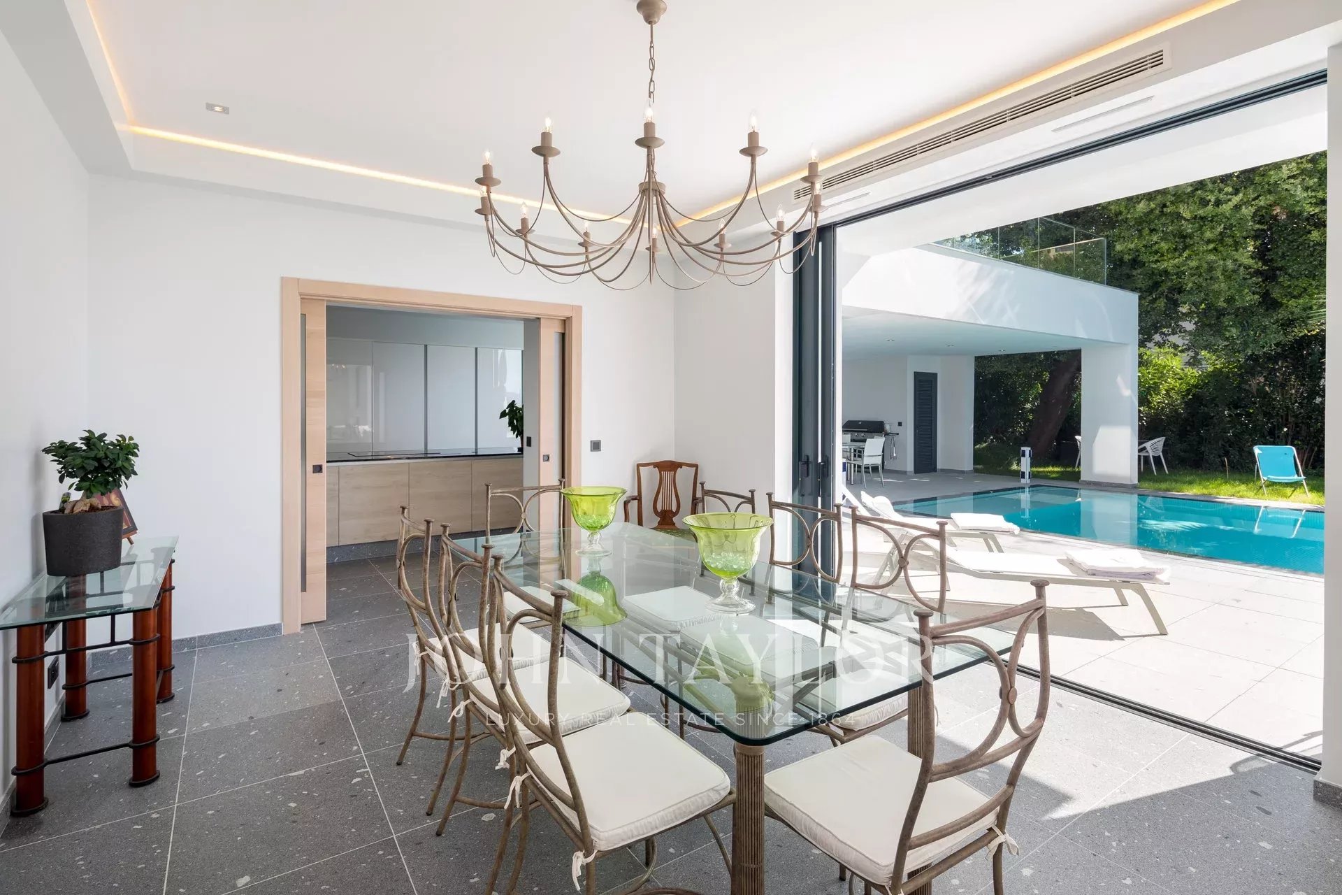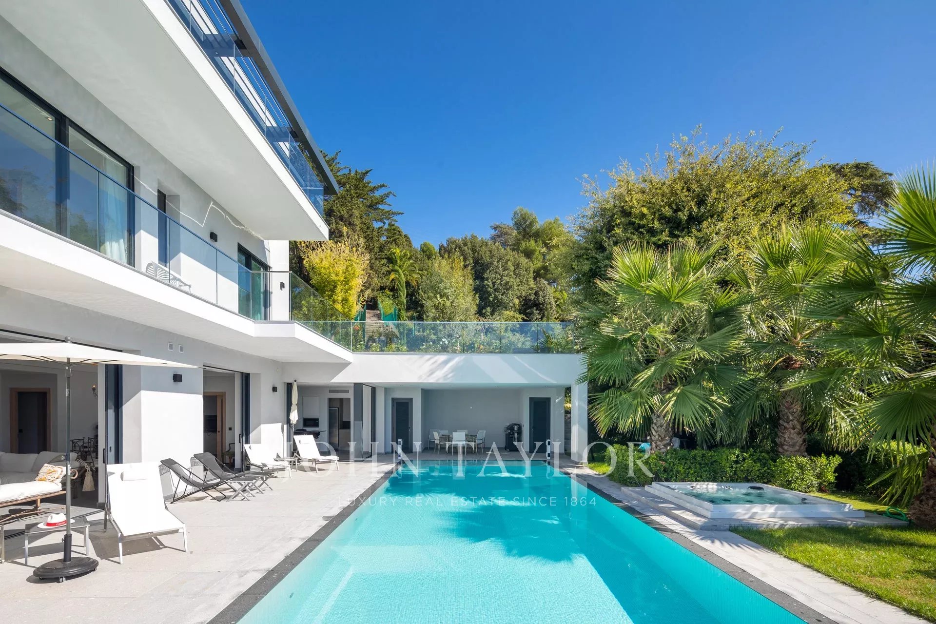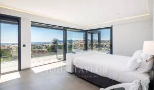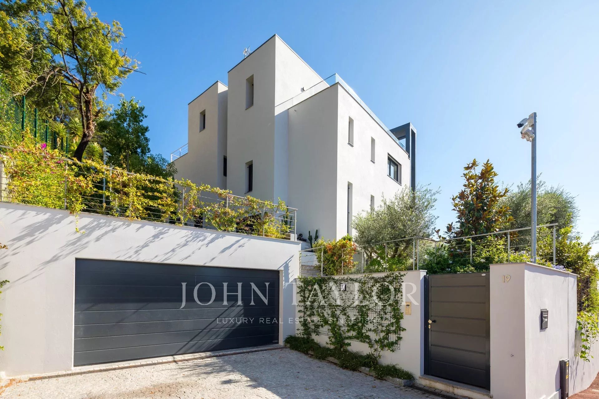 Новый современный дом площадью 450 м2 с кондиционером, расположенный на холмах недалеко от центра Канн, занимает территорию площадью 1 200 м2, с которой открываются виды на окружающие холмы и Ле Сюке.