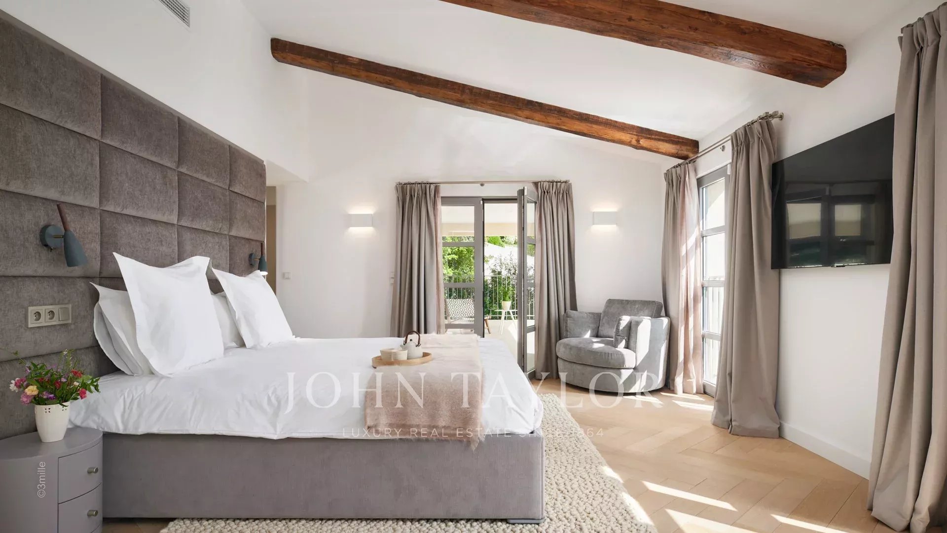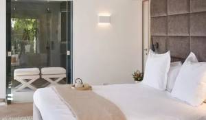 Спальня с двуспальной кроватью, ванной комнатой, душевой, туалетом и гардеробной, выходящая на террасу у бассейна.