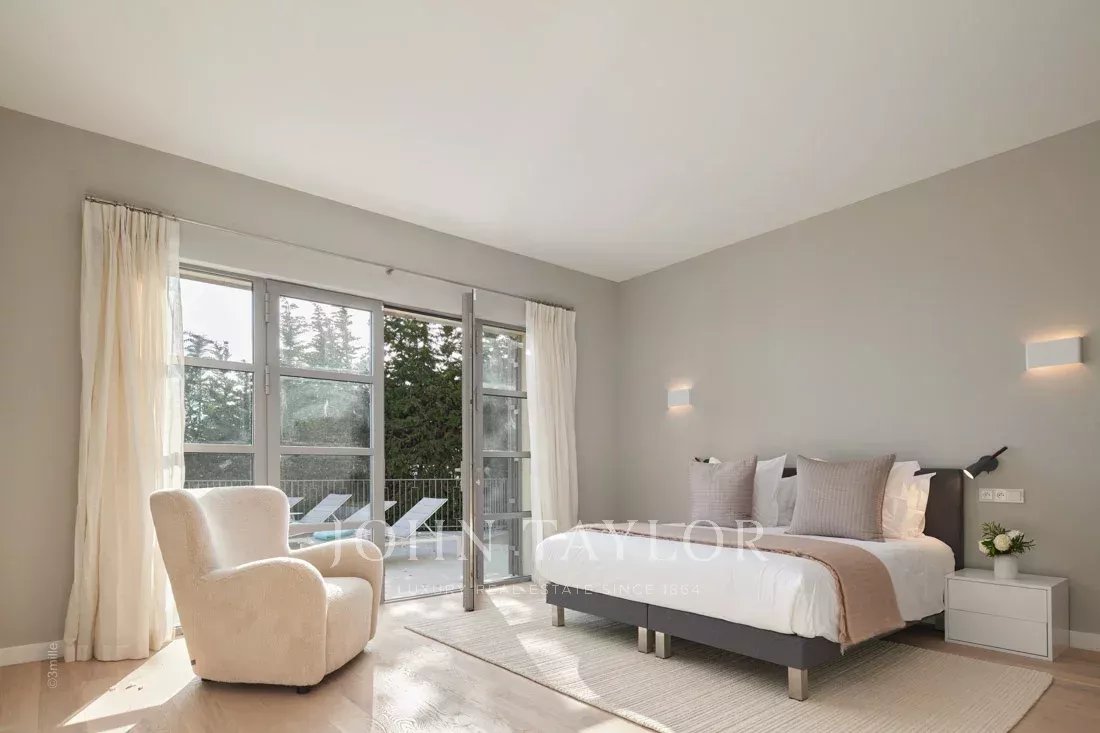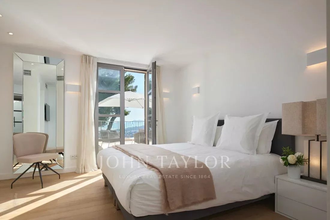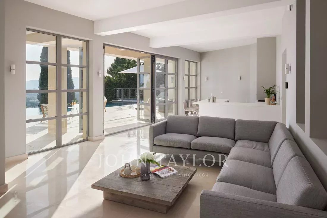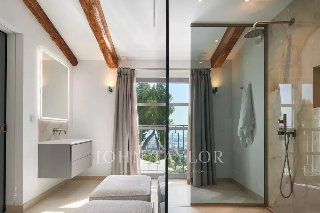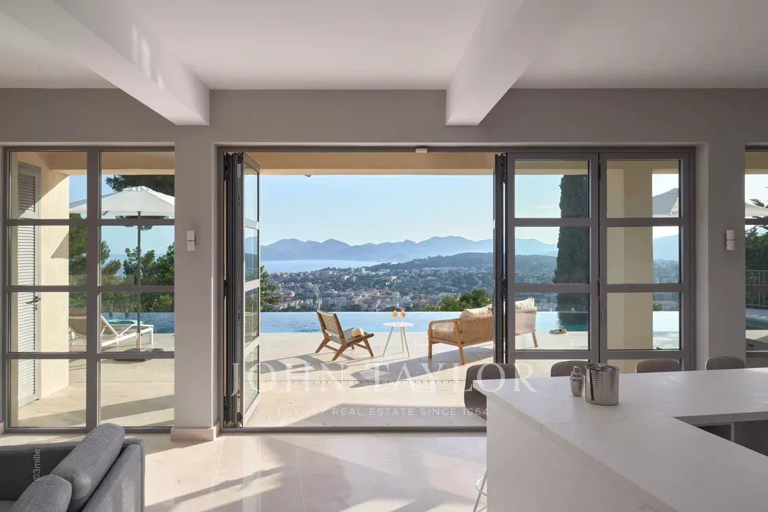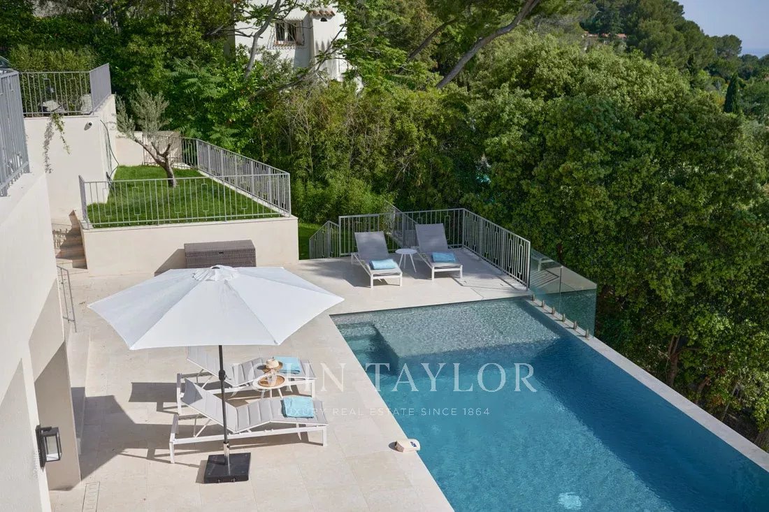 Эта красивая вилла, полностью отремонтированная по самым высоким стандартам, расположена на холмах над Каннами, занимает площадь около 340 м² и находится в ландшафтном саду площадью около 2 300 м² с бассейном. Из просторных гостиных открывается панорамный вид на Каннский залив, горы Эстерель и море.