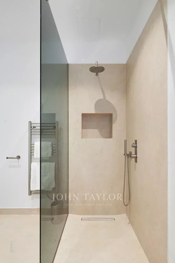 Уровень сада: спальня с двуспальной кроватью, ванной комнатой с душем, туалетом и гардеробной с выходом в сад.