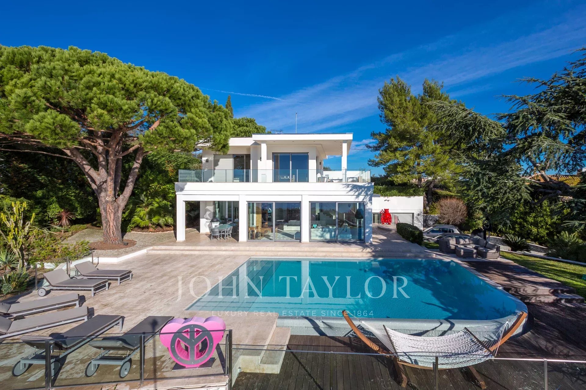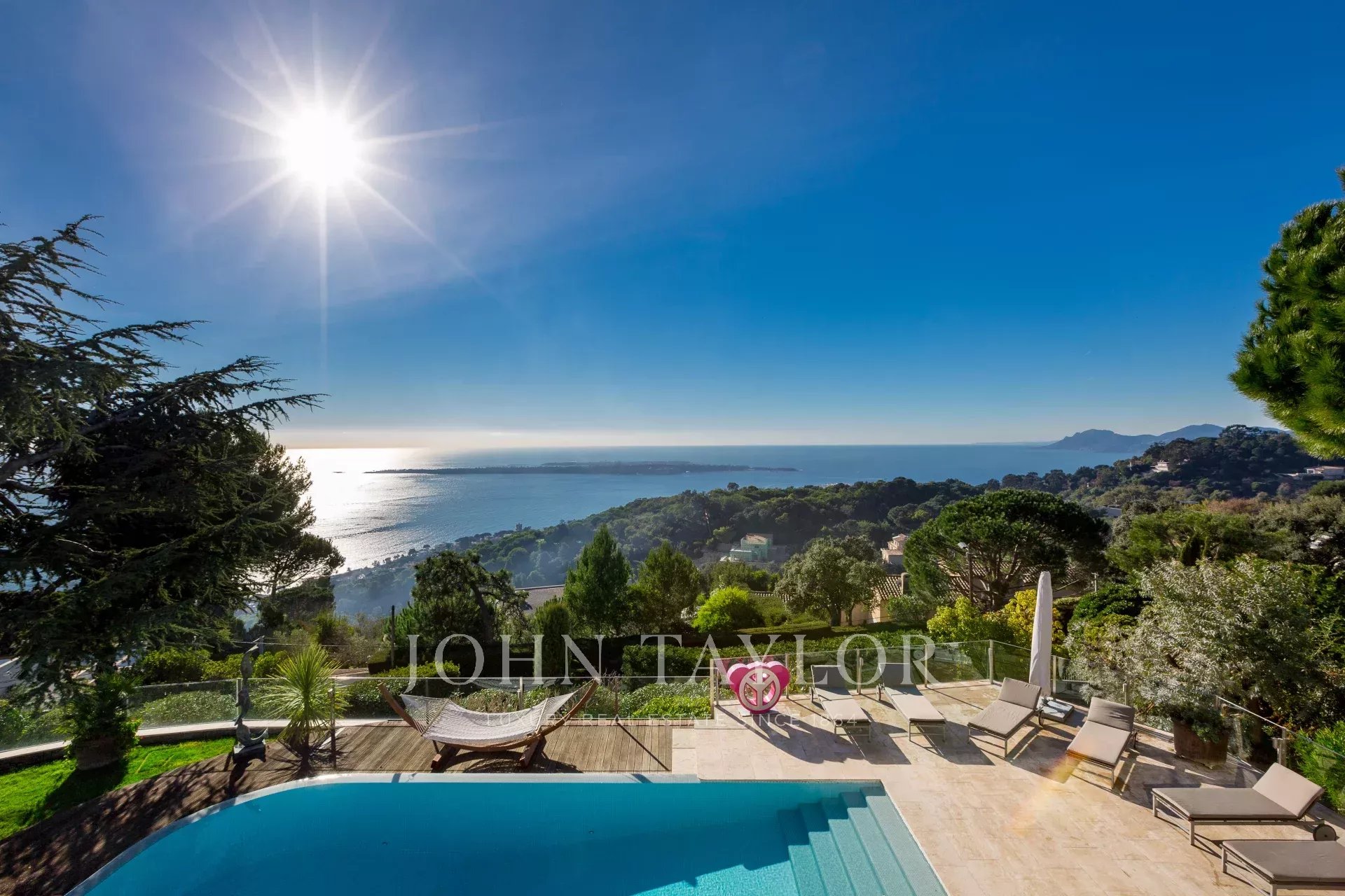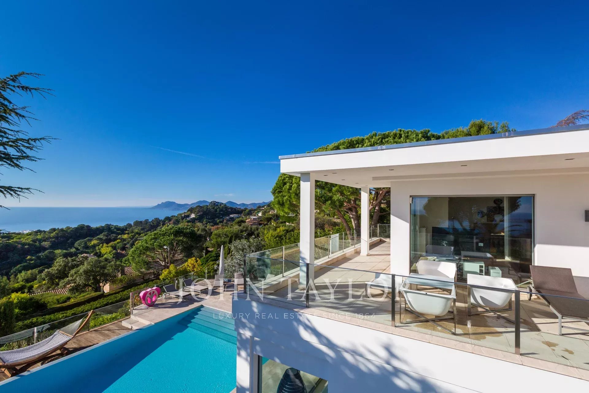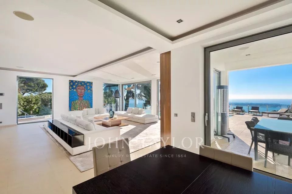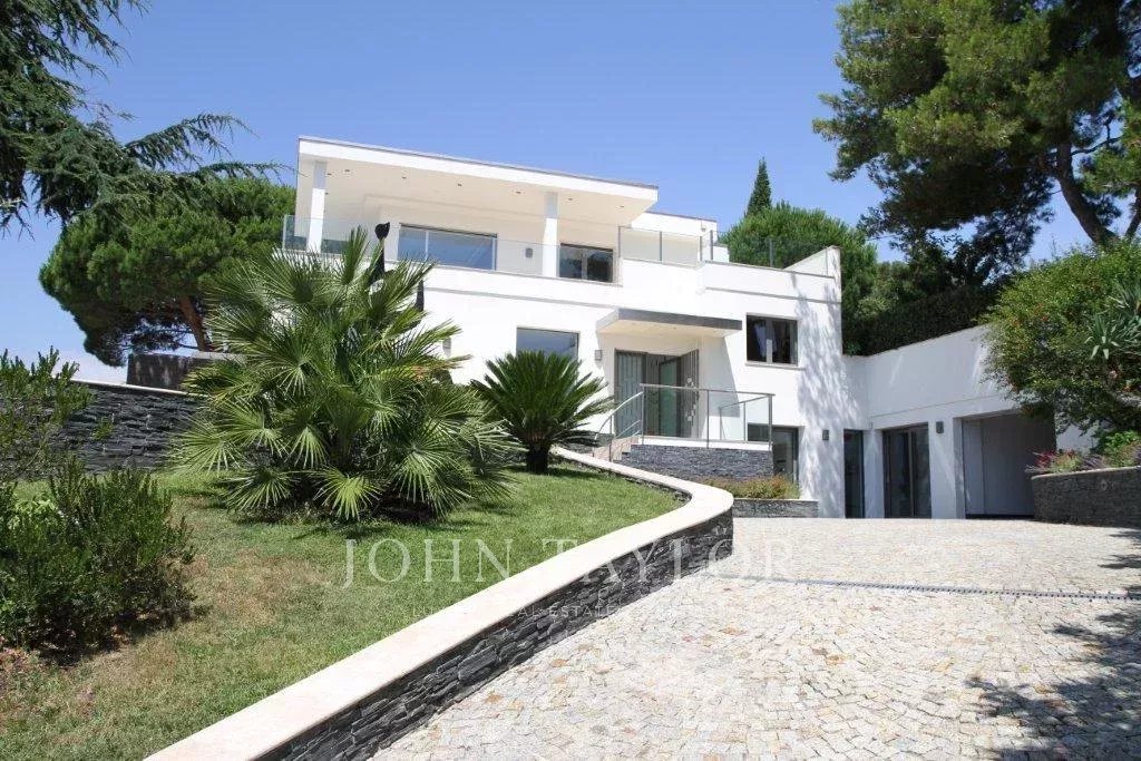 На склонах Канн, расположена красивая современная вилла с панорамным видом на море, Леринские острова, Кап д'Антиб и горный массив Эстерель. Общая жилая площадь 300 кв.м, красивый сад 2000 кв.м.