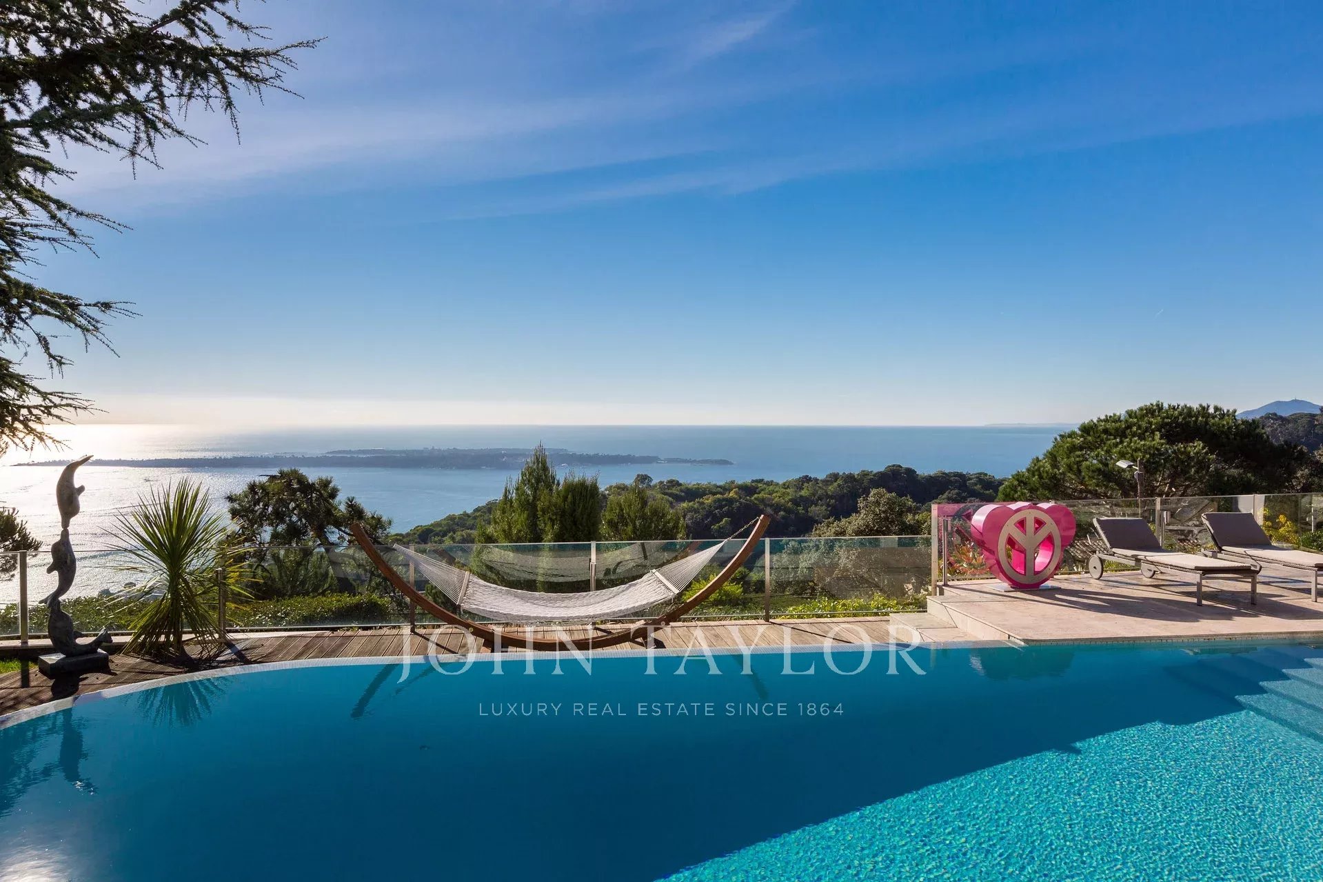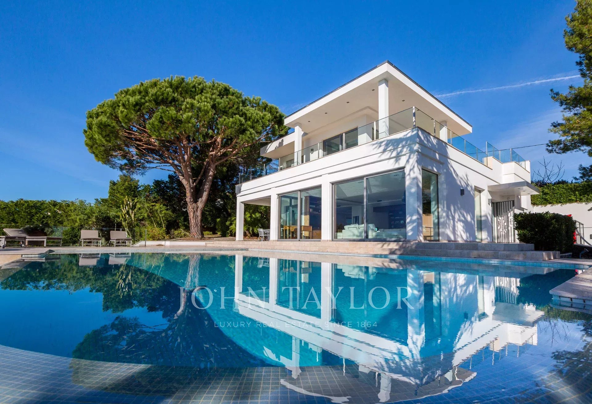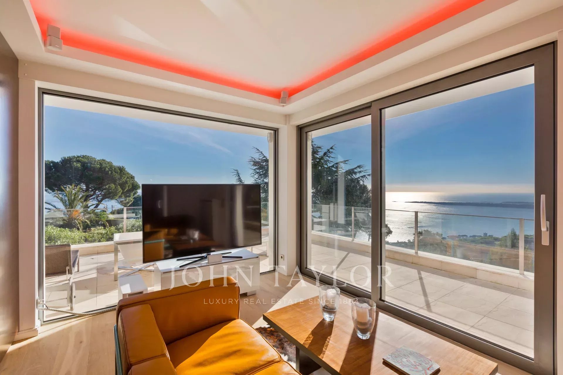 На склонах Канн, расположена красивая современная вилла с панорамным видом на море, Леринские острова, Кап д'Антиб и горный массив Эстерель. Общая жилая площадь 300 кв.м, красивый сад 2000 кв.м.