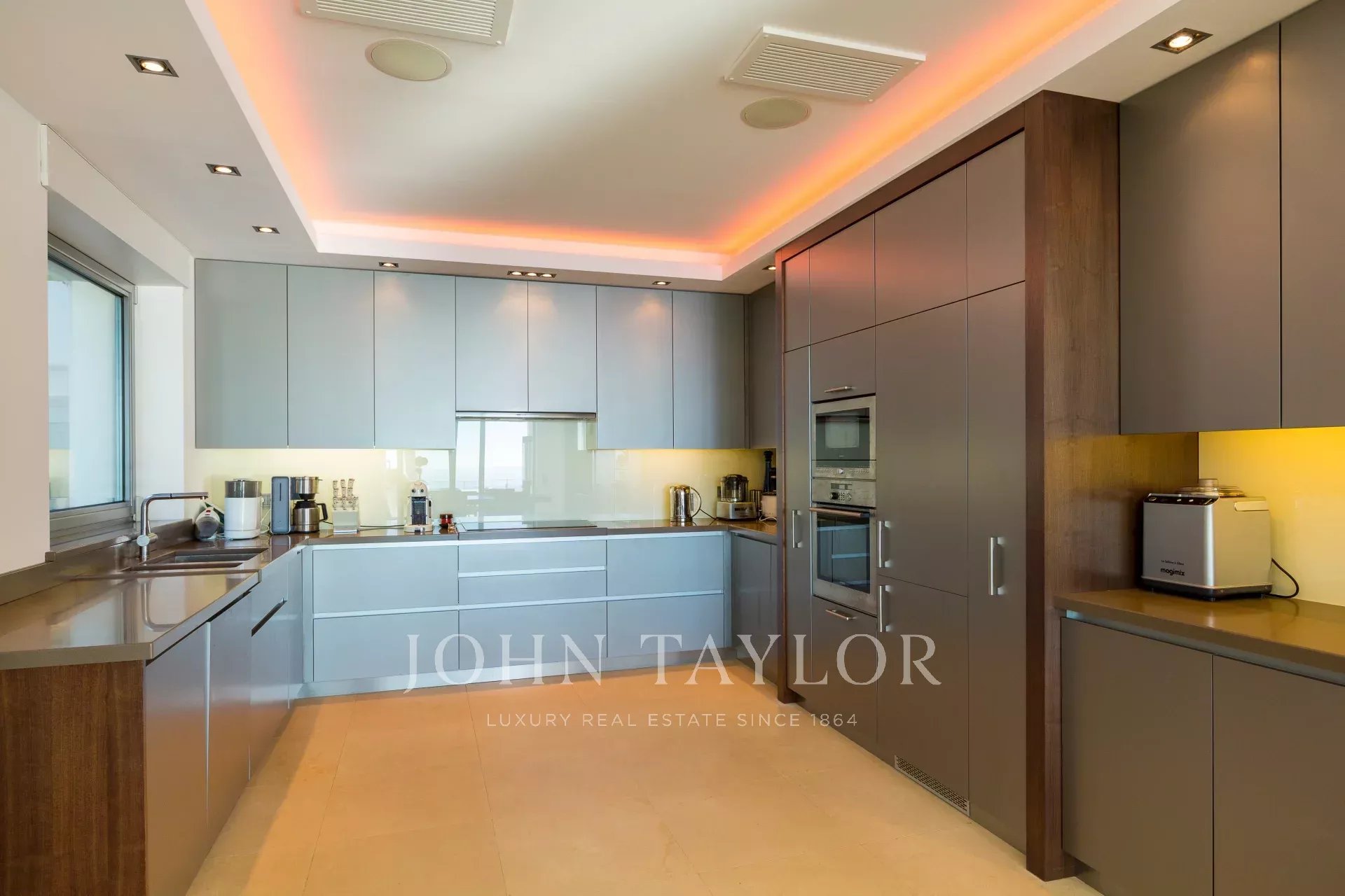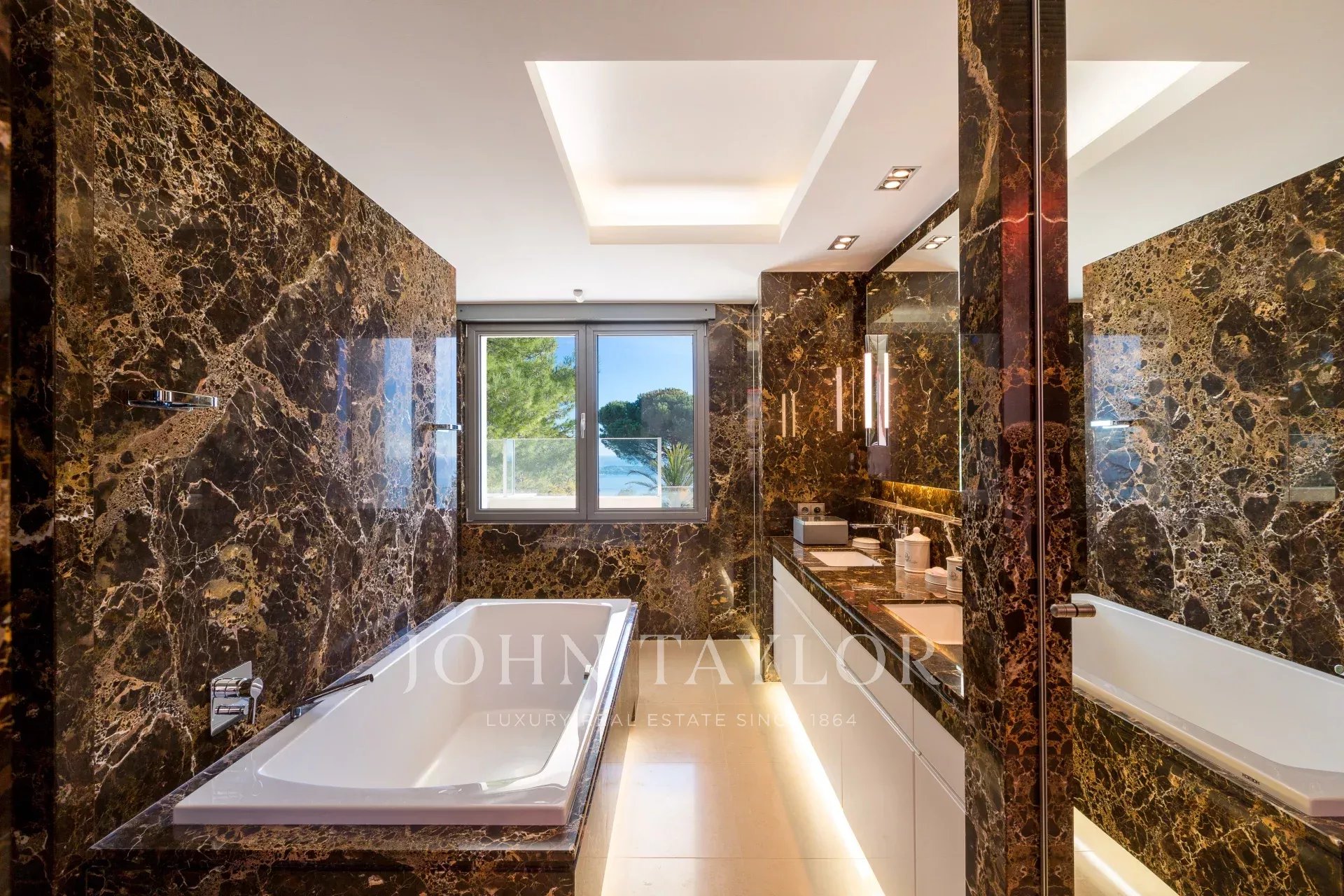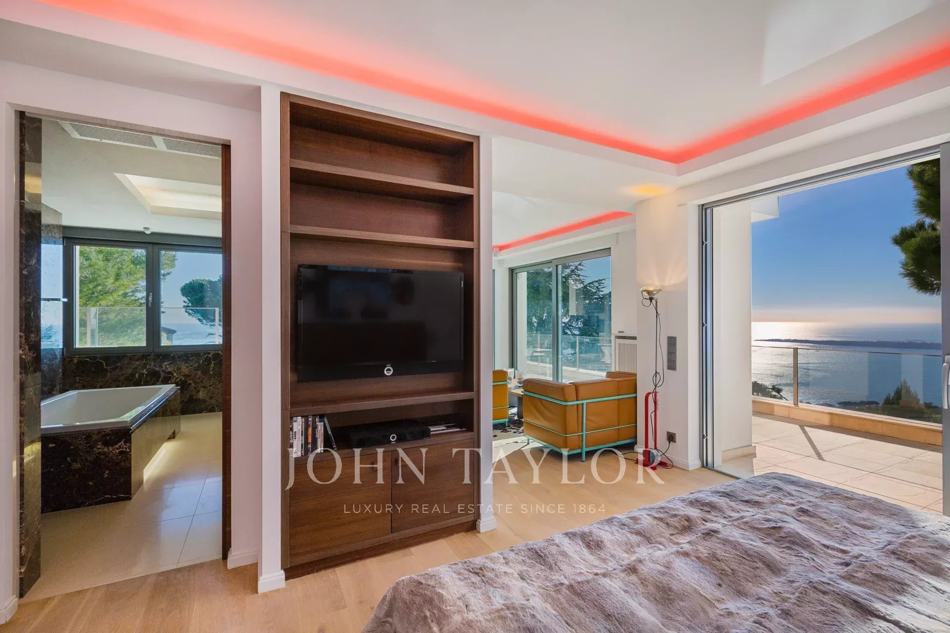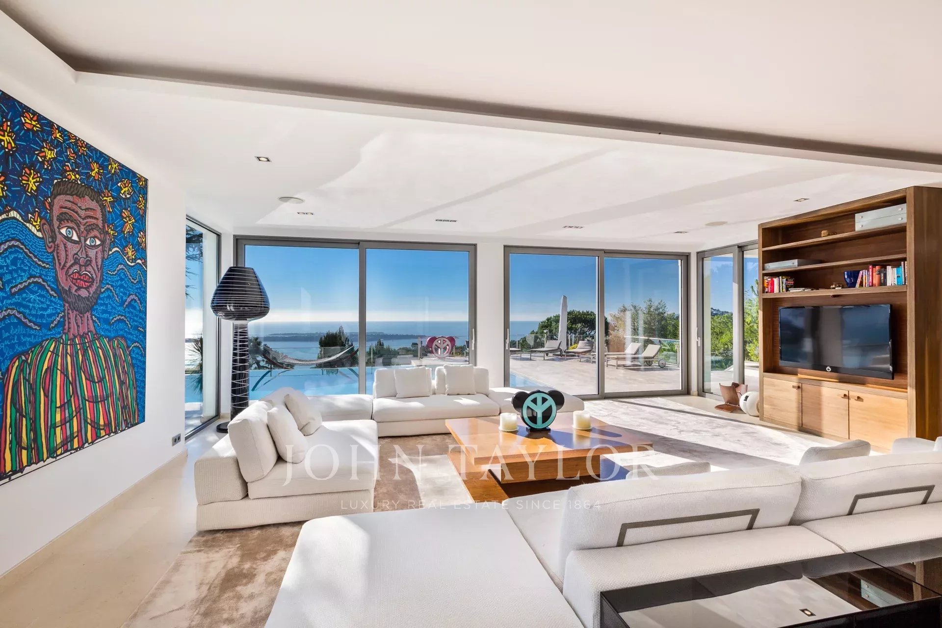 На склонах Канн, расположена красивая современная вилла с панорамным видом на море, Леринские острова, Кап д'Антиб и горный массив Эстерель. Общая жилая площадь 300 кв.м, красивый сад 2000 кв.м.