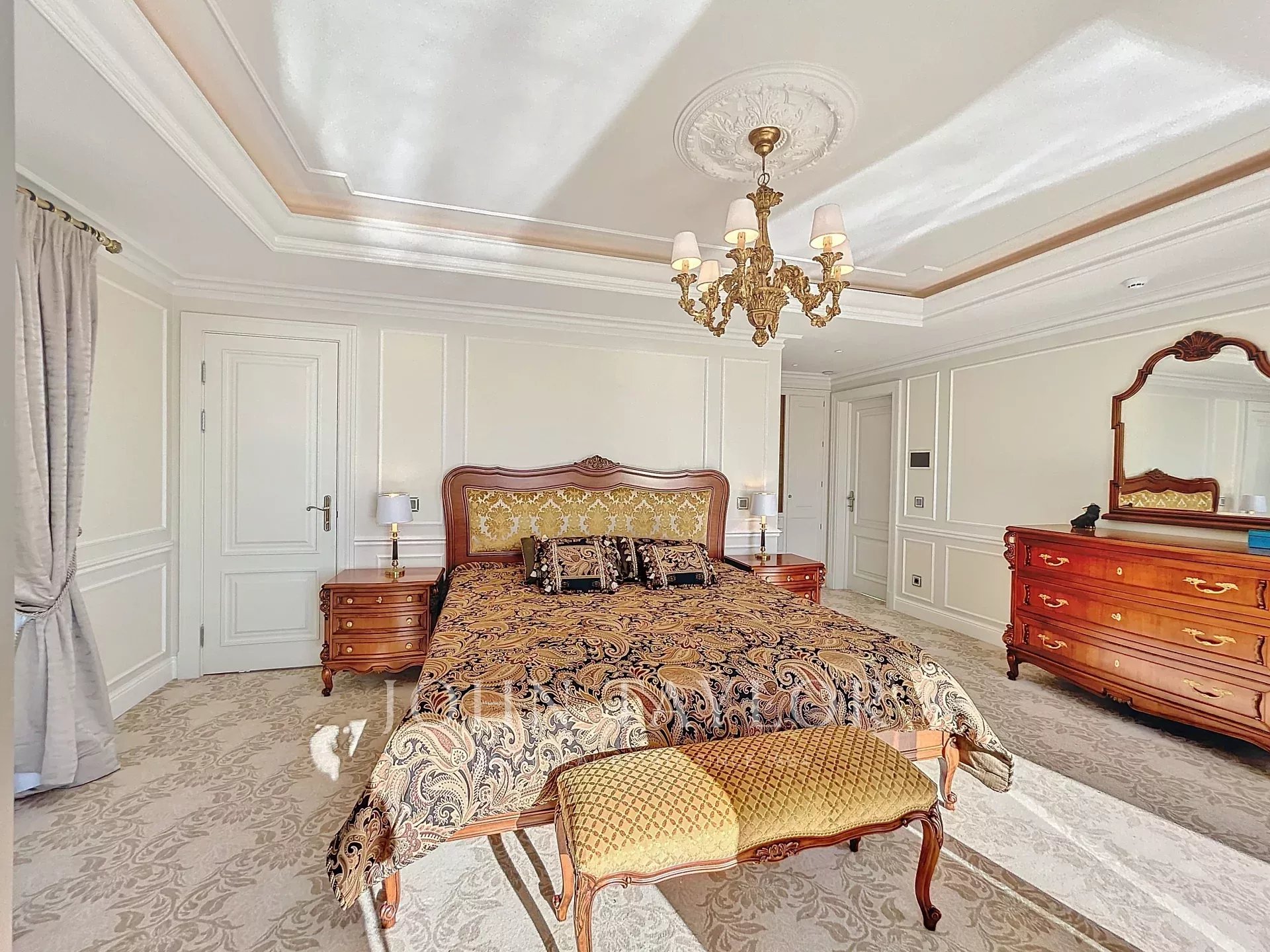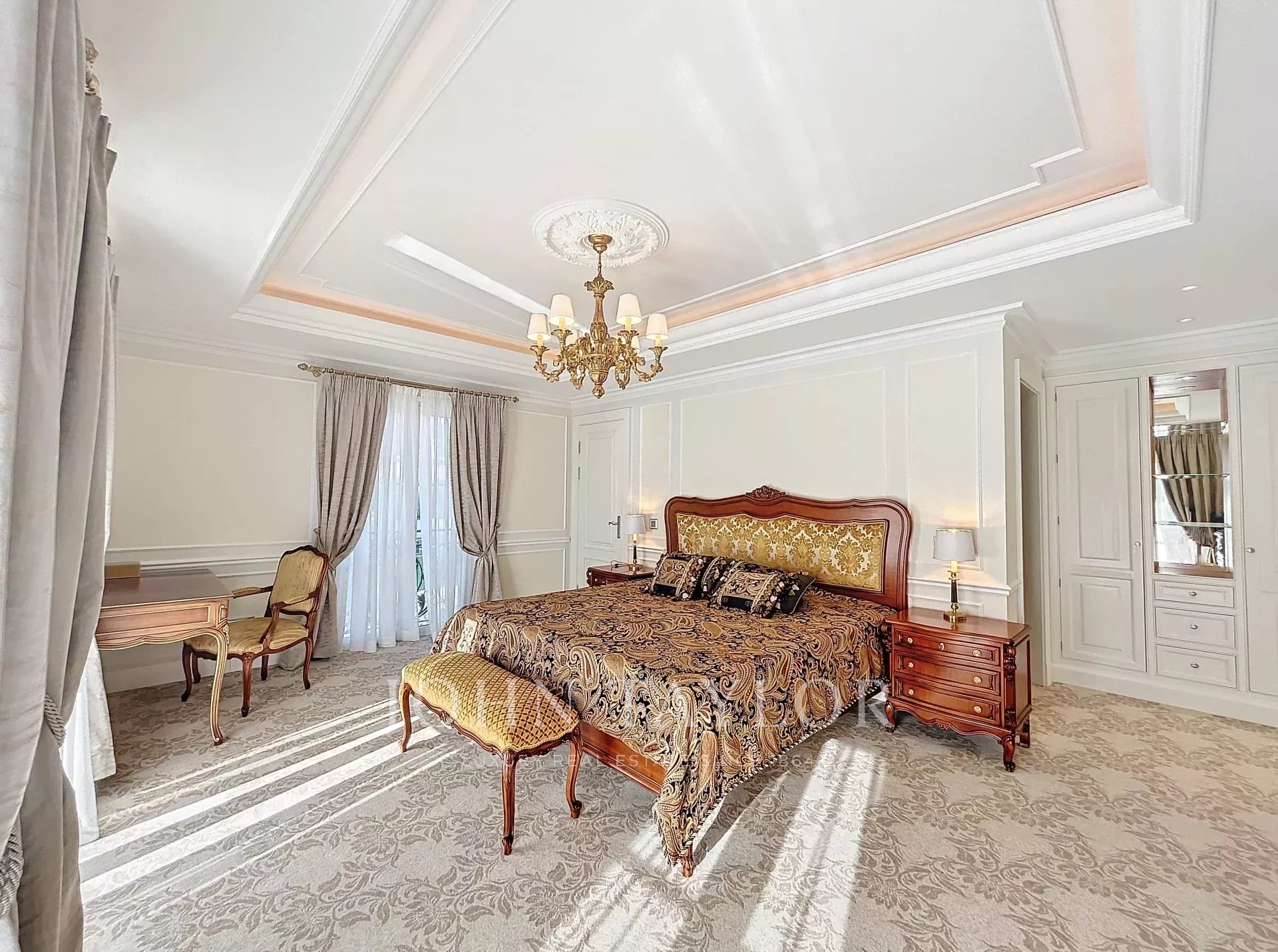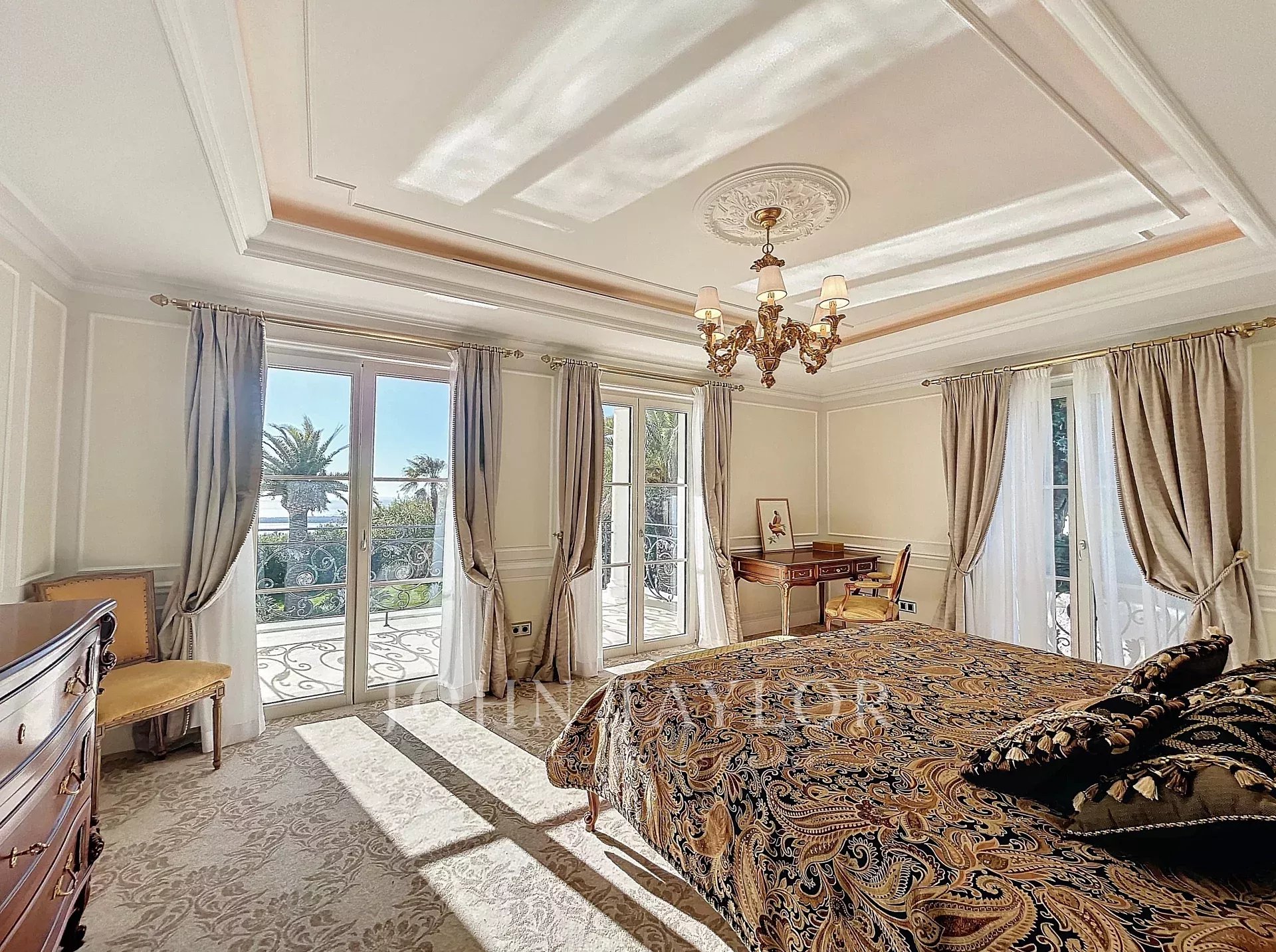 Главная спальня с выходом на террасу с видом на Леринские острова, гардеробной и собственной душевой комнатой.