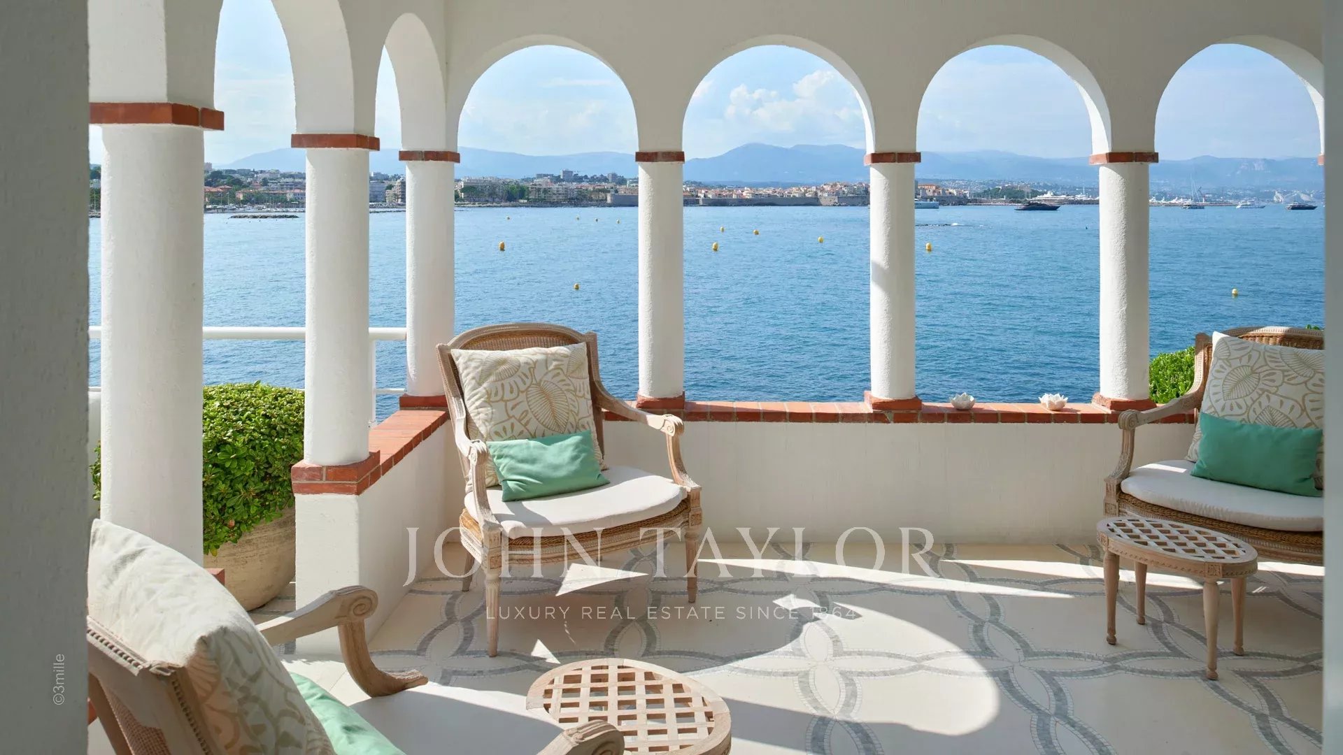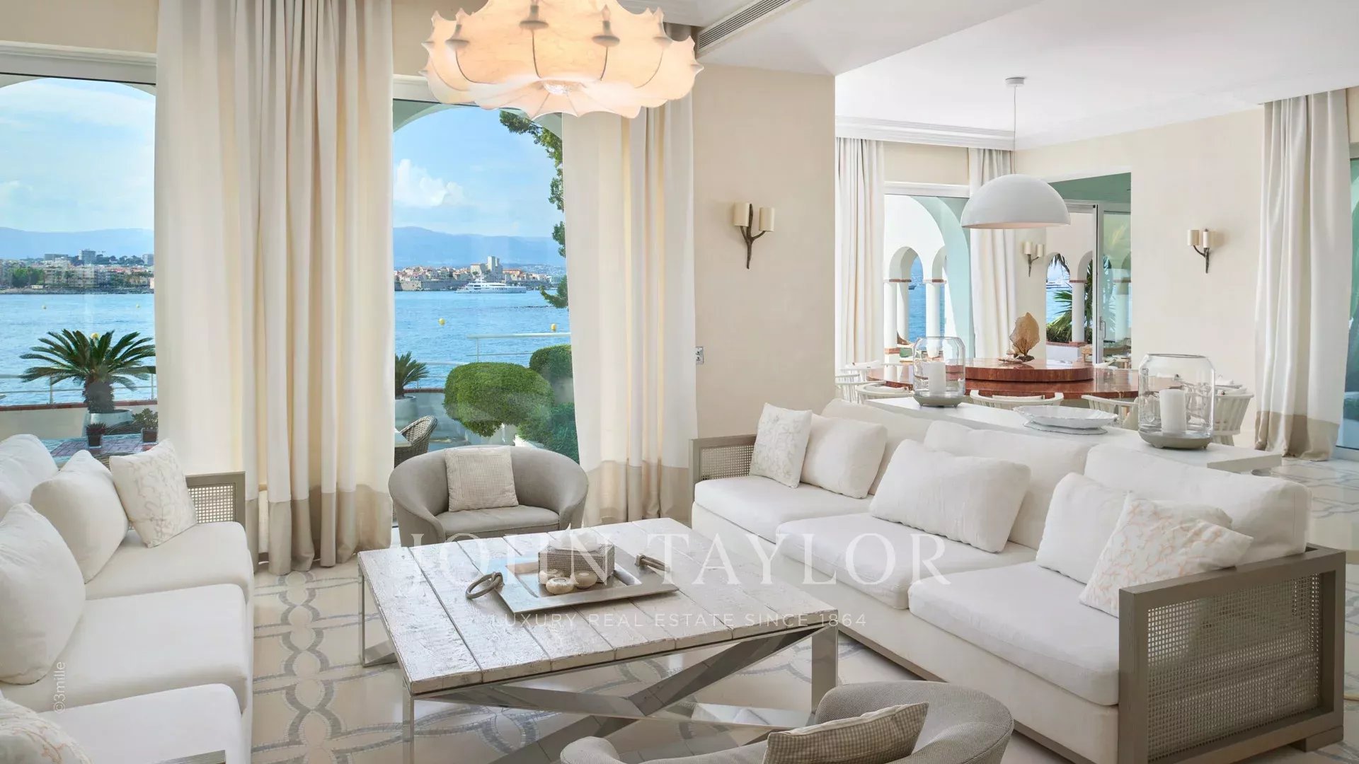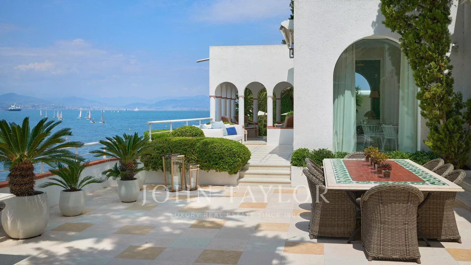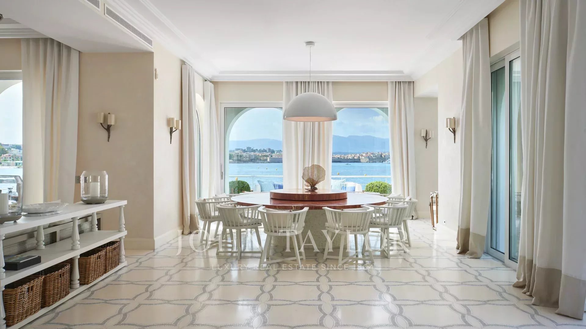 Вход ведет в просторную приемную, выходящую на великолепную террасу с видом на море и старый Антиб, состоящую из гостиной и столовой на 12 персон.