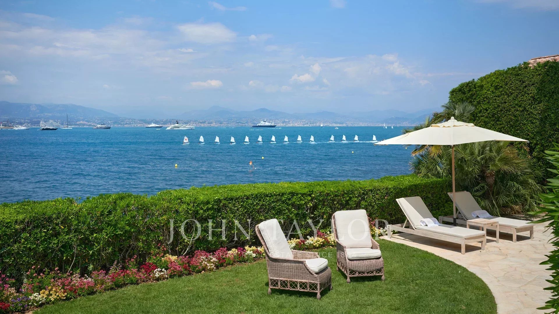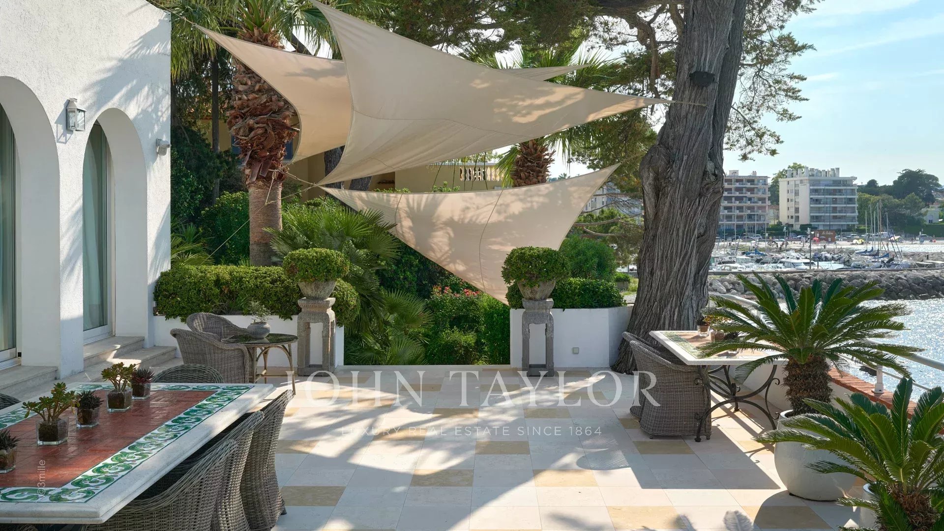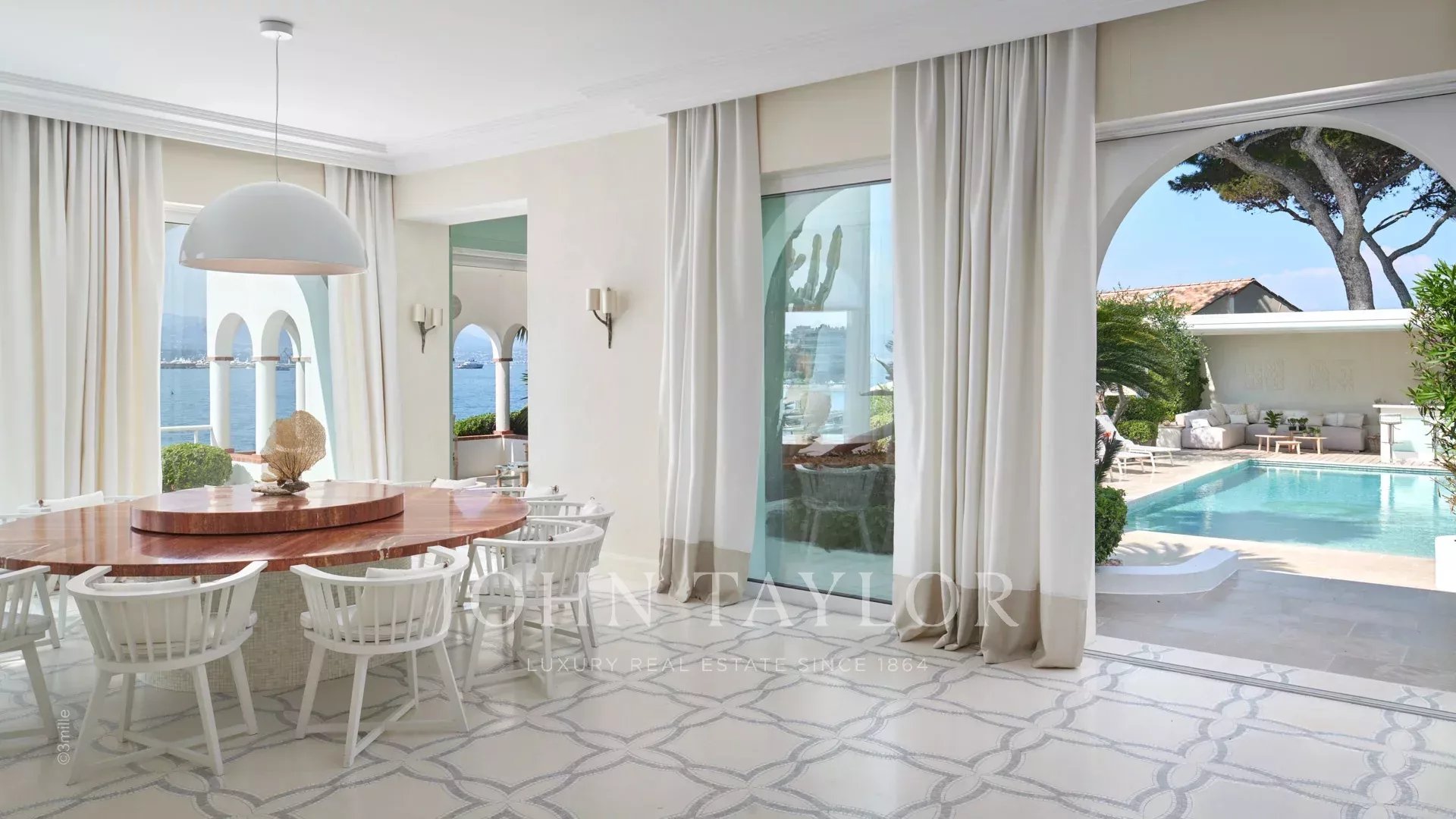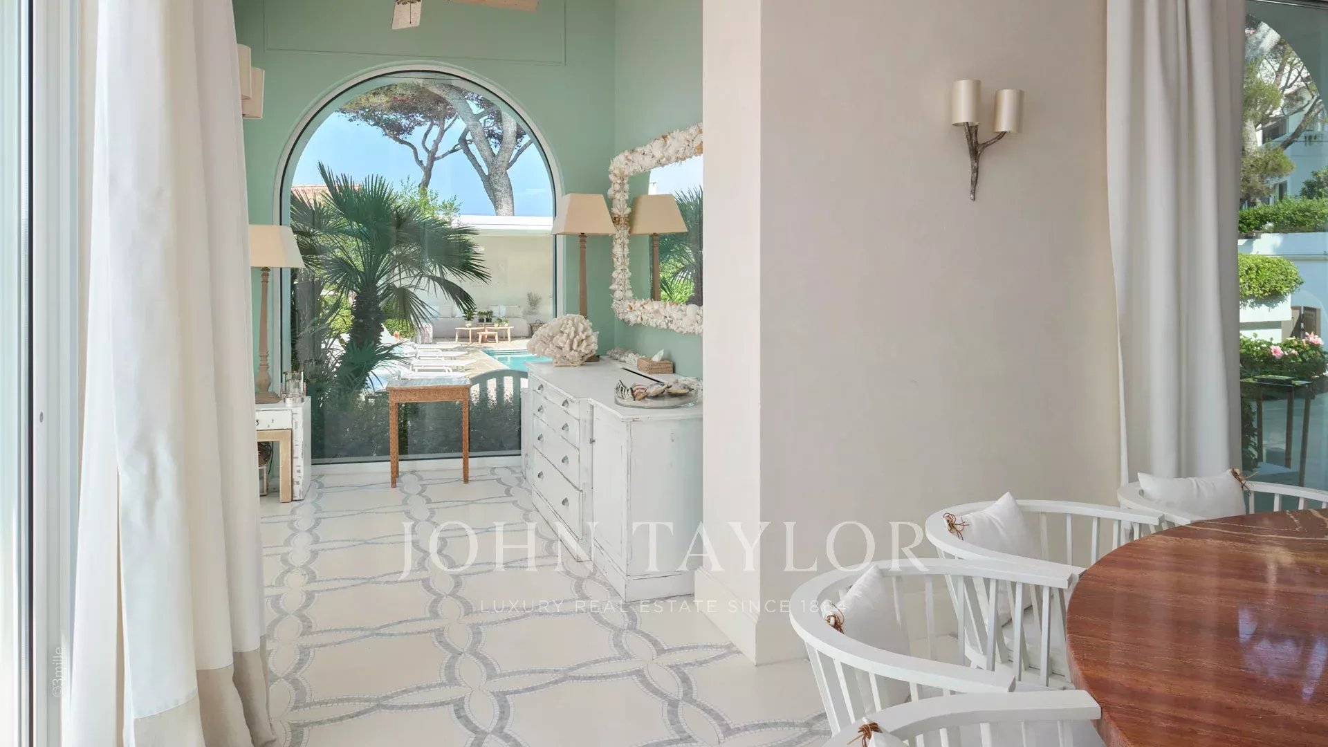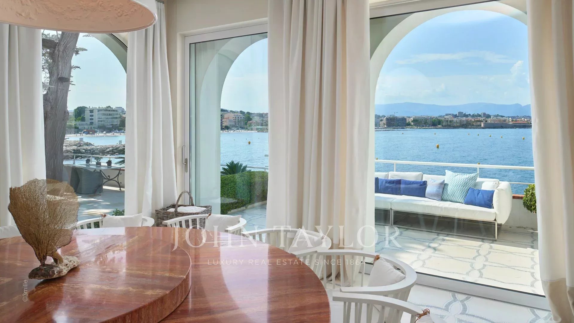 Вход ведет в просторную приемную, выходящую на великолепную террасу с видом на море и старый Антиб, состоящую из гостиной и столовой на 12 персон.