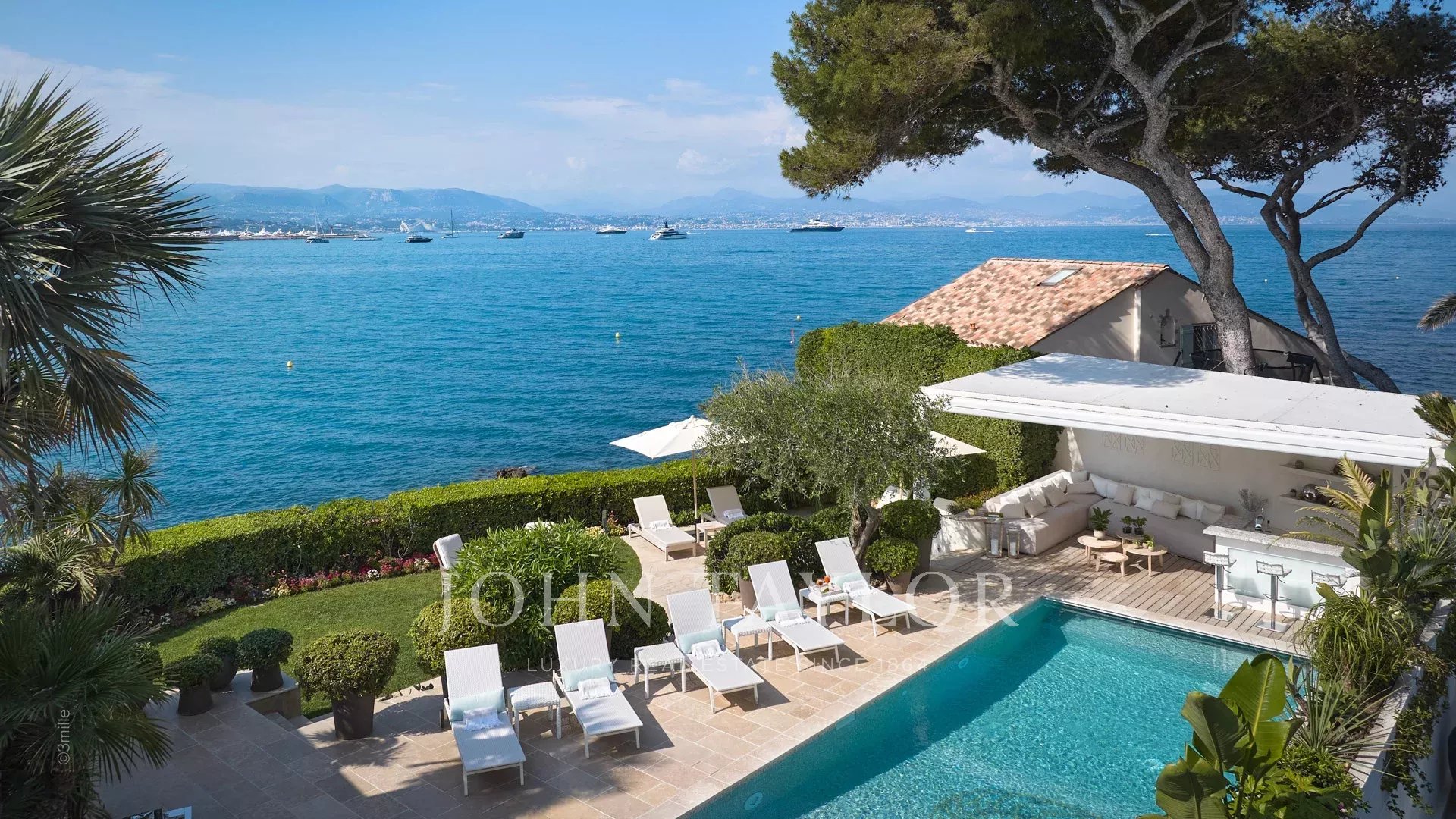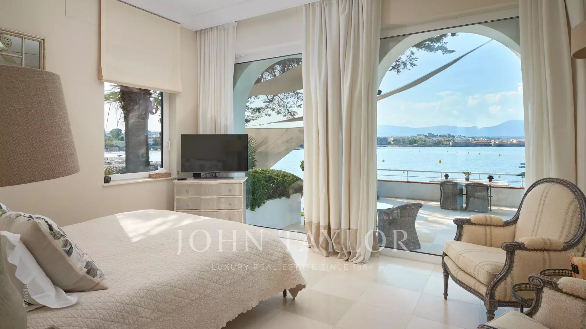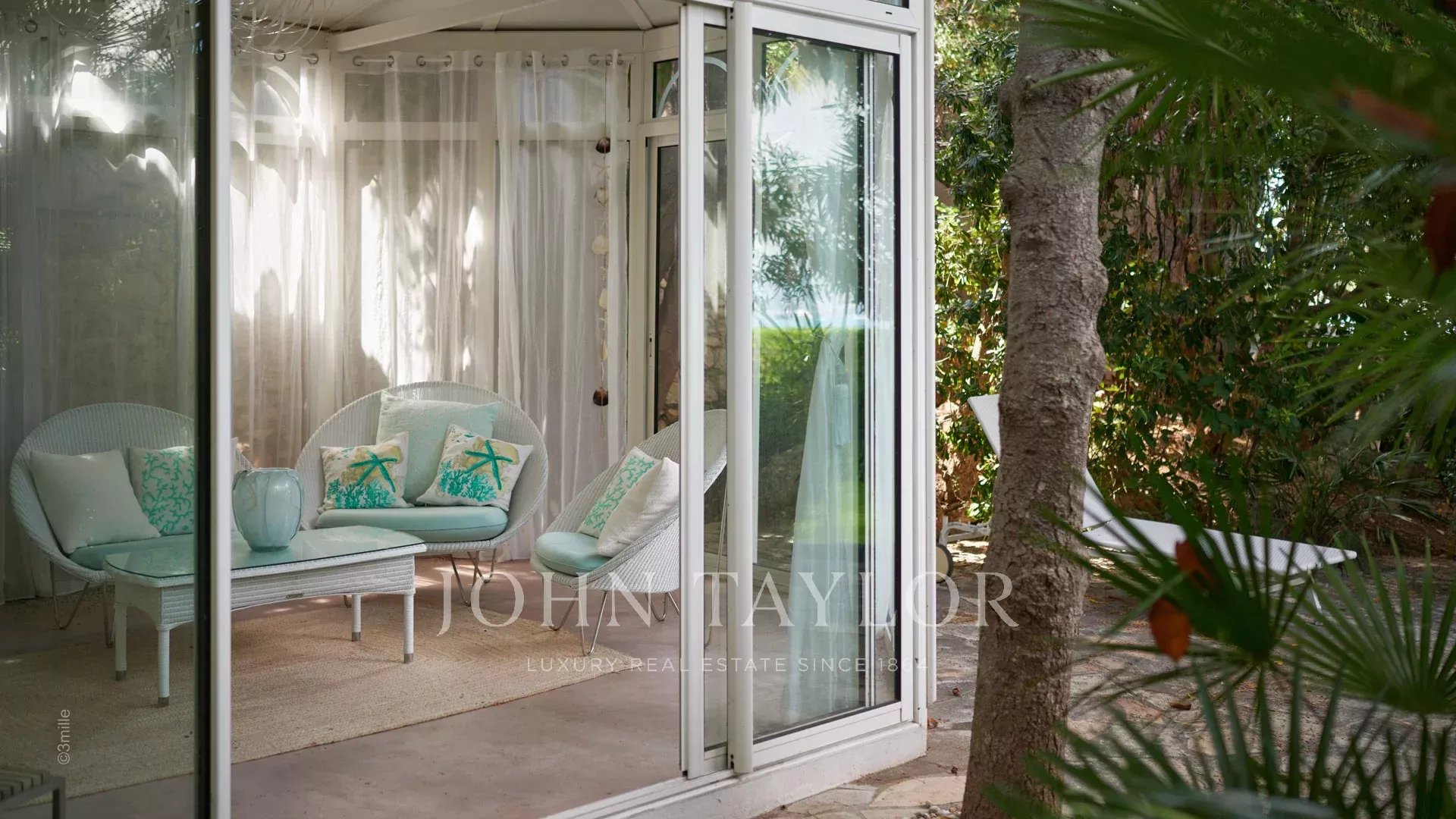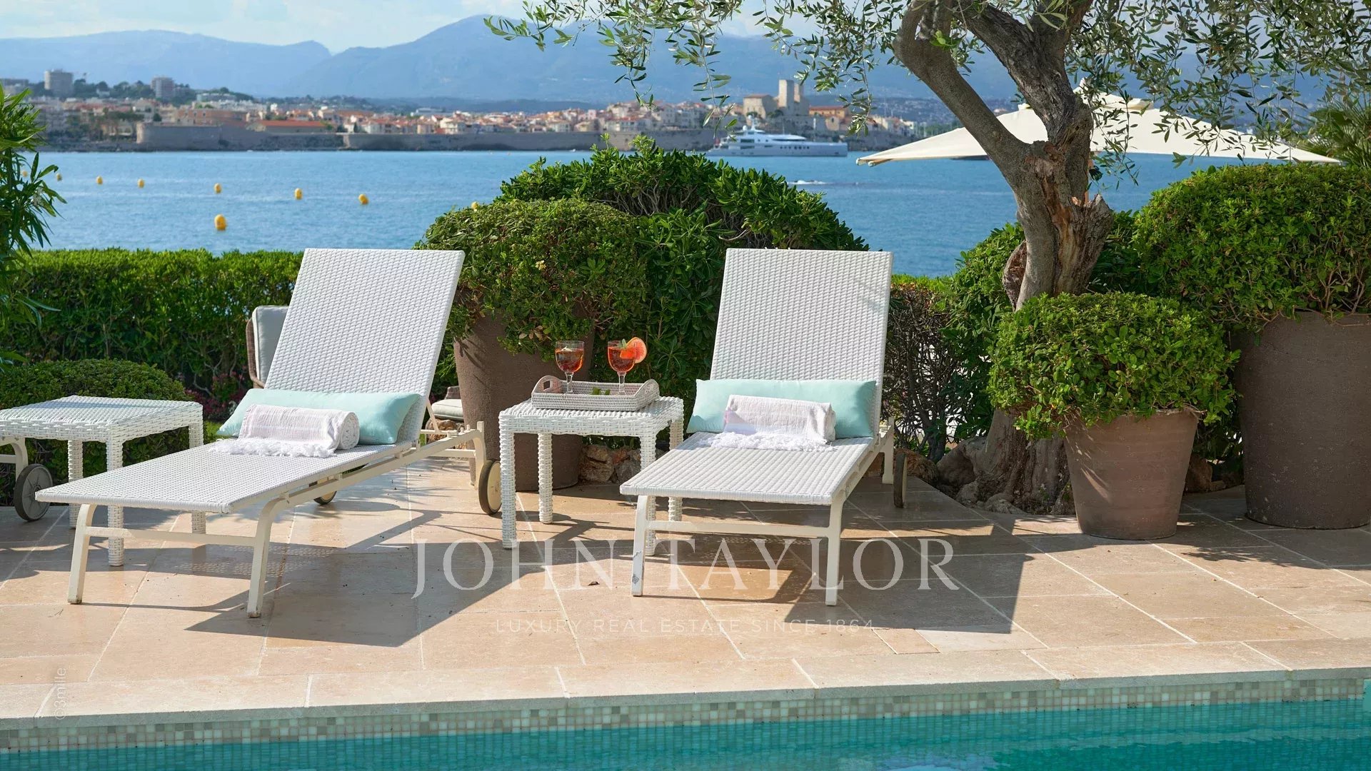 Вход ведет в просторную приемную, выходящую на великолепную террасу с видом на море и старый Антиб, состоящую из гостиной и столовой на 12 персон.