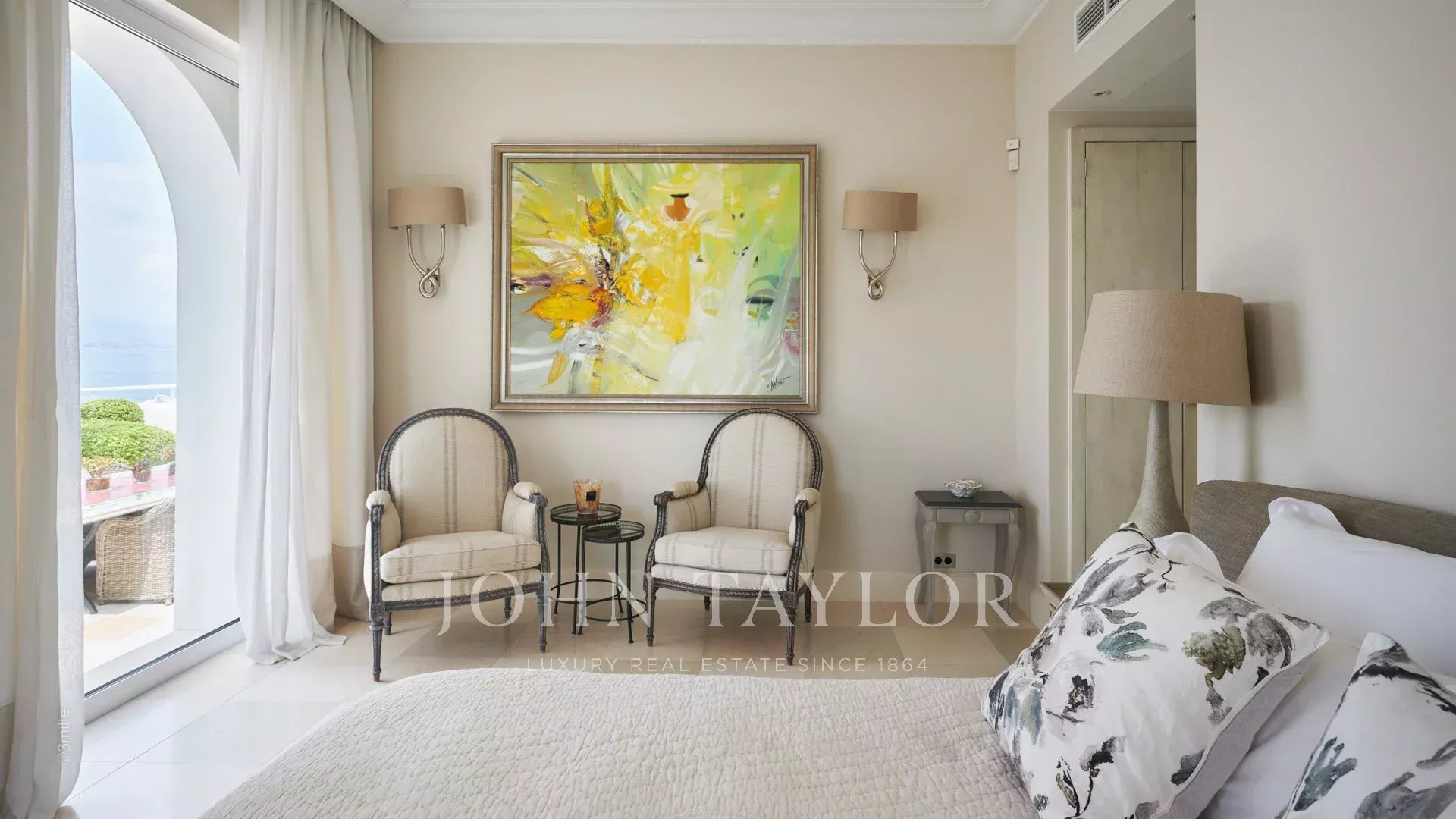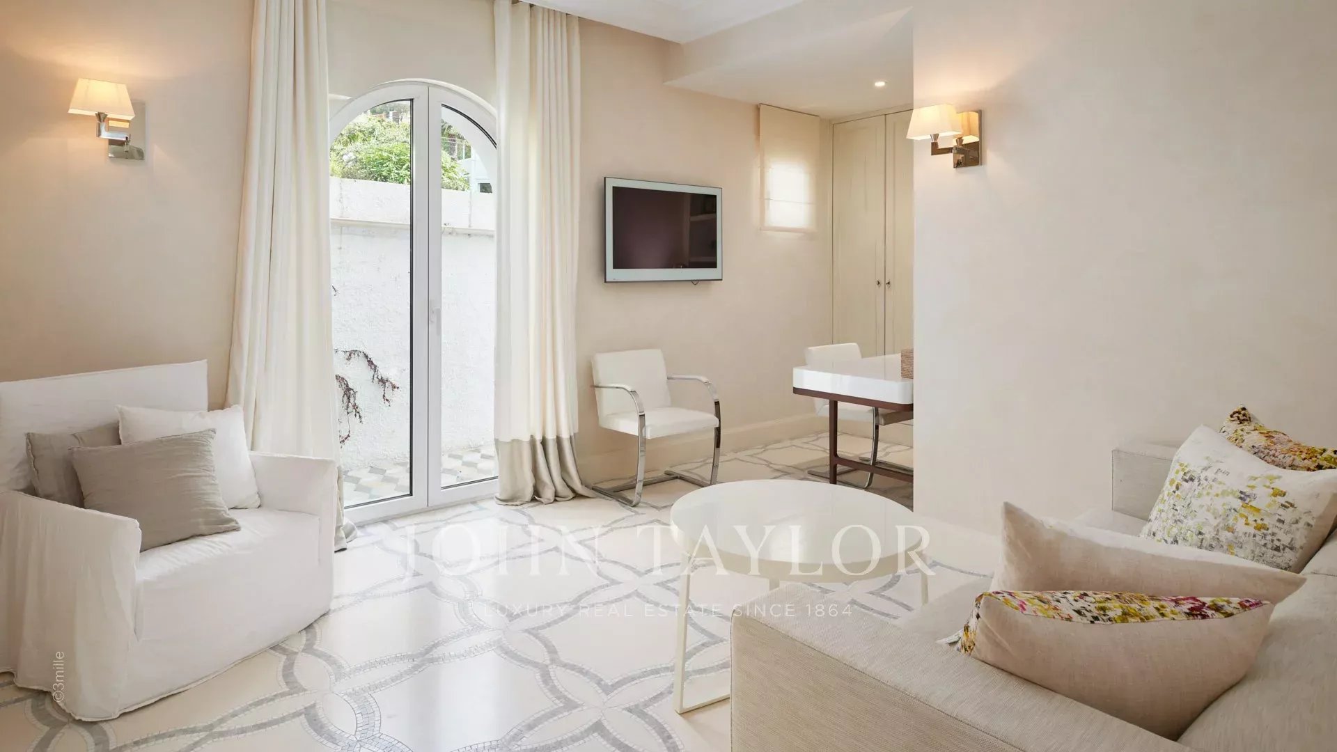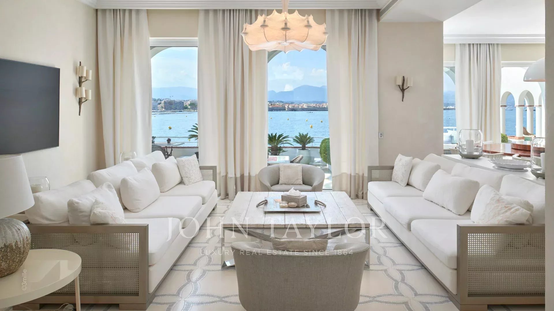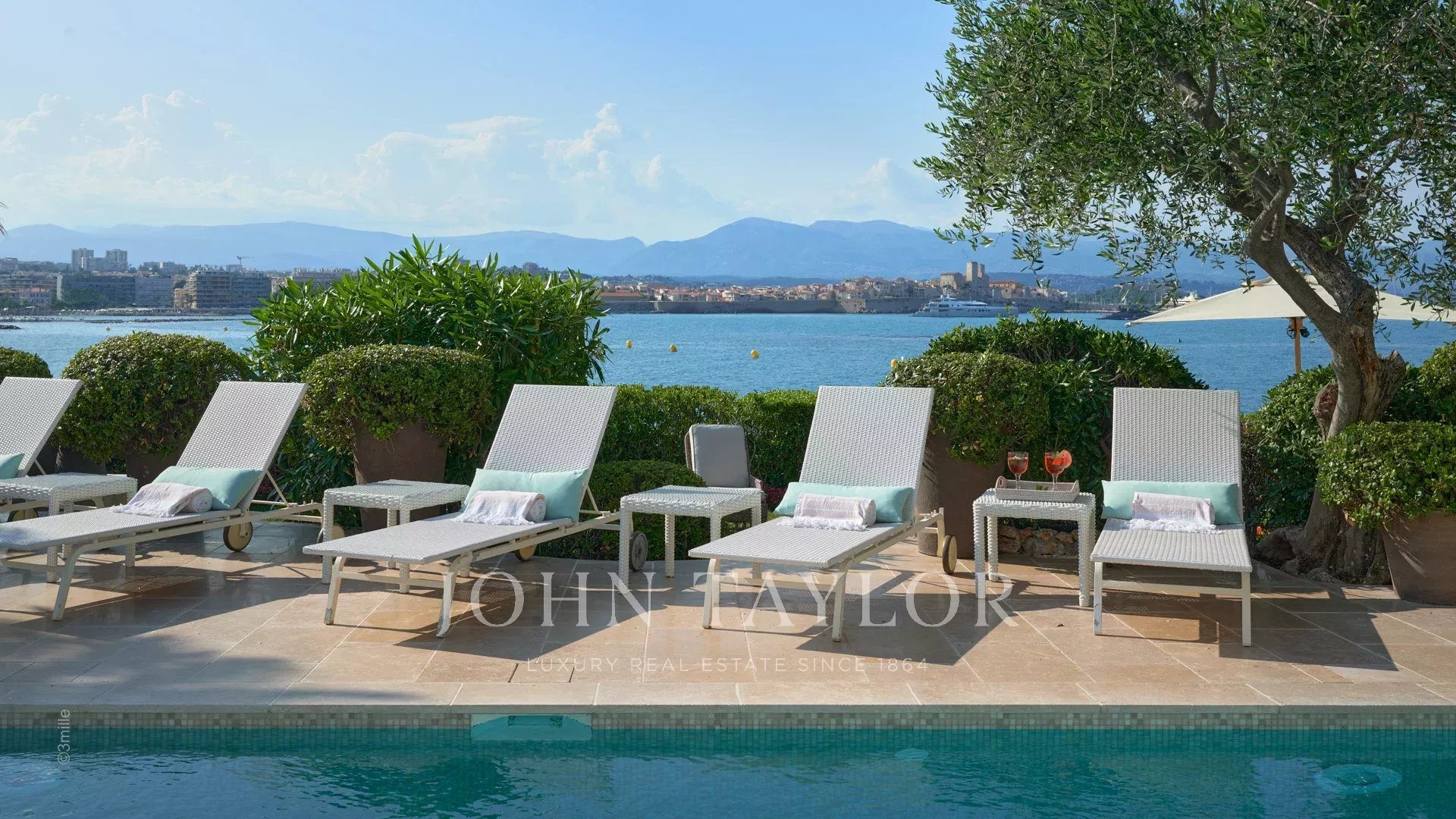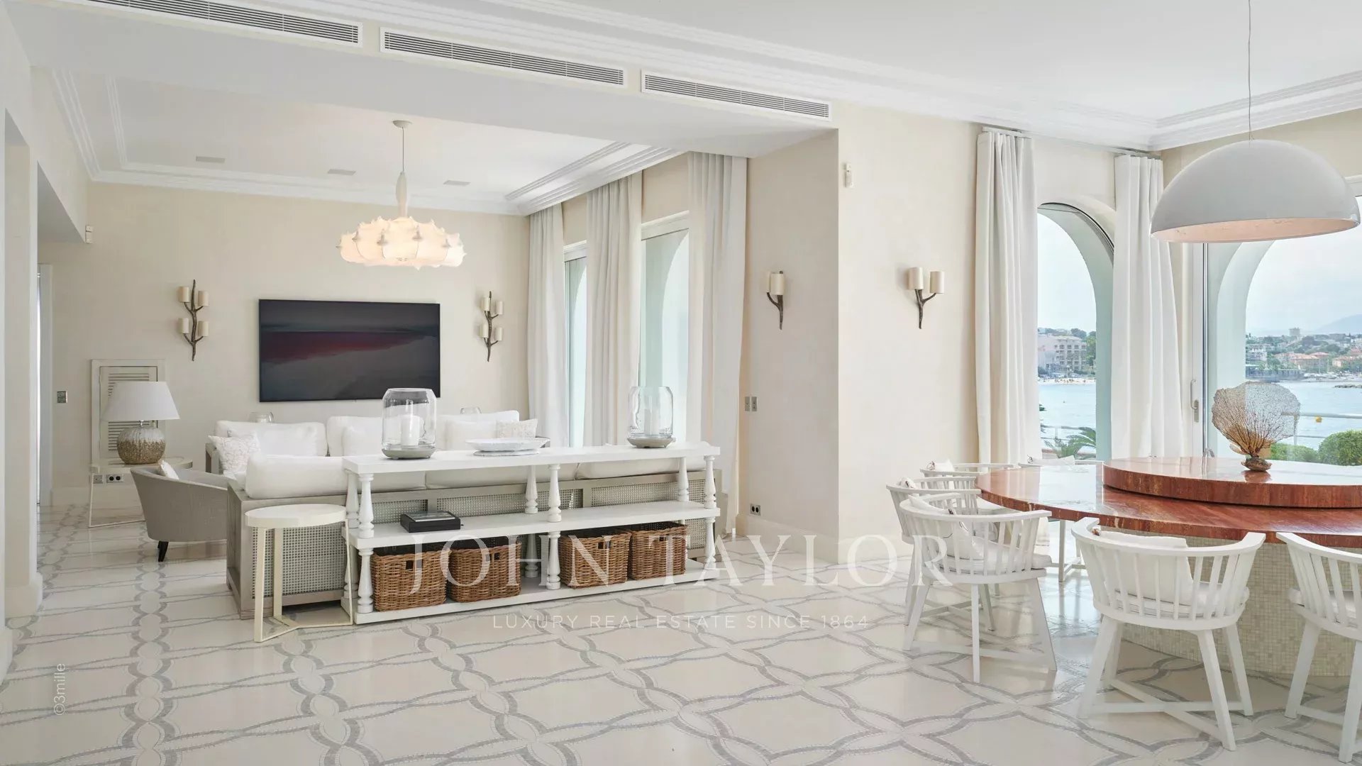 Вход ведет в просторную приемную, выходящую на великолепную террасу с видом на море и старый Антиб, состоящую из гостиной и столовой на 12 персон.