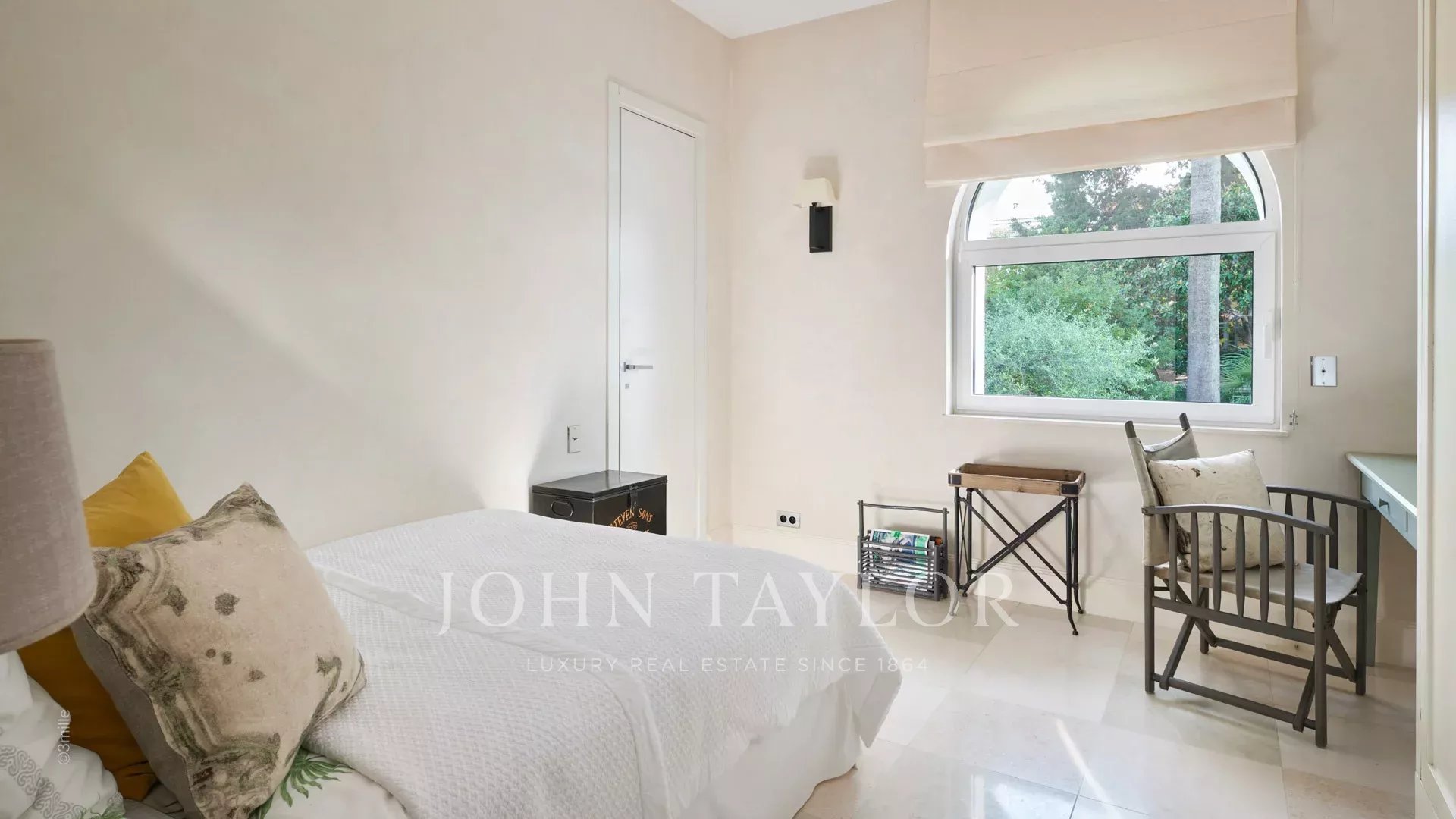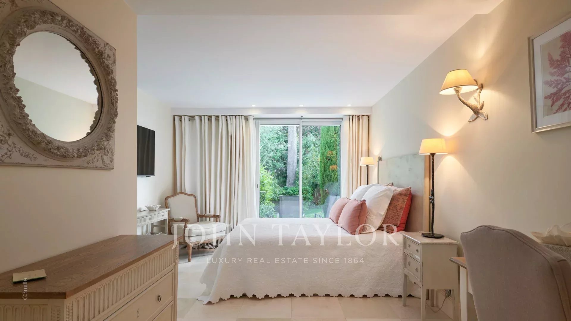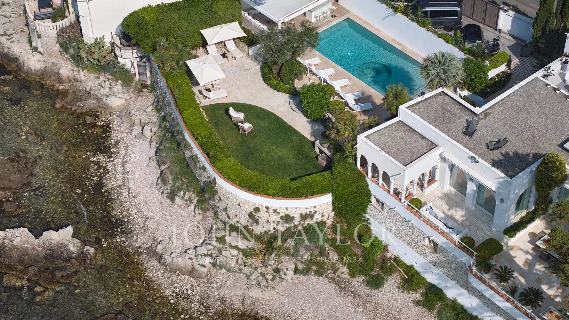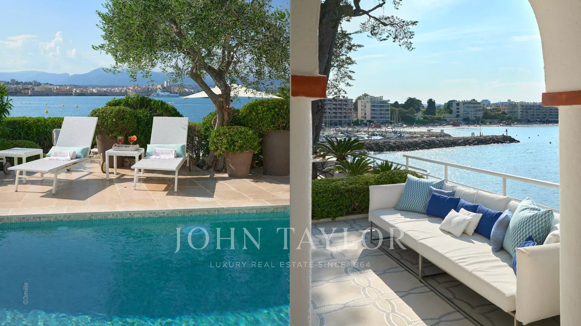 Вход ведет в просторную приемную, выходящую на великолепную террасу с видом на море и старый Антиб, состоящую из гостиной и столовой на 12 персон.