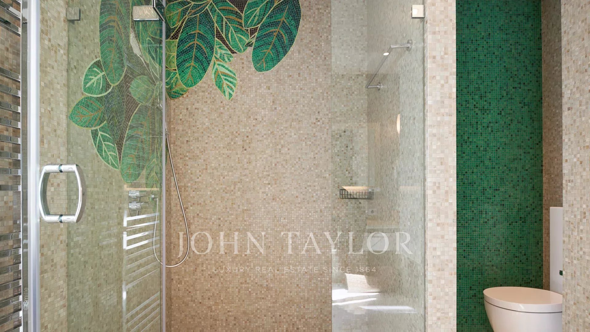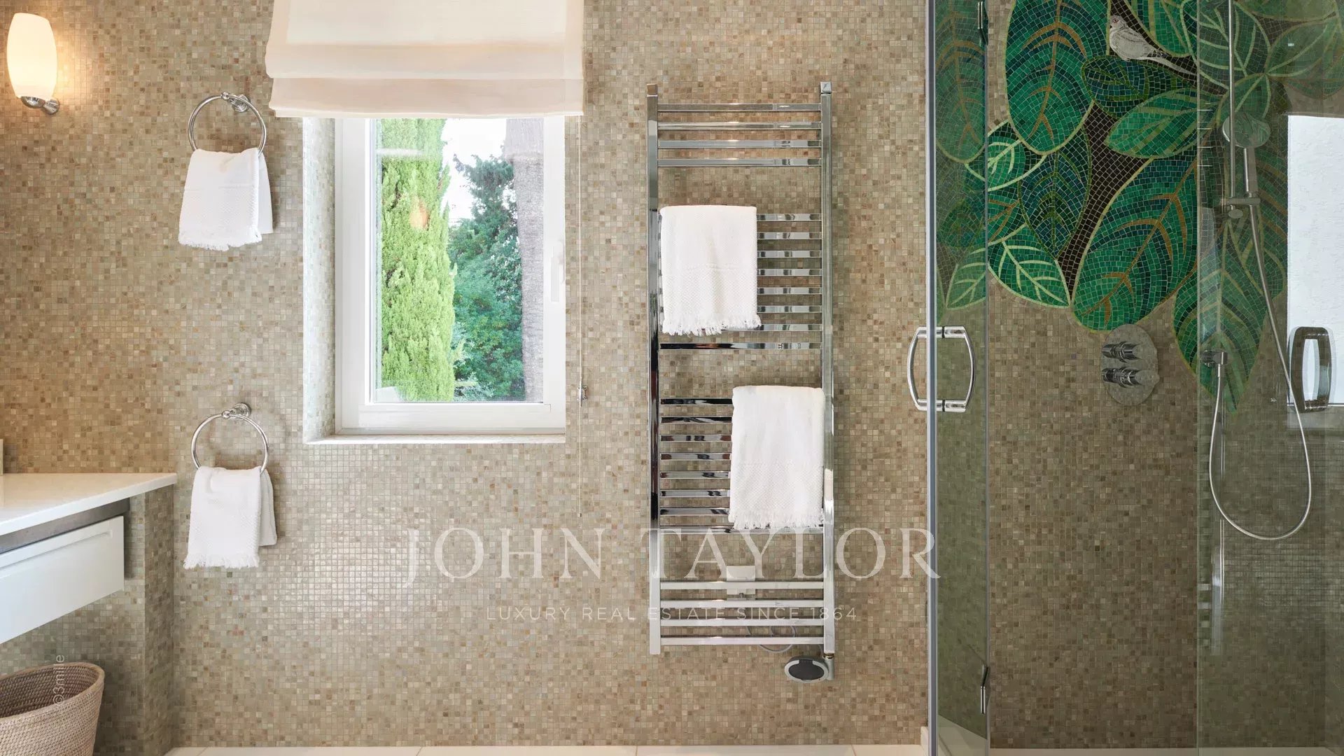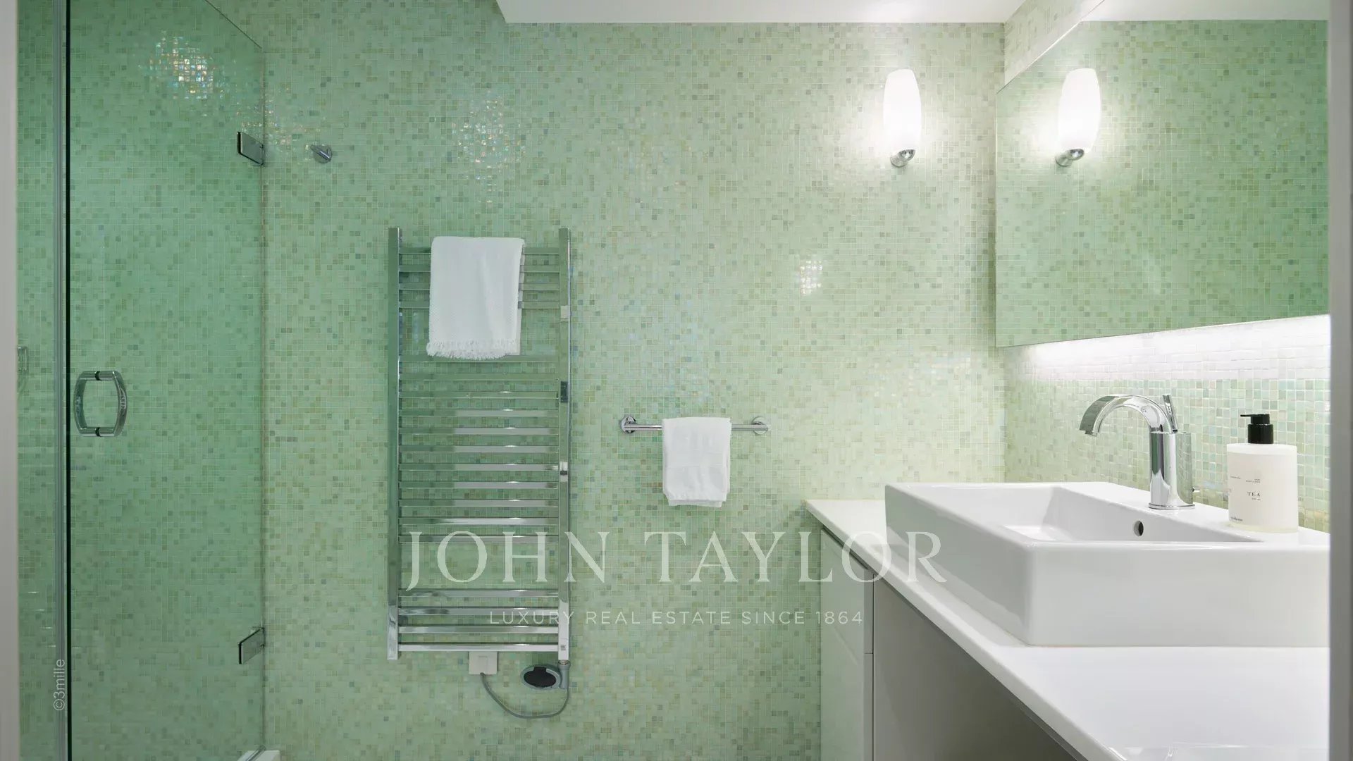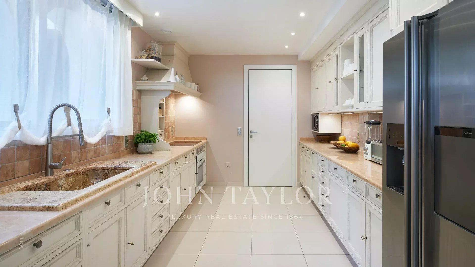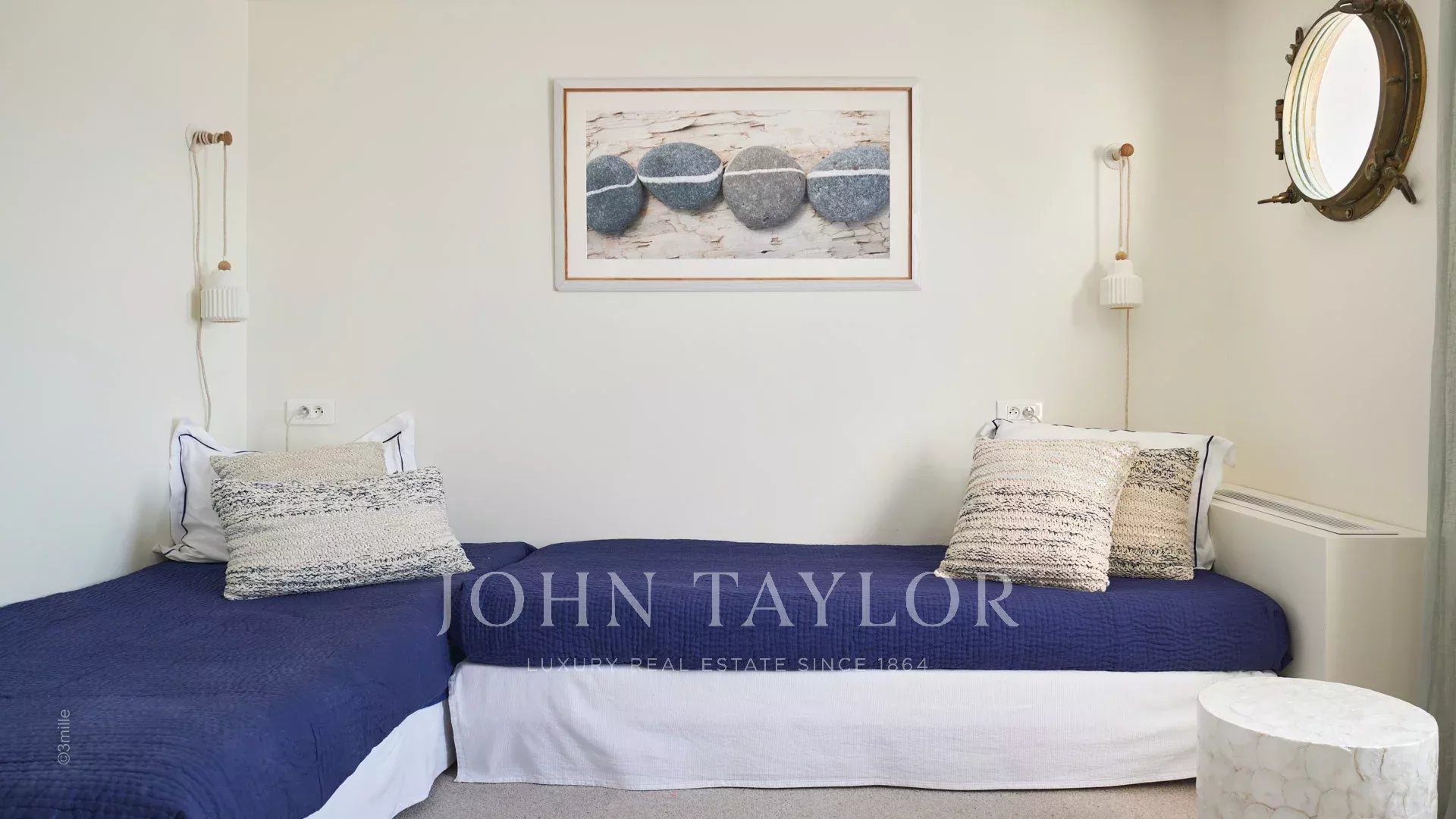 Вход ведет в просторную приемную, выходящую на великолепную террасу с видом на море и старый Антиб, состоящую из гостиной и столовой на 12 персон.