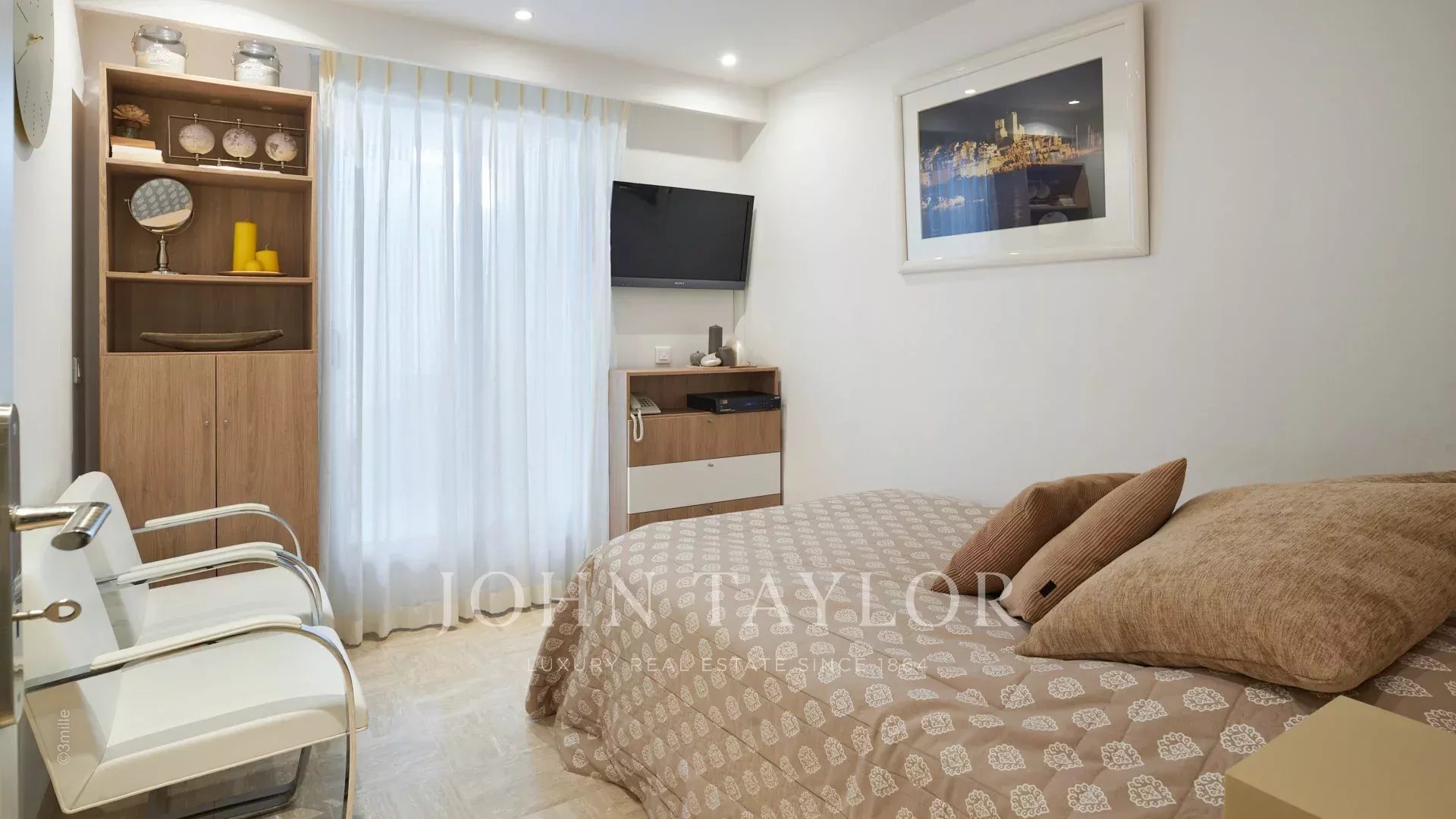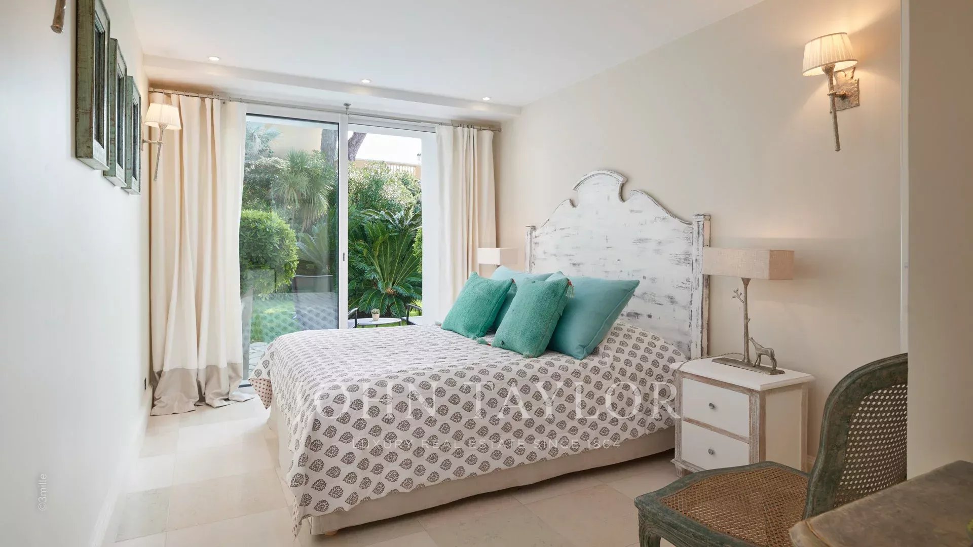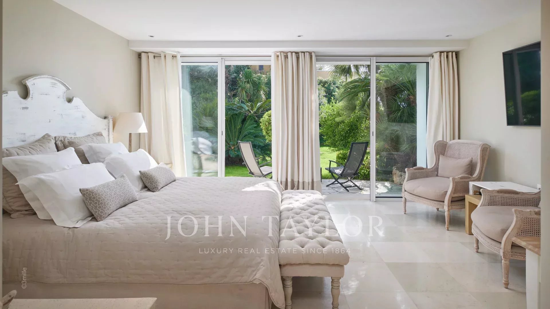 Главная спальня с двуспальной кроватью и телевизором выходит на террасу и включает в себя гардеробную и душевую/туалет.