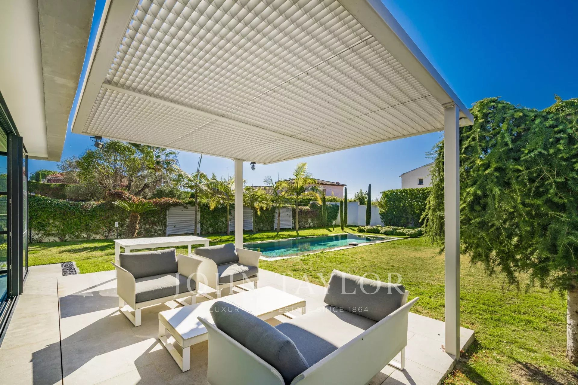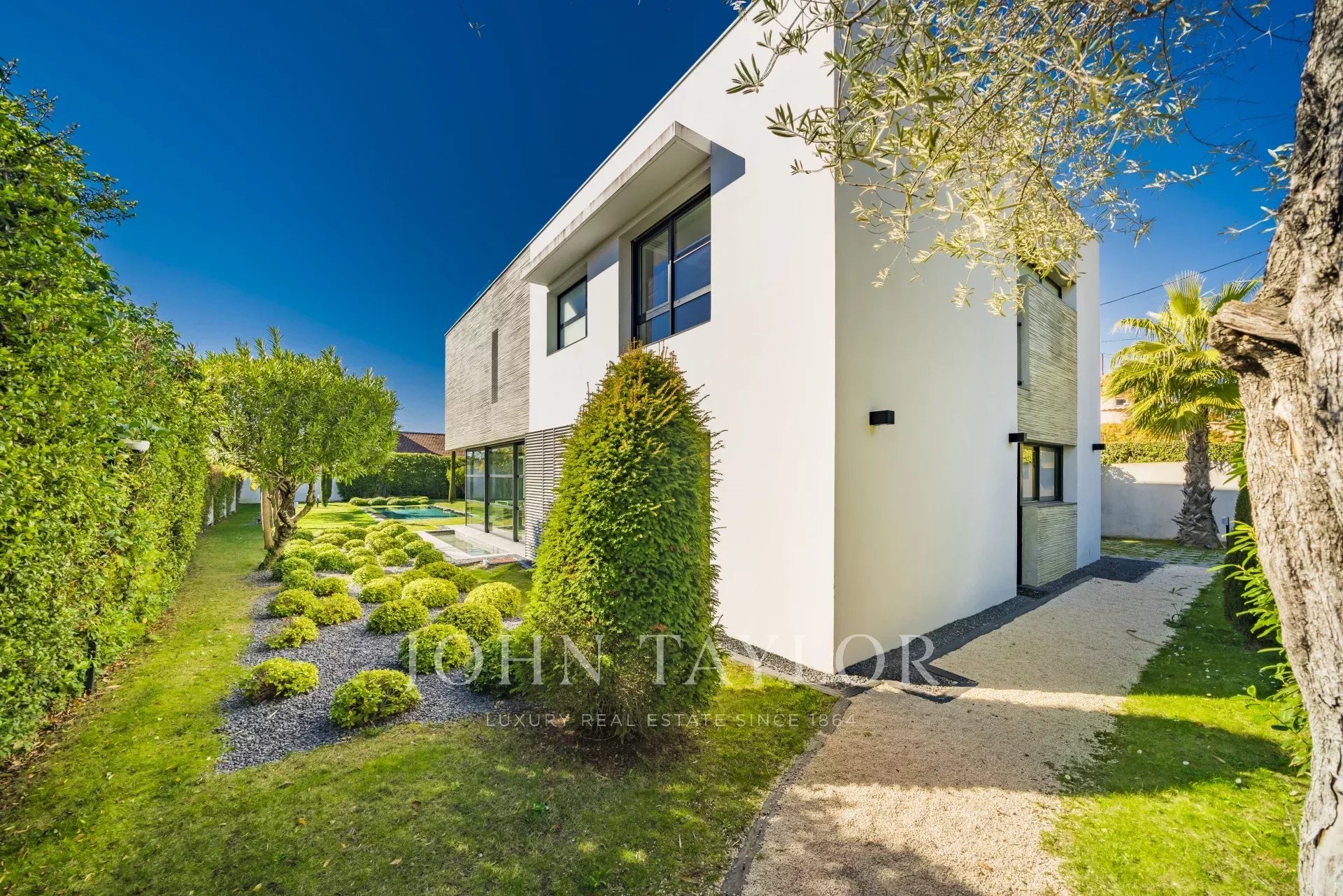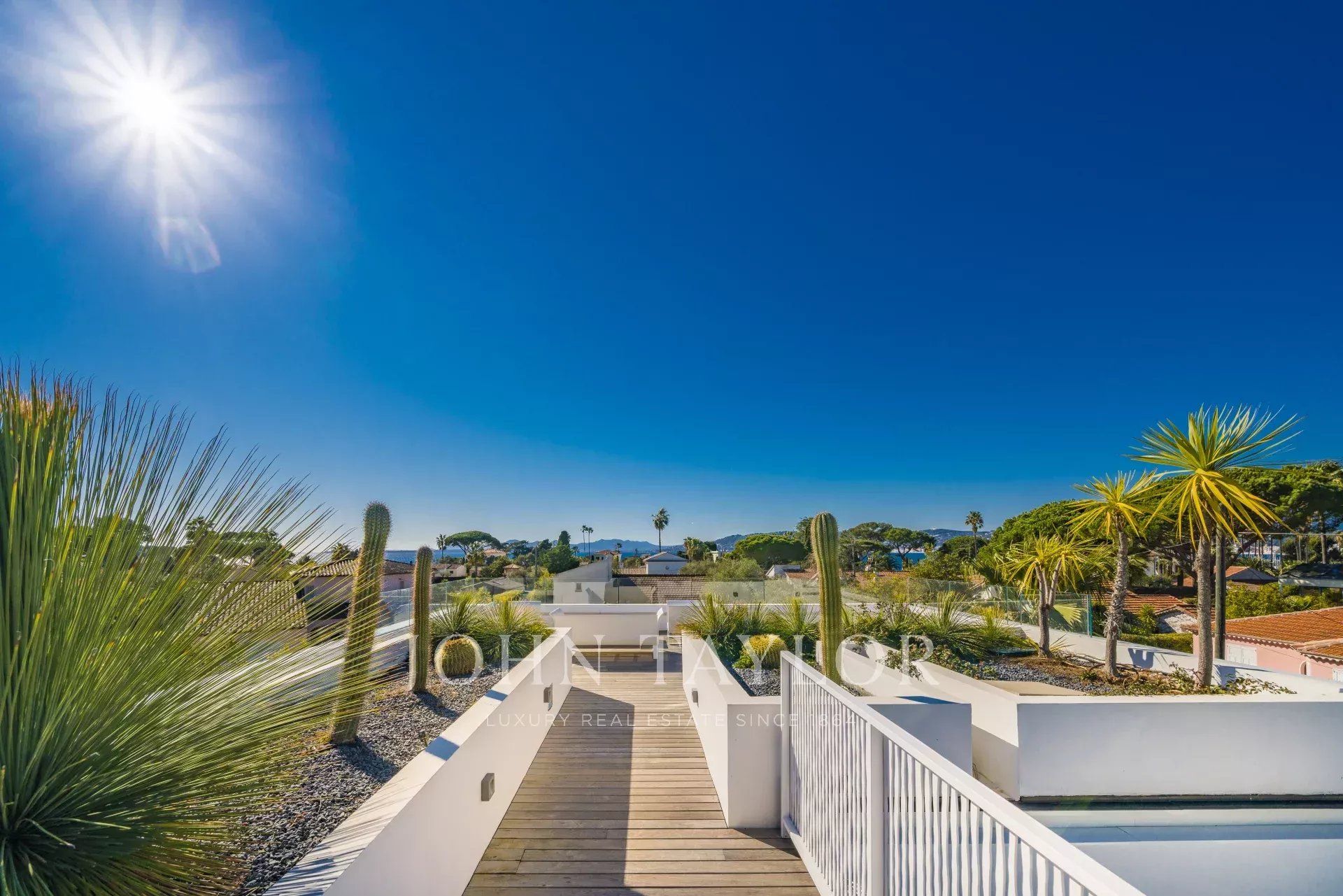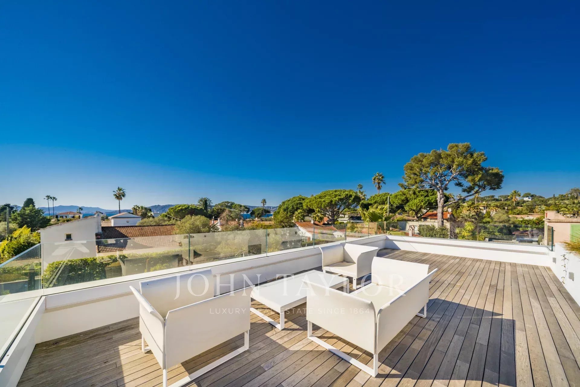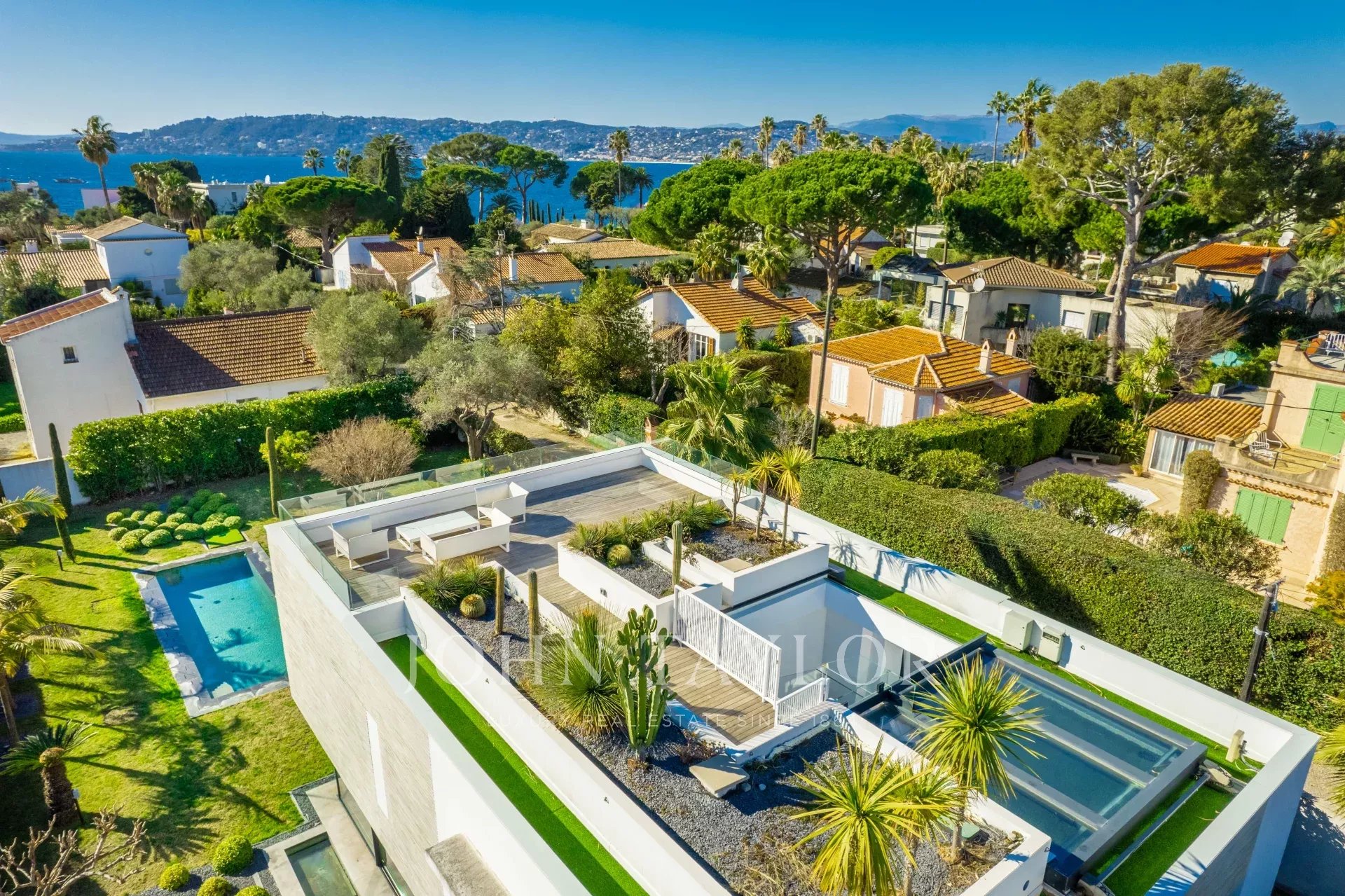 Современная вилла, строительство которой будет завершено летом 2020 года. 320 м² жилой площади, 940 м² ровной земли, с террасы на крыше открывается потрясающий вид на море (залив Жуан-ле-Пен и Иль-де-Лерин).