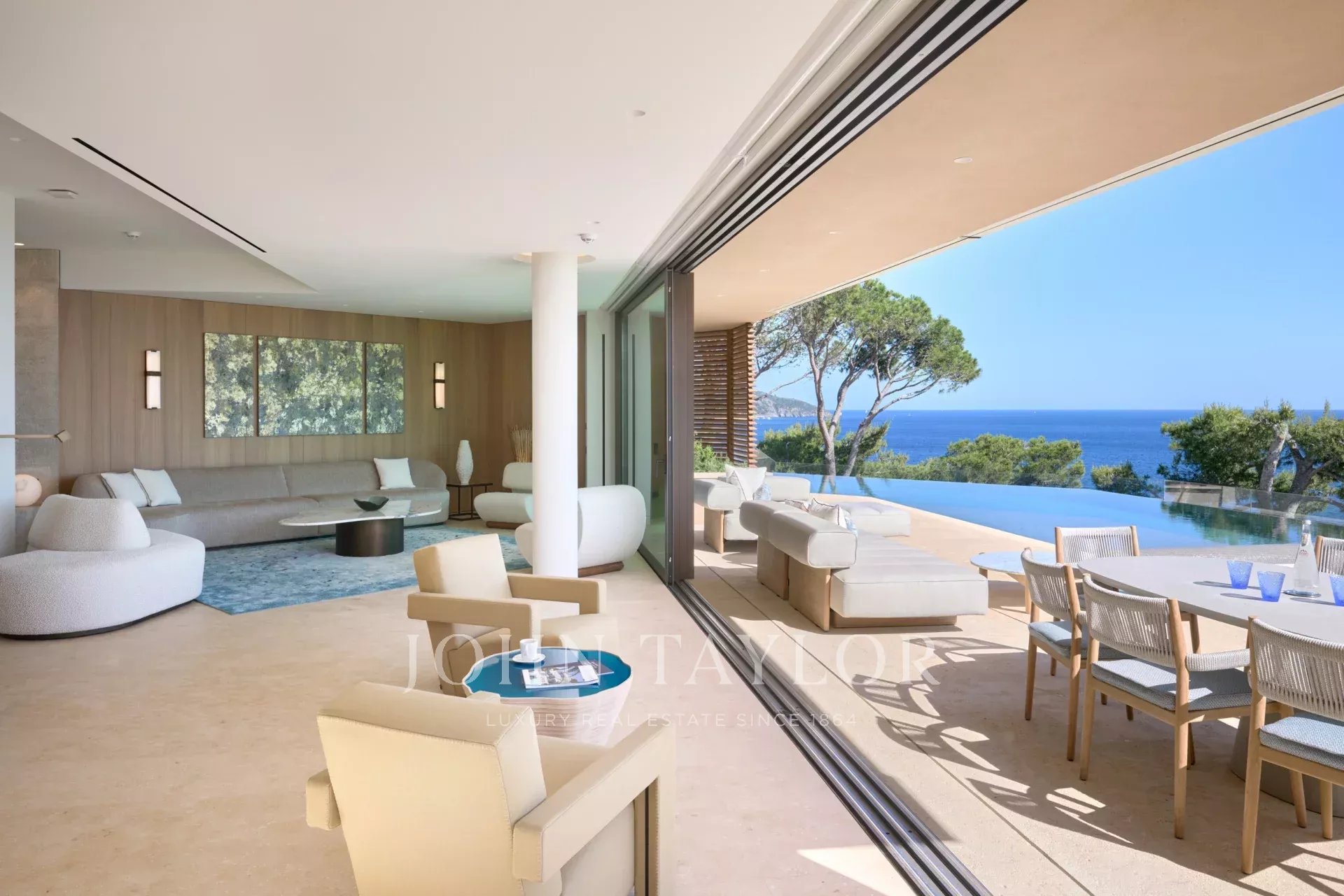 - Гостиная, выходящая на большие картинные окна: светлое и просторное жилое пространство, гармонично сочетающееся с экстерьером и открывающее захватывающий вид на море.