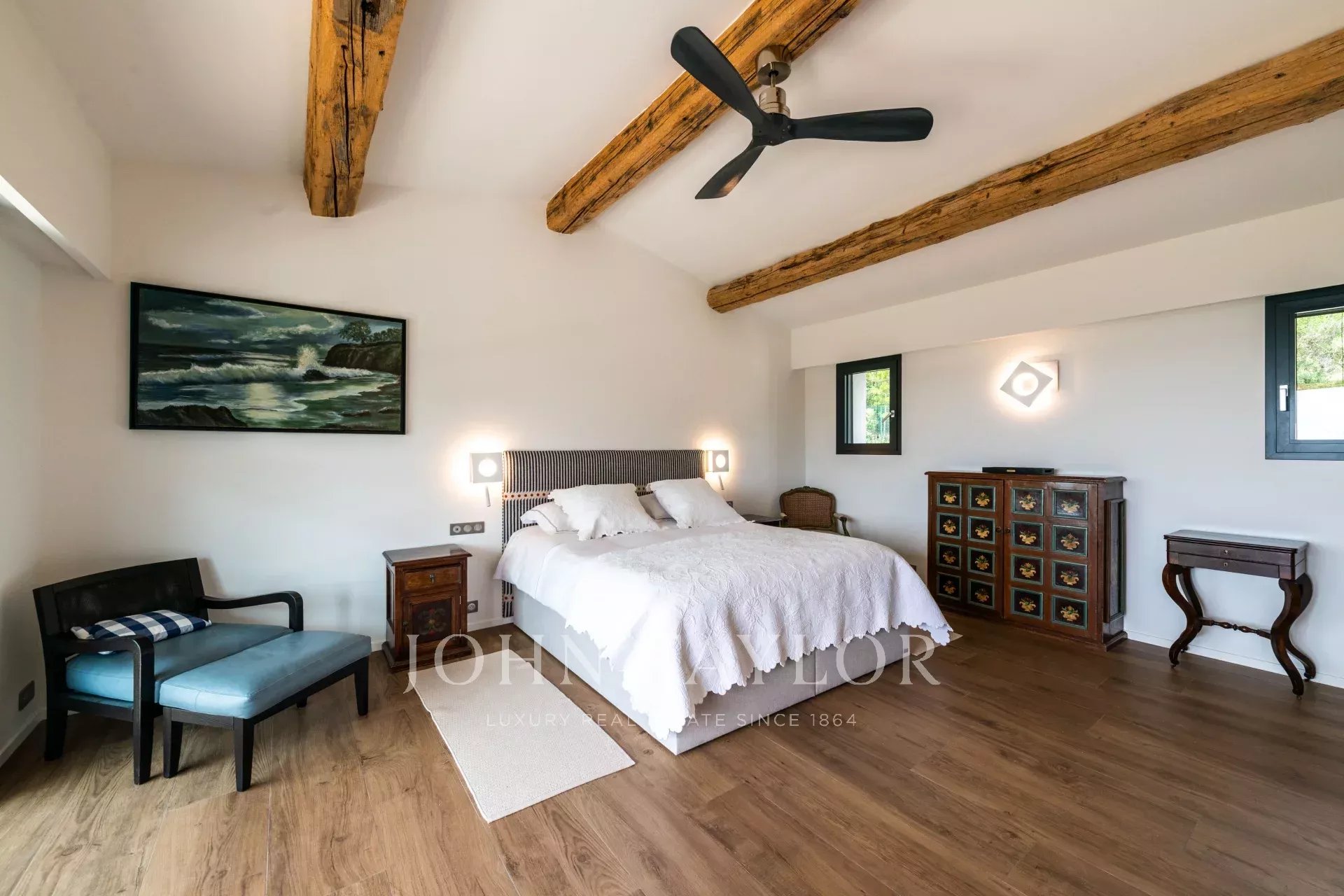 Наверху расположены кабинет, две спальни с ванными комнатами, одна из которых примыкает к кабинету,