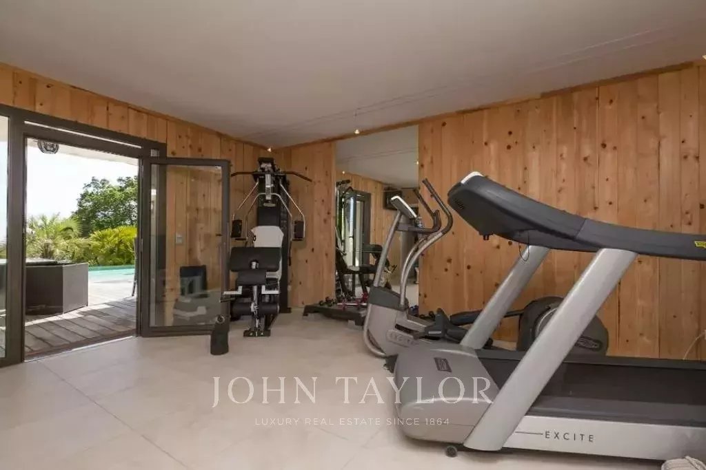 На уровне бассейна находится полностью оборудованный тренажерный зал, домашний кинотеатр, сауна и ванная комната, где можно расслабиться и отдохнуть.