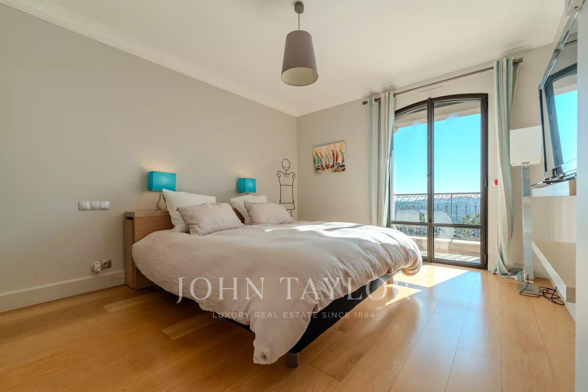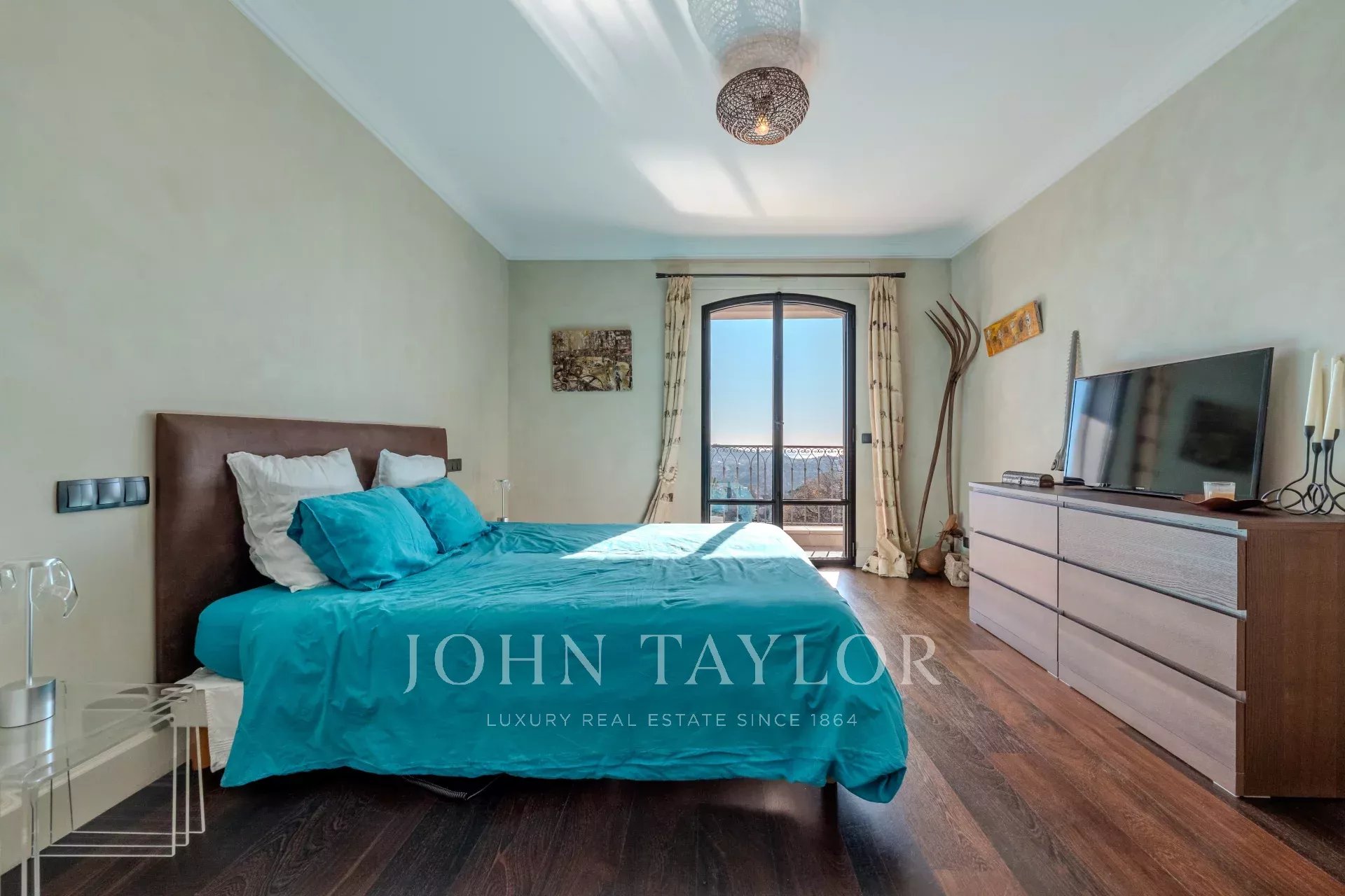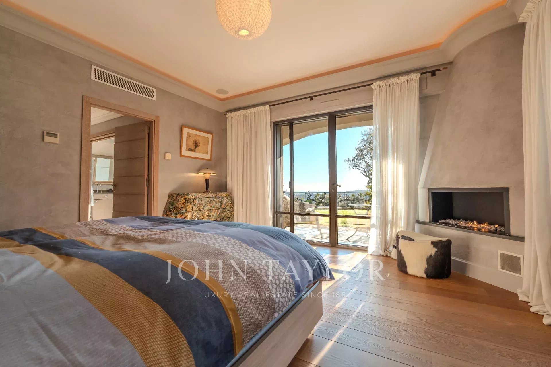 Главная спальня на первом этаже - настоящая жемчужина комфорта, с кроватью king-size, двойной гардеробной и ванной комнатой (душ/туалет), выходящей на частную террасу.