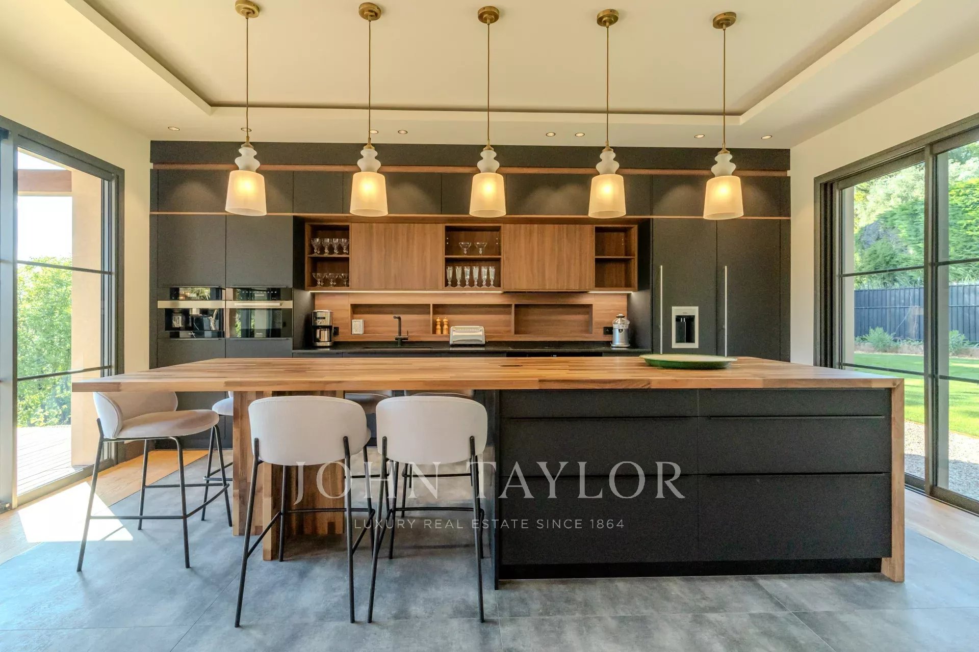 Полностью оборудованная высокотехнологичная кухня открытой планировки с центральным островом и зоной для завтрака.