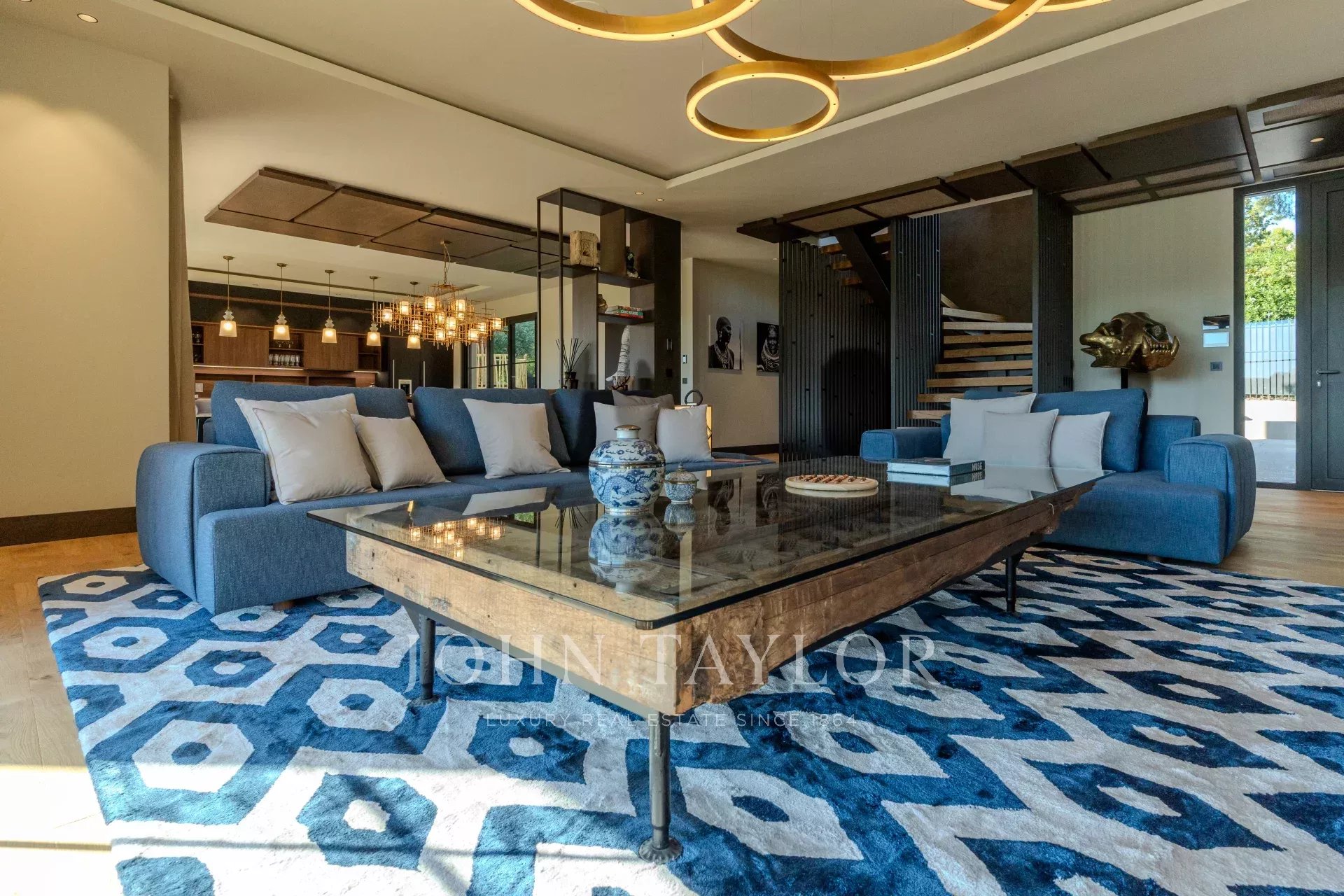 Большая, красиво оформленная гостиная/комната для приема гостей, которая плавно переходит в террасу из тикового дерева и бассейн. Это пространство идеально подходит для развлечений или отдыха с семьей и друзьями.