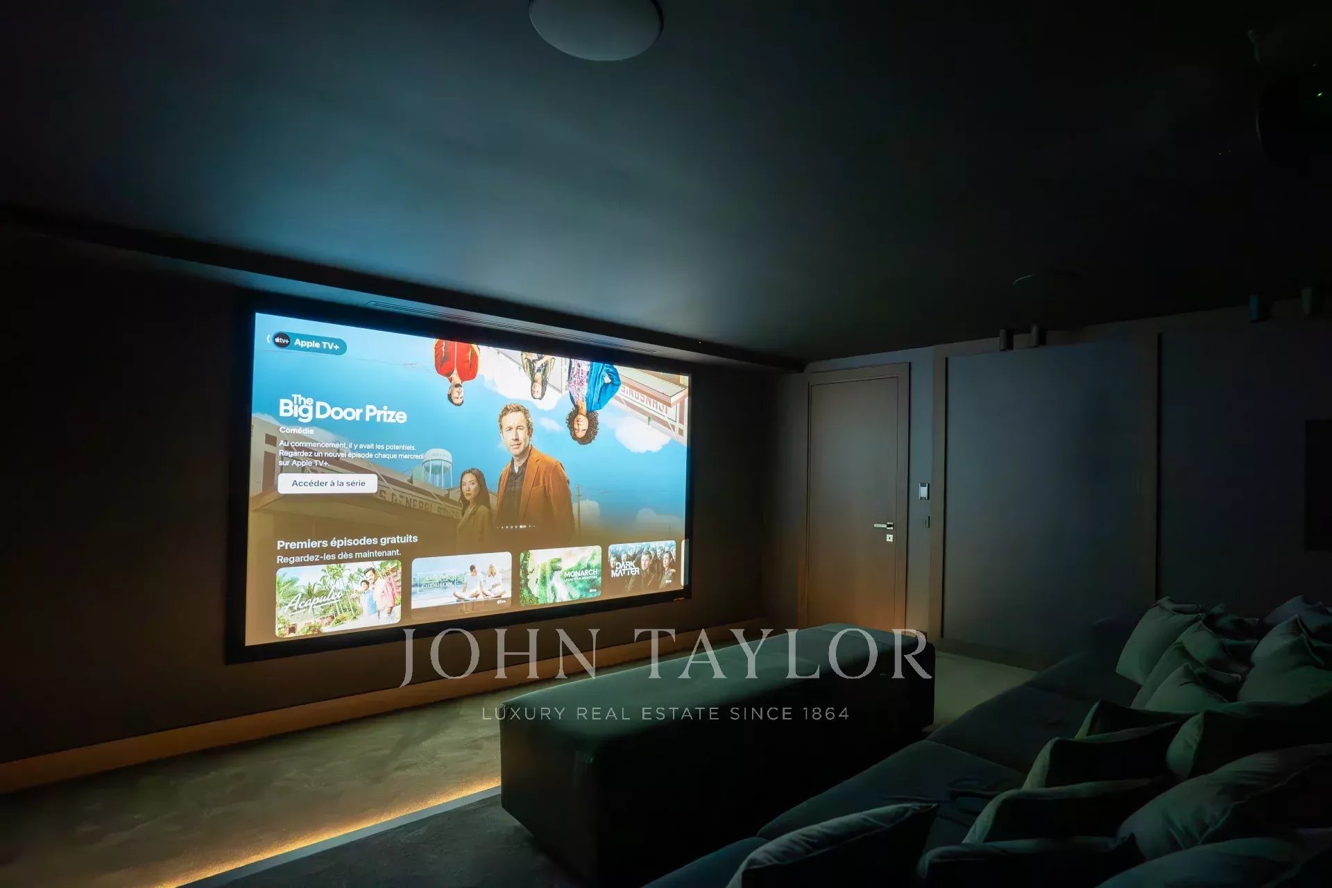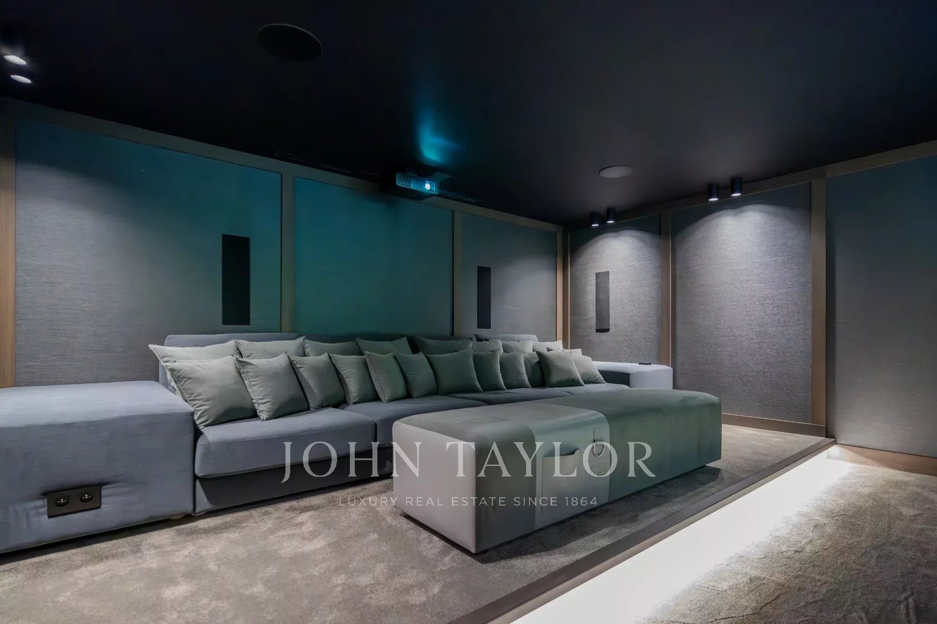 Кинозал с очень удобными креслами и современным аудиовизуальным оборудованием для захватывающего просмотра фильмов.