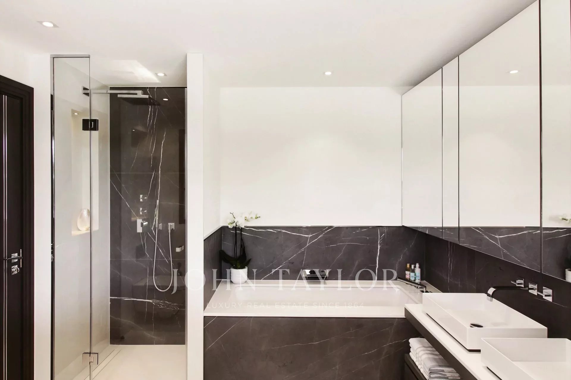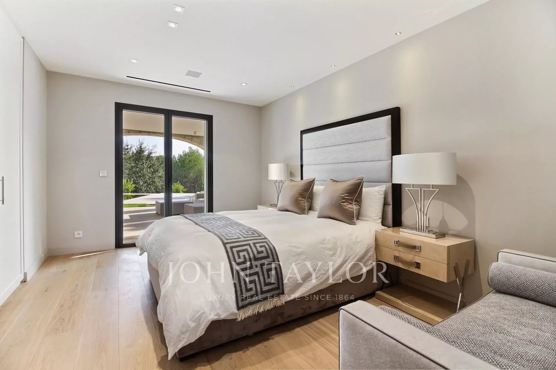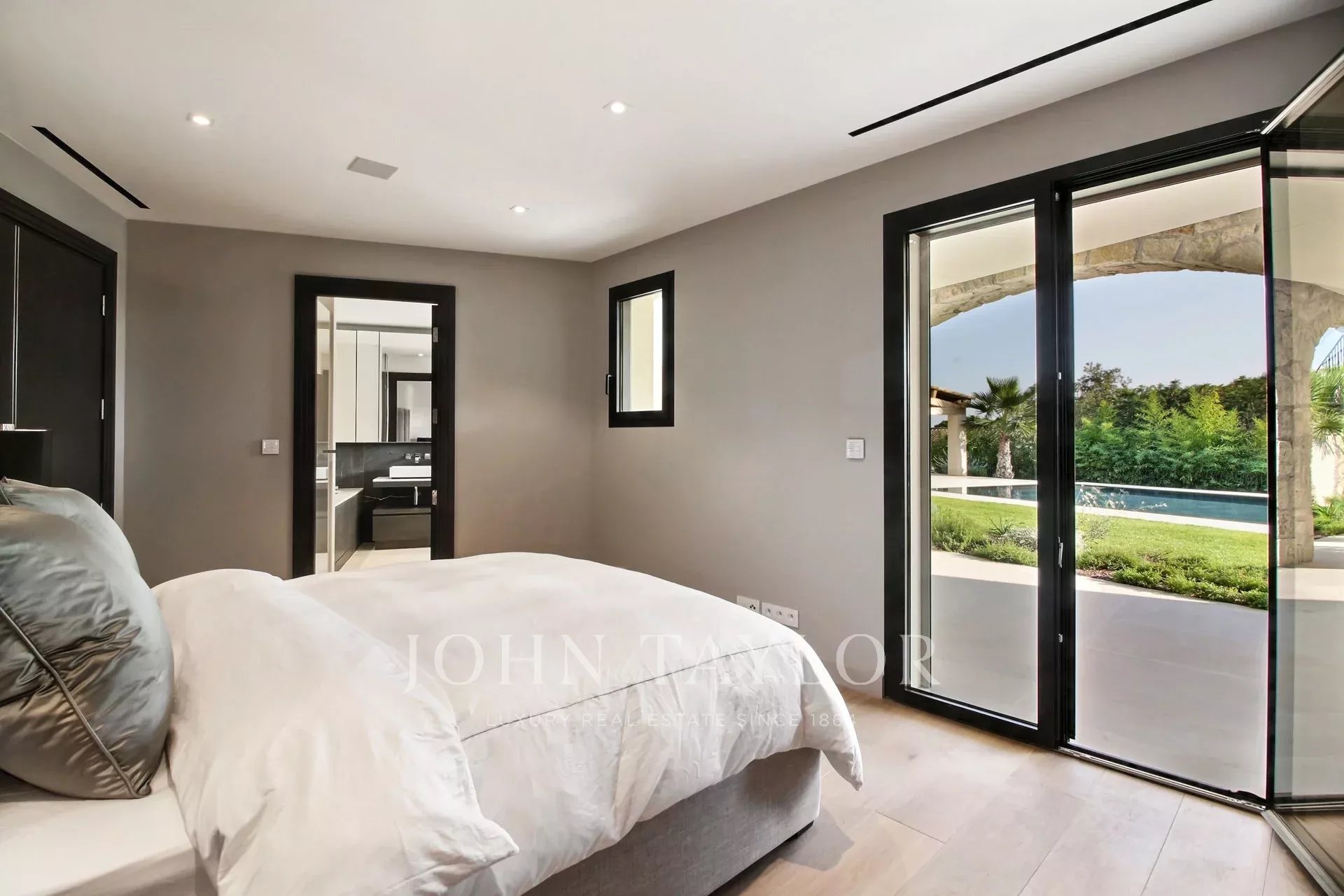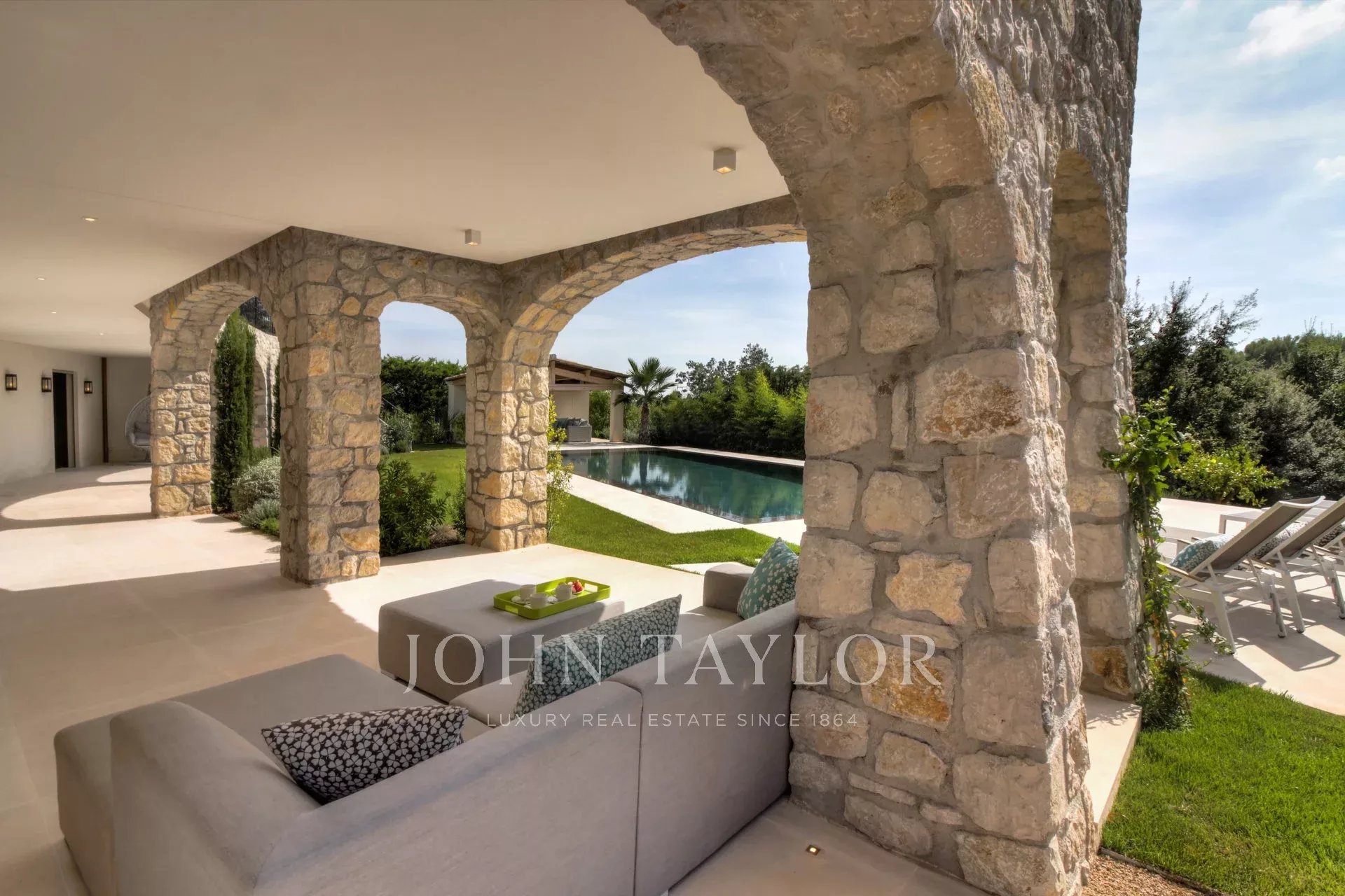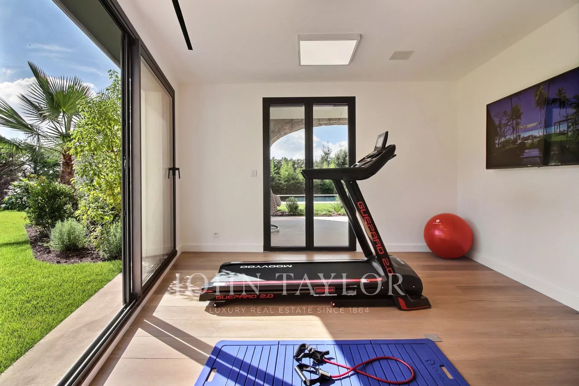 На территории особняка есть зеркальный бассейн с подогревом, полностью оборудованная бильярдная, летняя кухня, укрытая зона отдыха и площадка для игры в петанк.