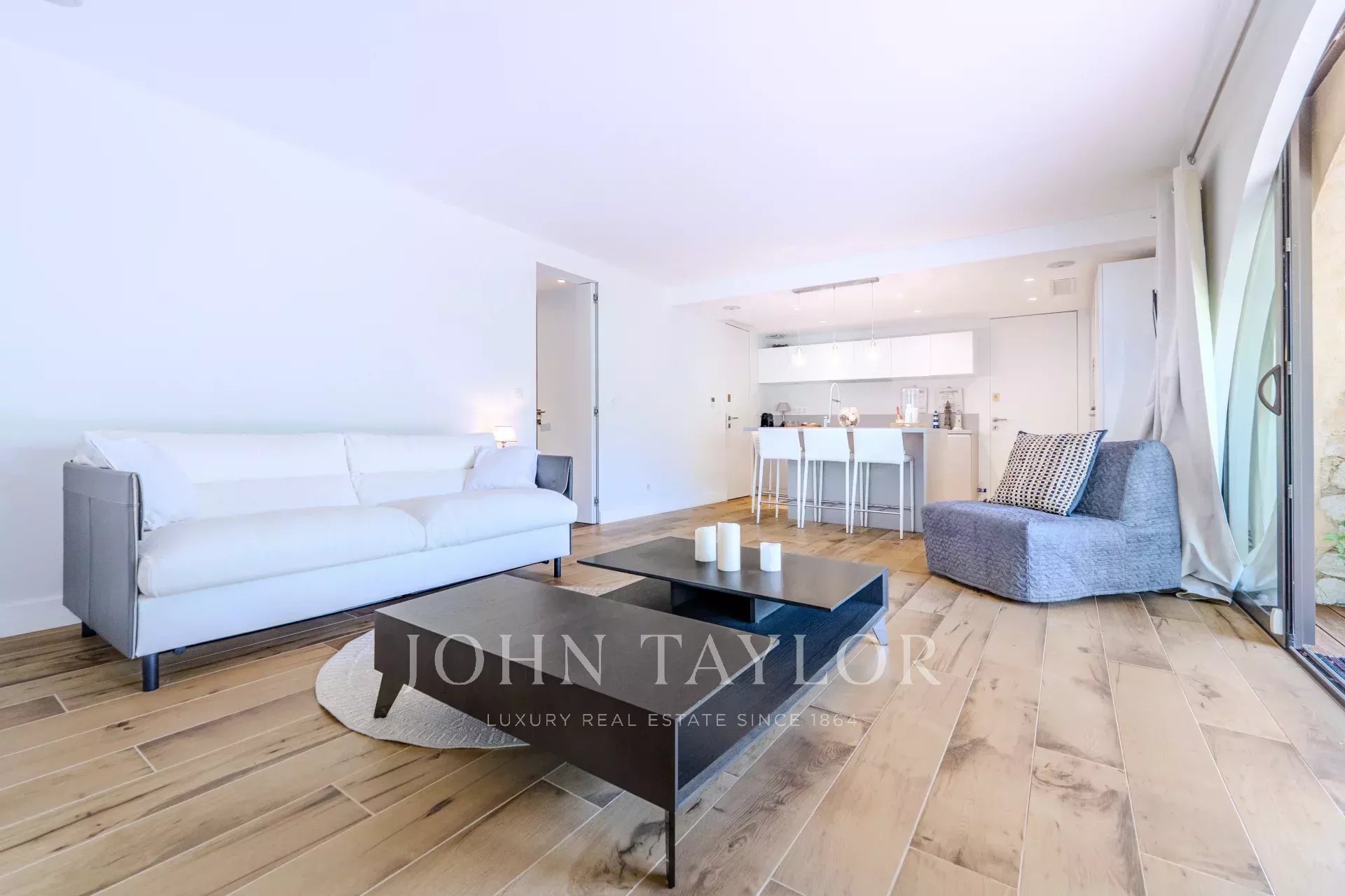 Большая, светлая и со вкусом оформленная гостиная с обеденной зоной и полностью оборудованная кухня открытой планировки.
