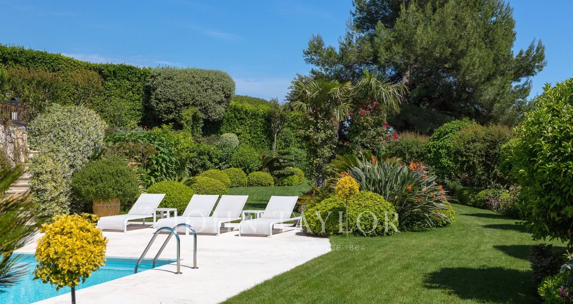 Расположенная в ухоженном ландшафтном саду, вилла окружена средиземноморскими деревьями и пышной зеленью.