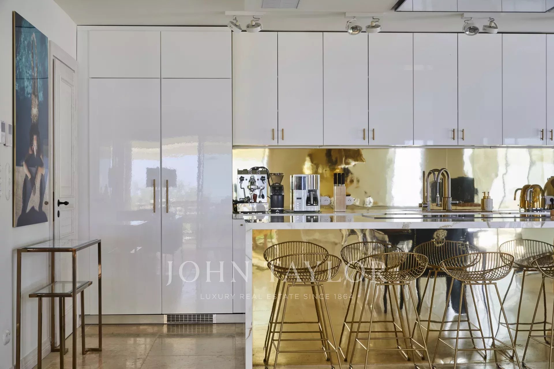 Гостиная залита светом благодаря великолепному угловому окну и является продолжением полностью оборудованной кухни с центральным островом.