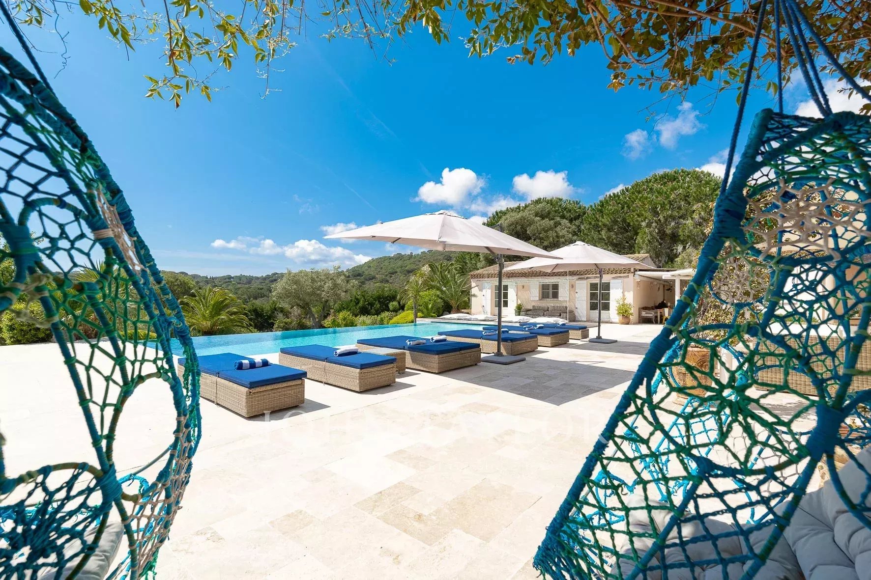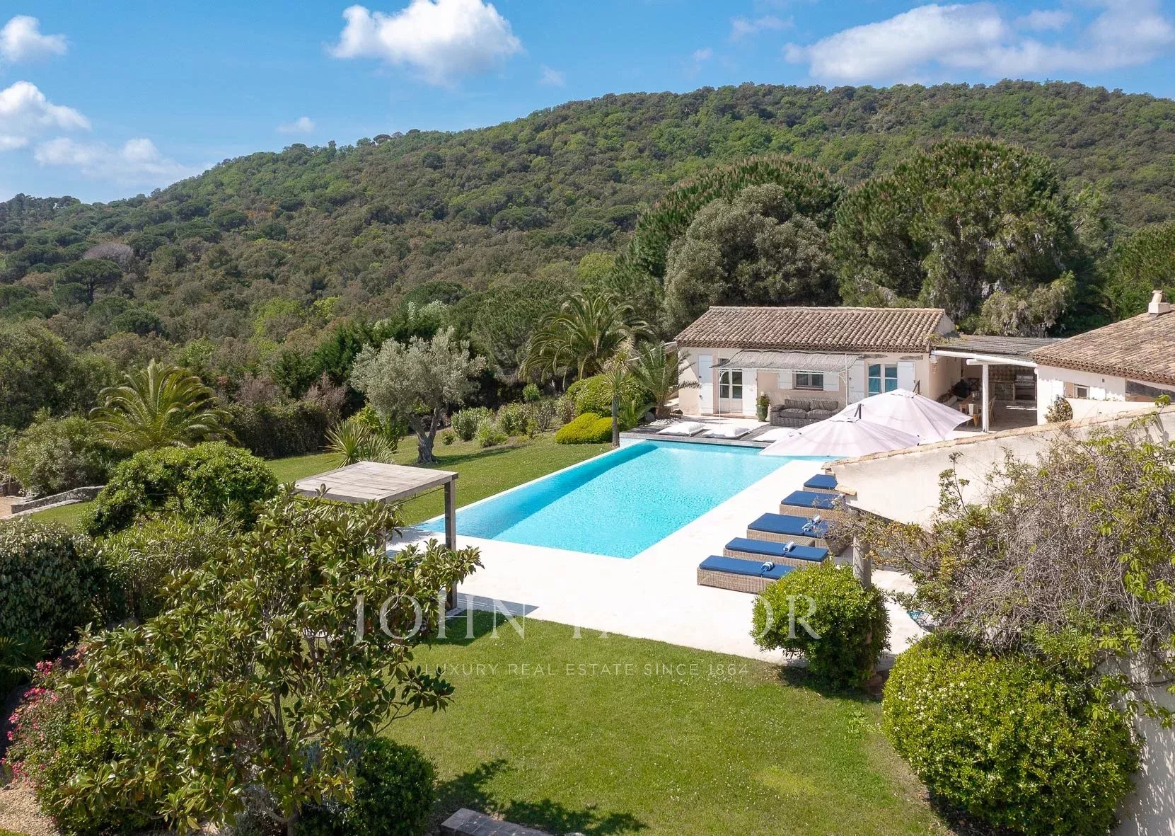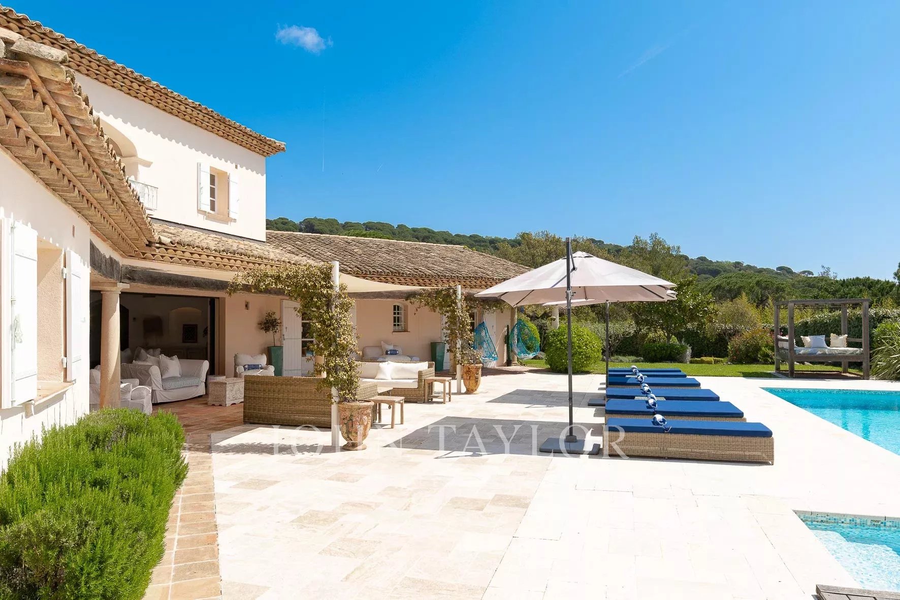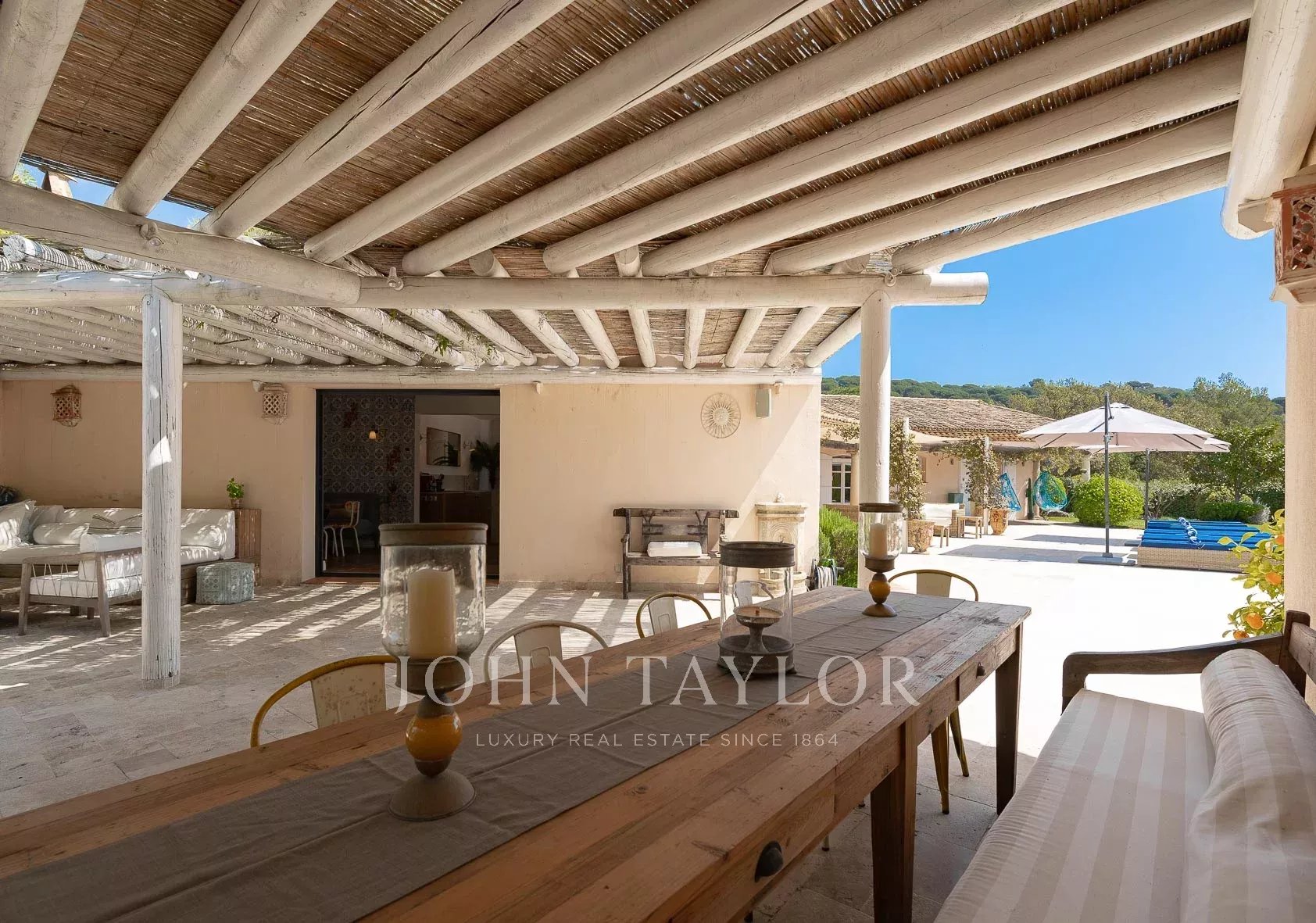 Кондиционер, многочисленные крытые террасы, барбекю, сигнализация, бассейн с подогревом и покрытием, площадка для игры в петанк и гараж.