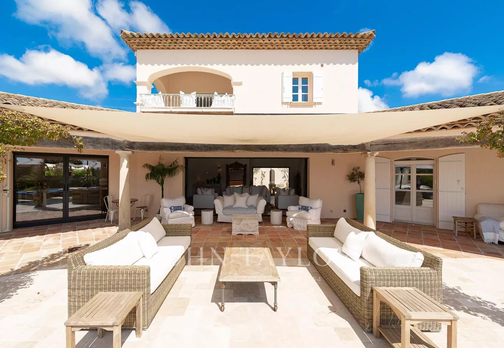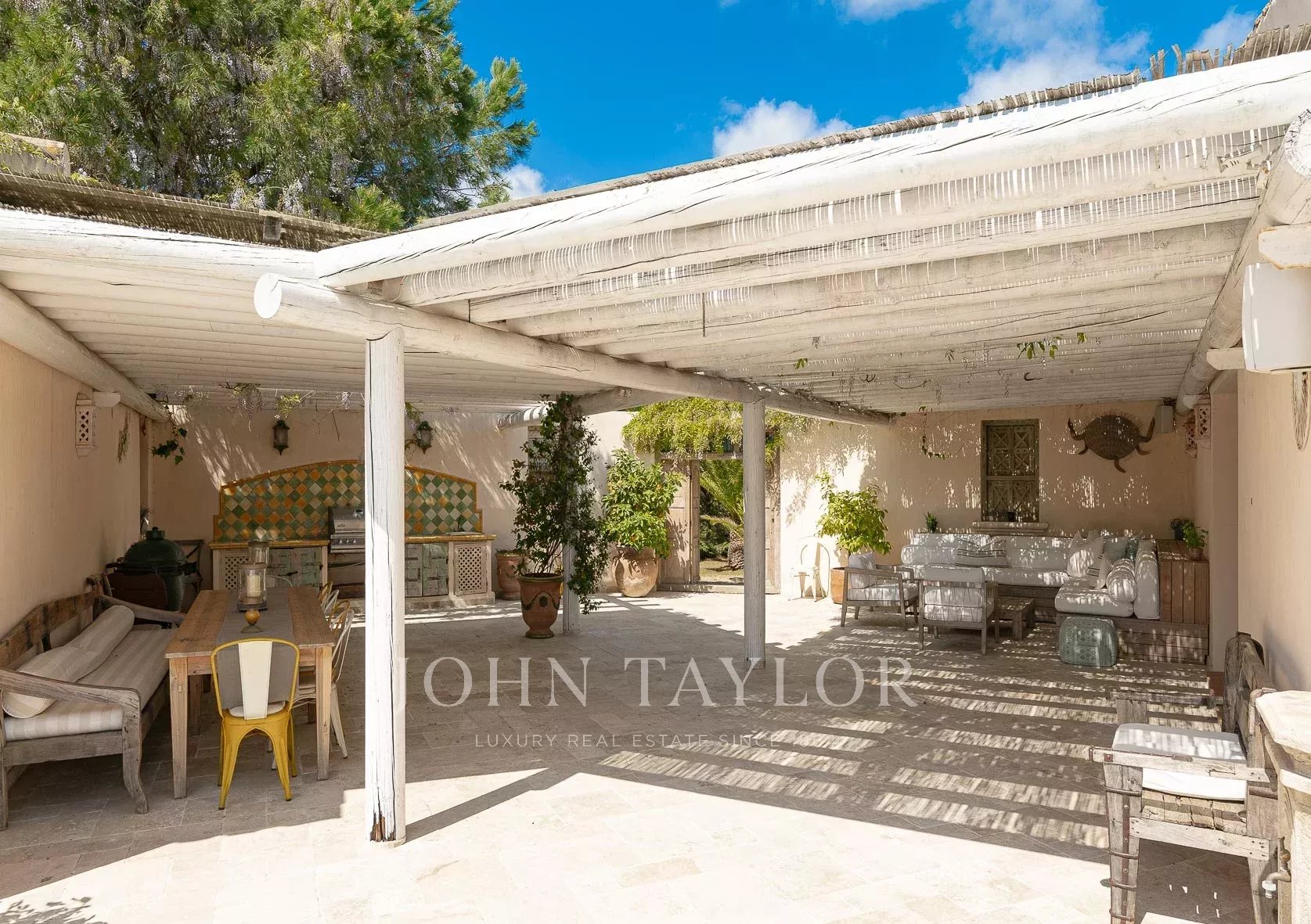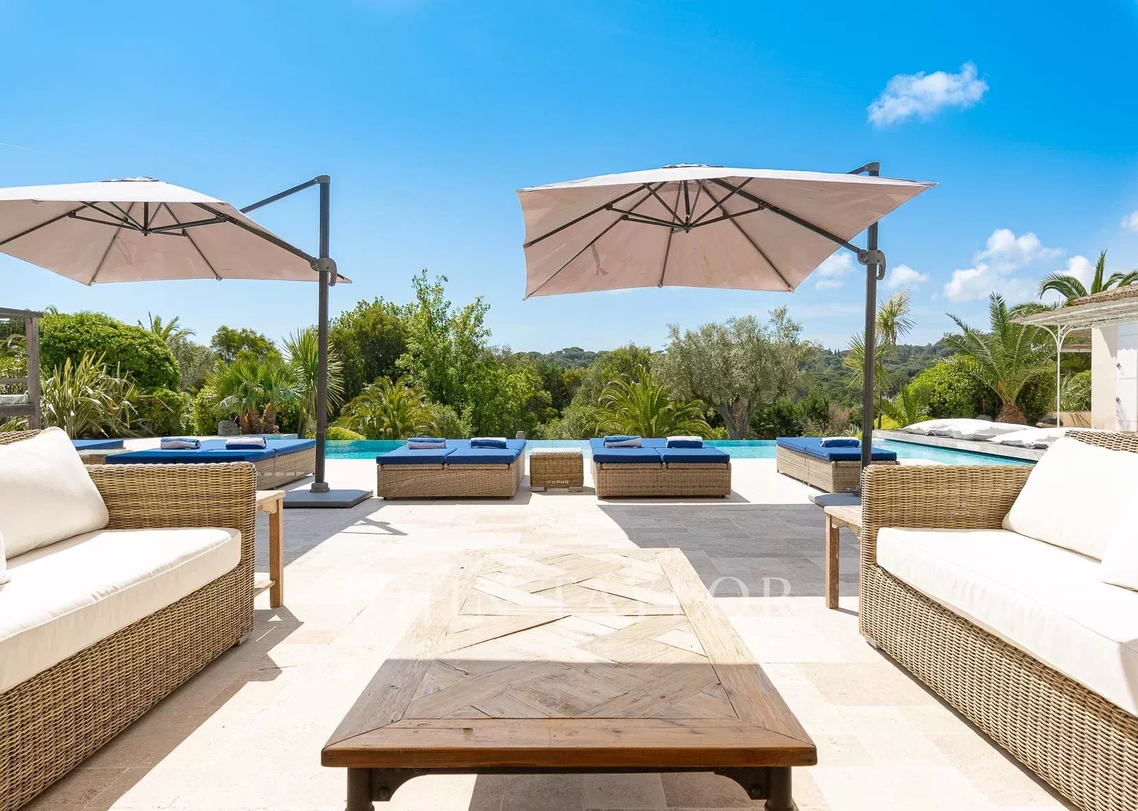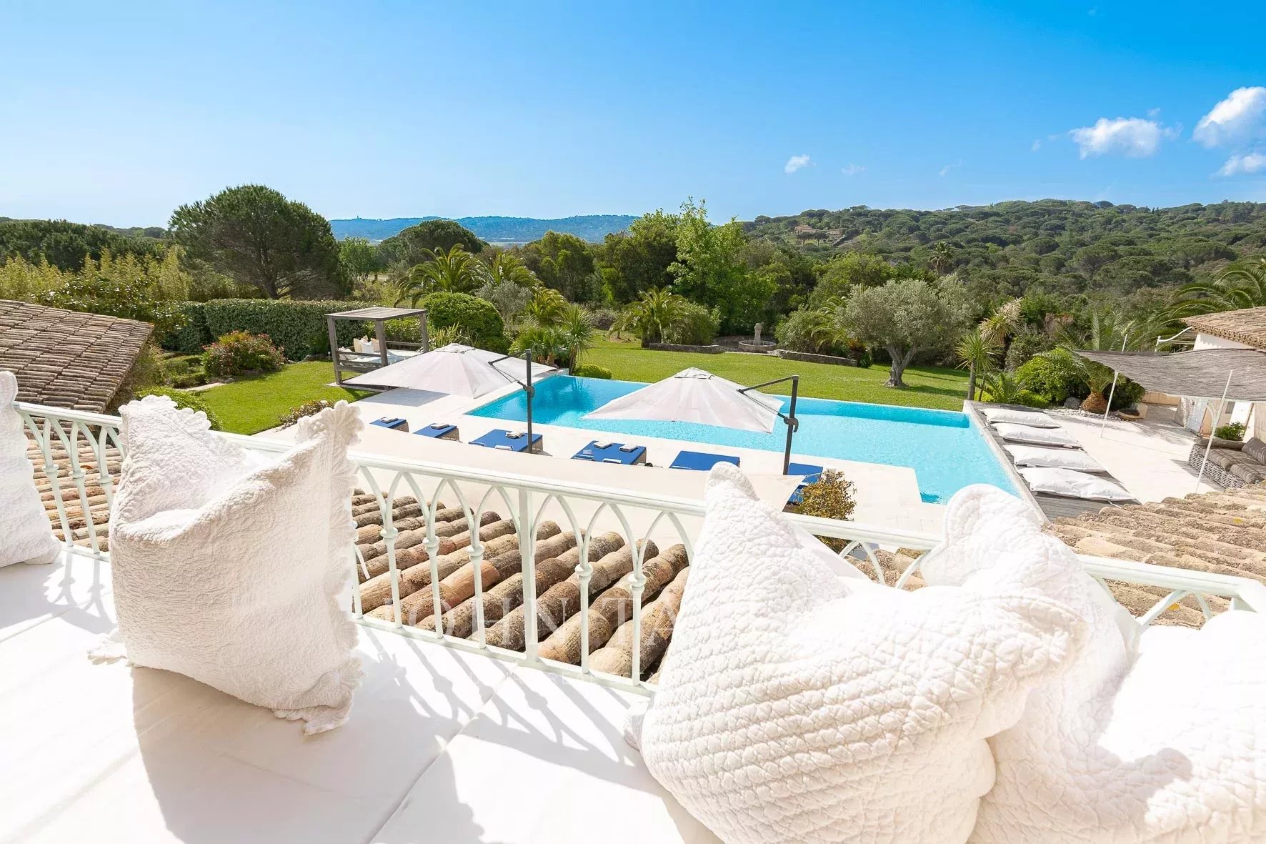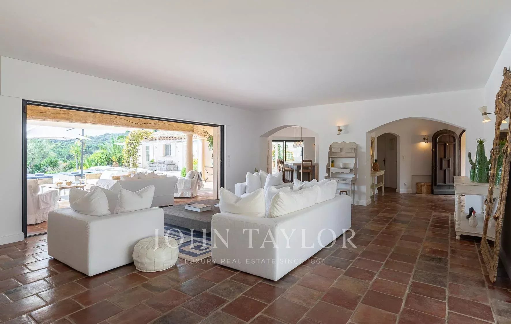 Кондиционер, многочисленные крытые террасы, барбекю, сигнализация, бассейн с подогревом и покрытием, площадка для игры в петанк и гараж.