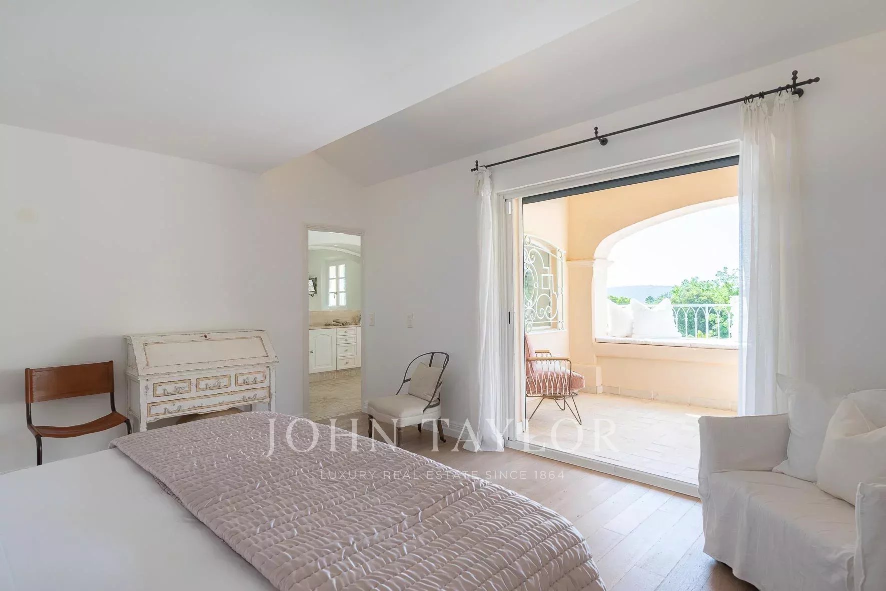 Роскошная главная спальня с собственным балконом, ванной комнатой и гардеробной.