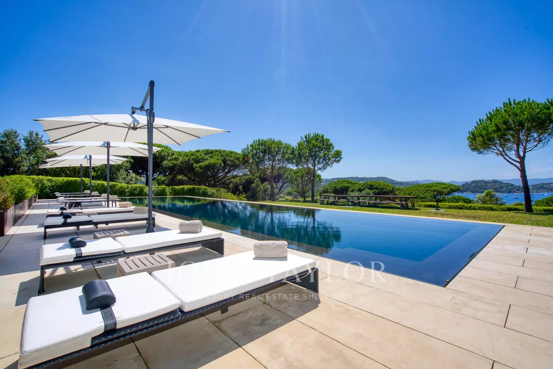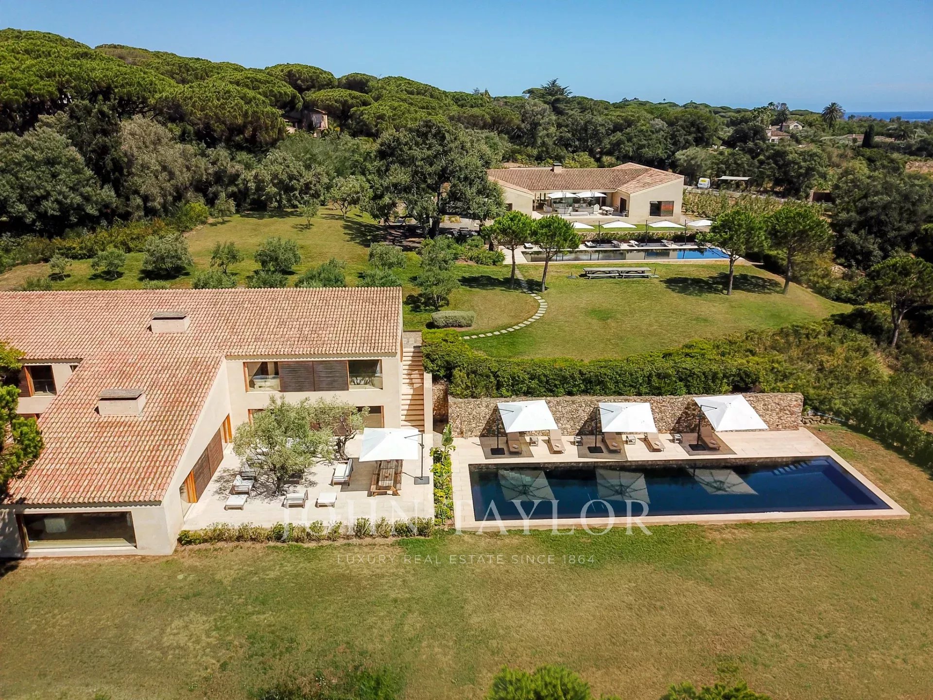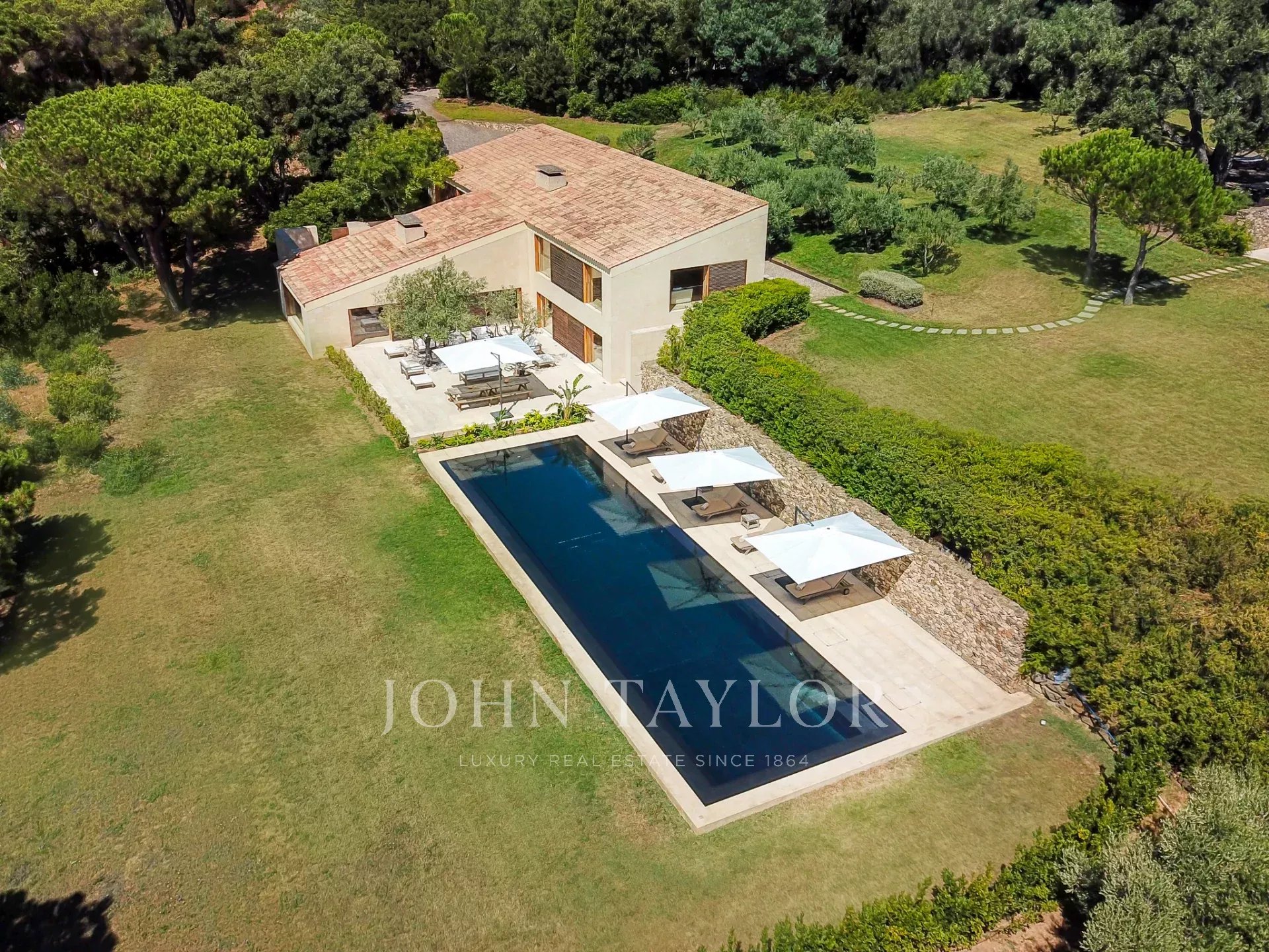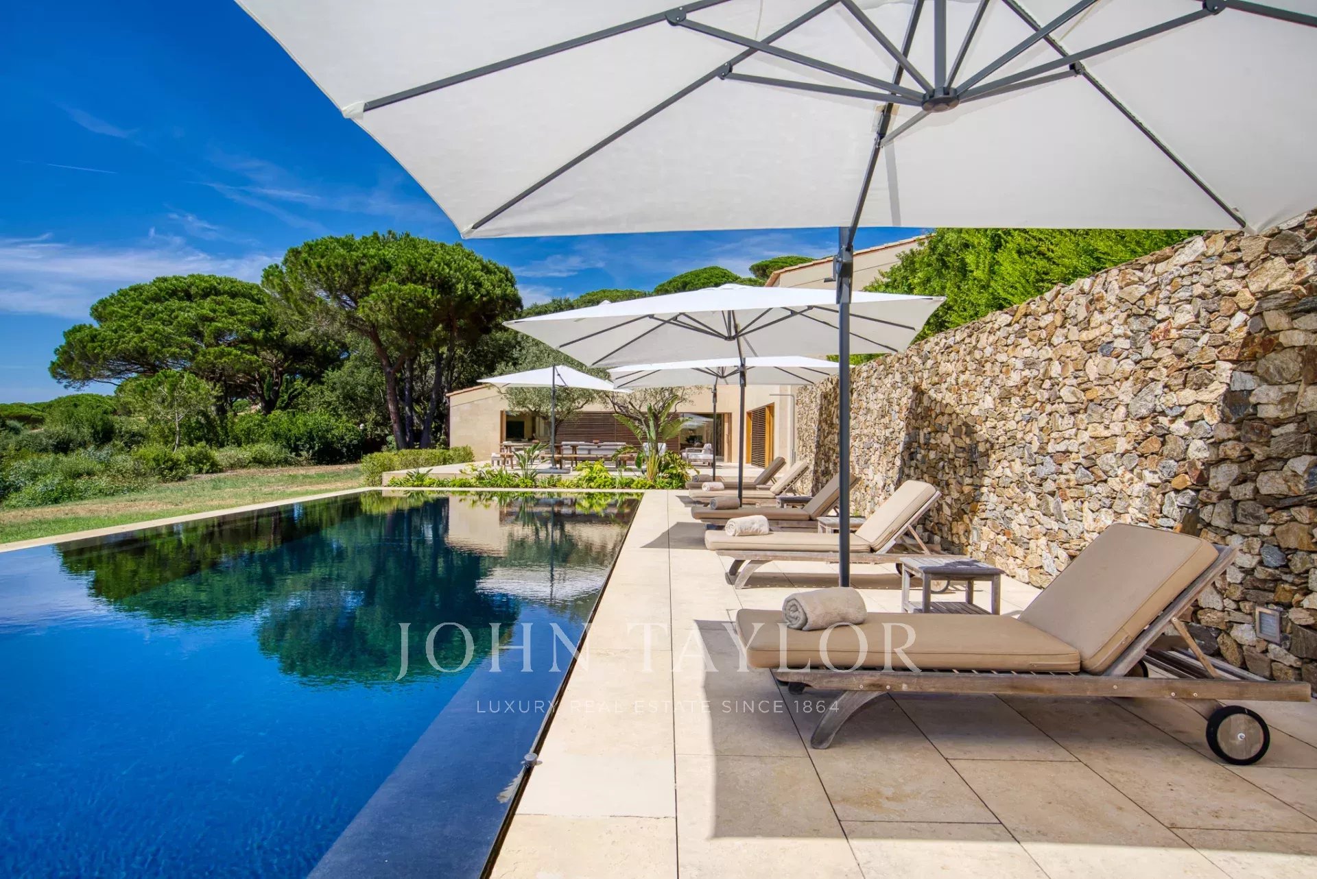 Эксклюзивное поместье, расположенное в парке Сен-Тропе, которое можно арендовать целиком (8 спален), спроектированное британским архитектором Джоном Поусоном и состоящее из следующих помещений: