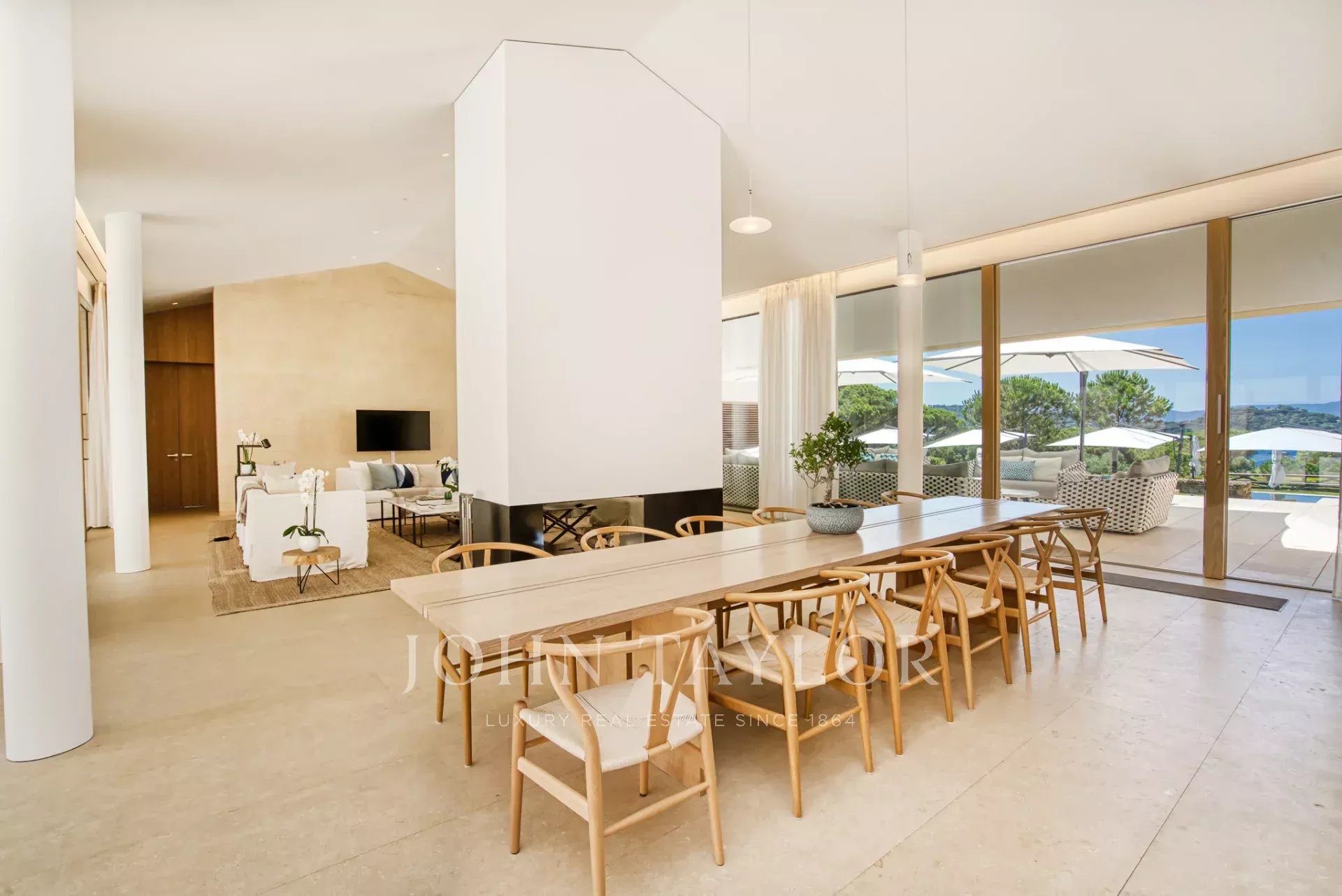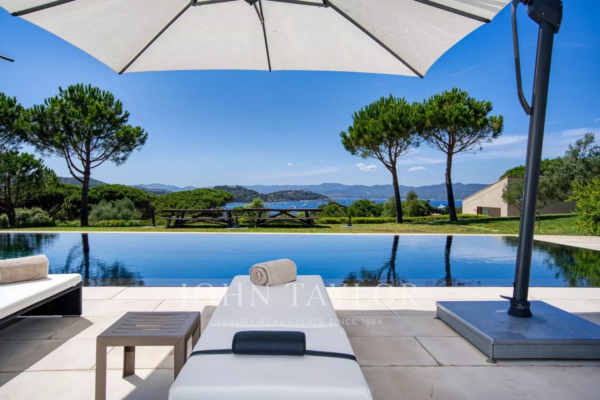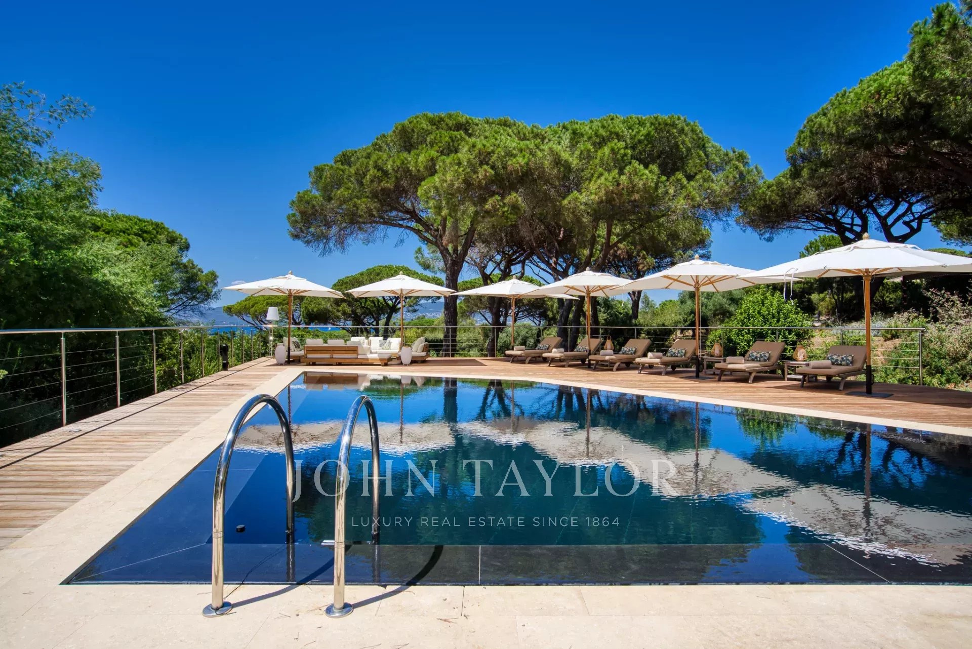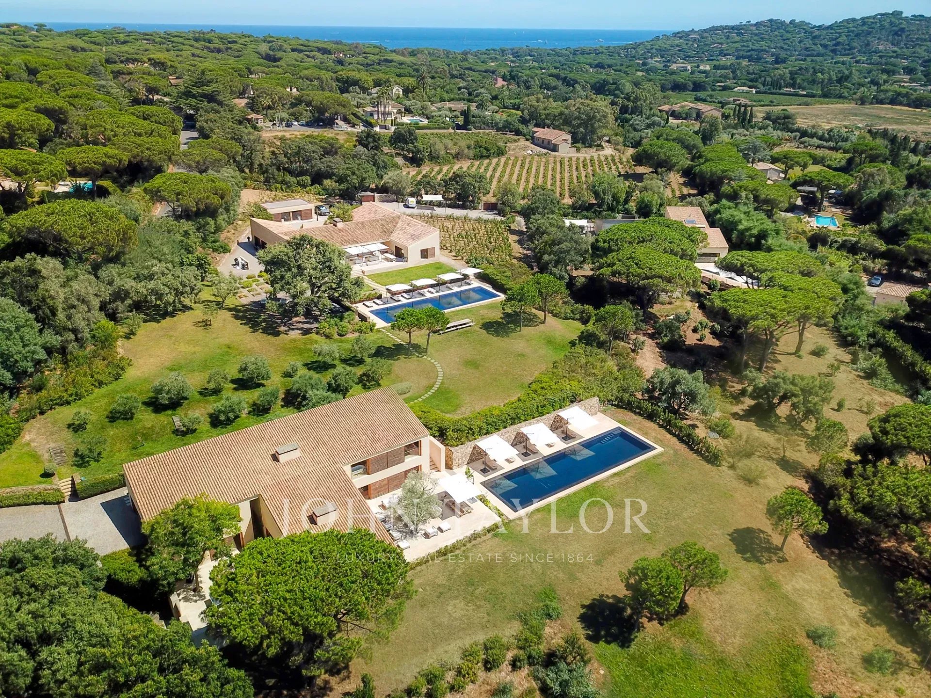 Эксклюзивное поместье, расположенное в парке Сен-Тропе, которое можно арендовать целиком (8 спален), спроектированное британским архитектором Джоном Поусоном и состоящее из следующих помещений: