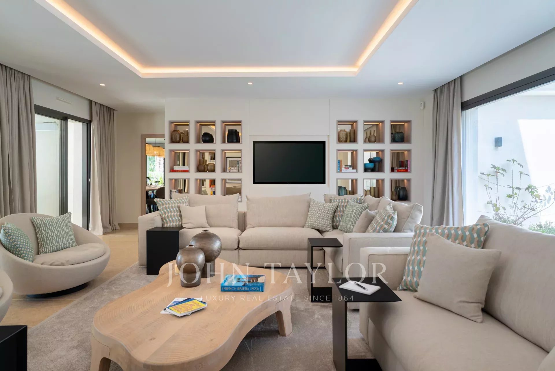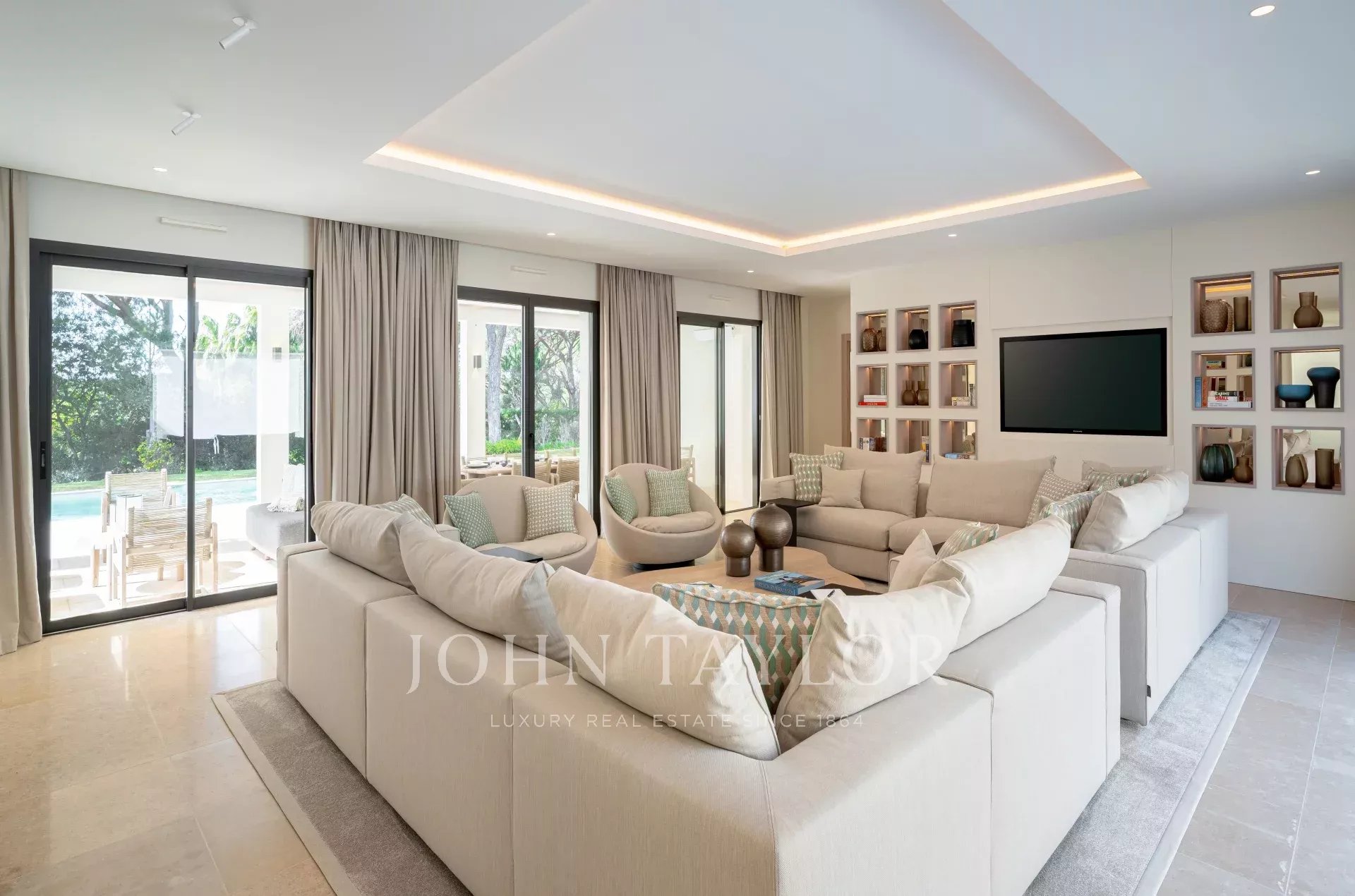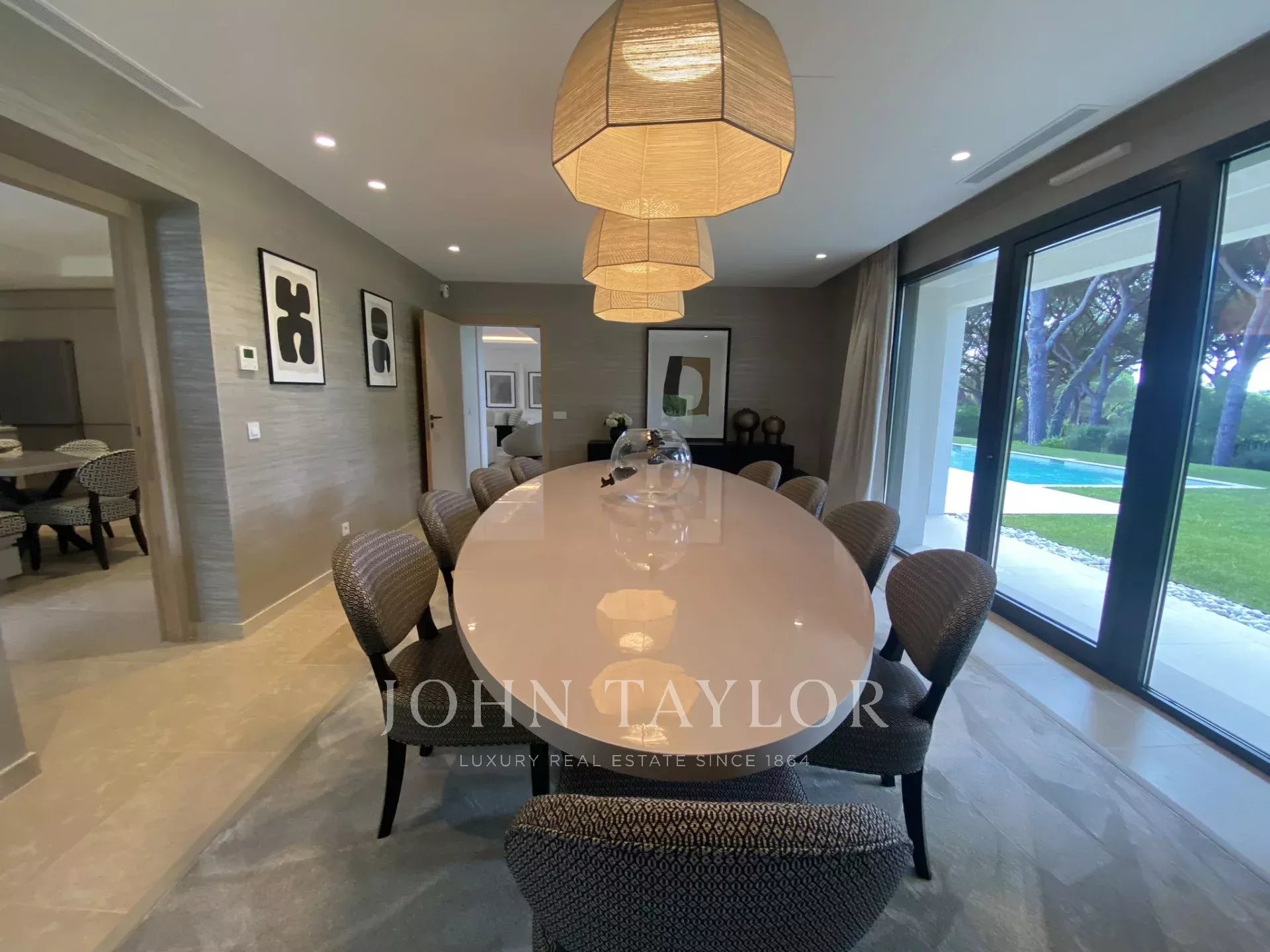 Большая прихожая с выходом на три уровня, гостиная, выходящая в патио и на крытую террасу с видом на бассейн, элегантная столовая, полностью оборудованная кухня с обеденной зоной, комната консьержа с отдельным входом для персонала, включая мини-кухню и гостиную.