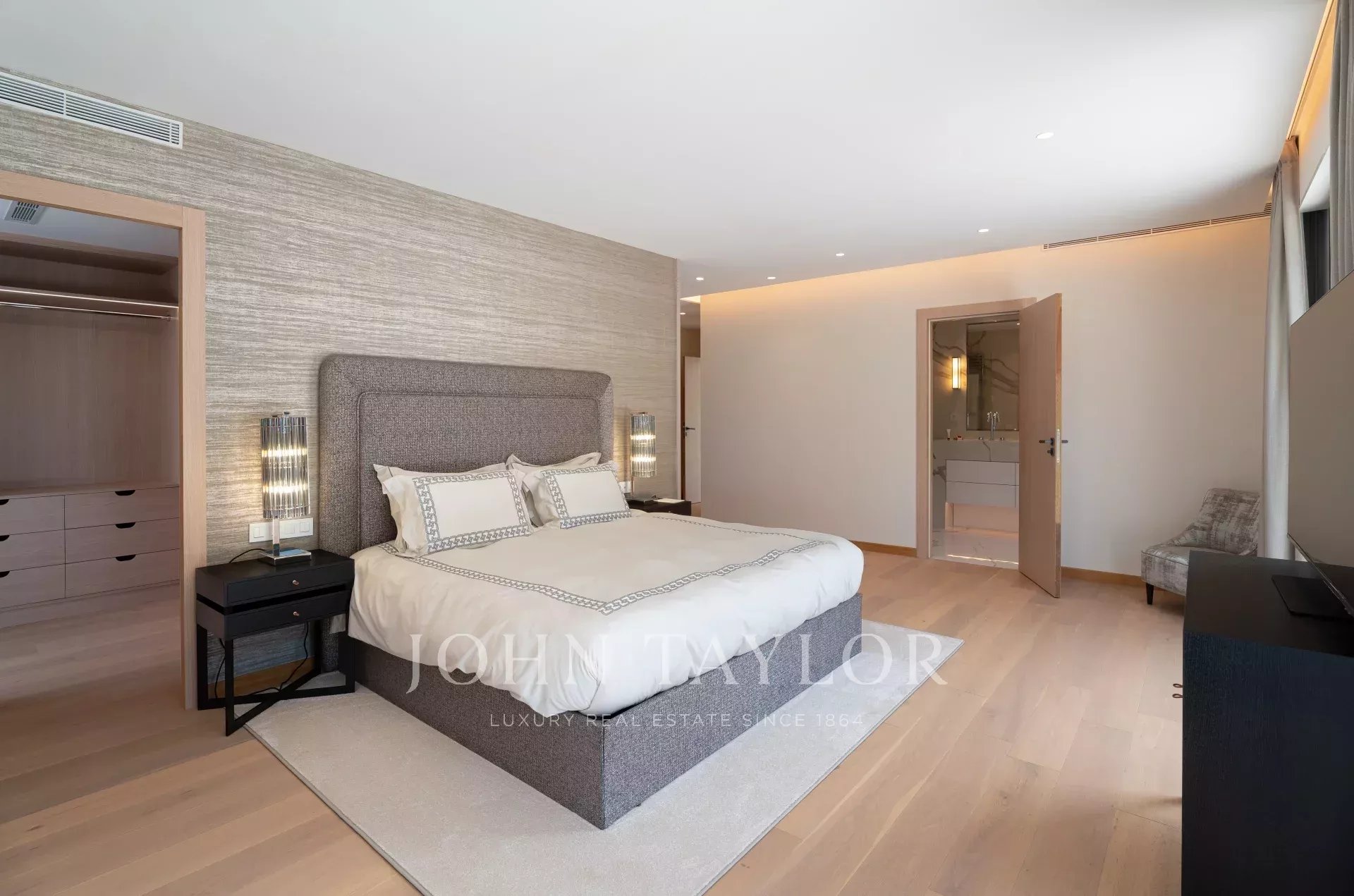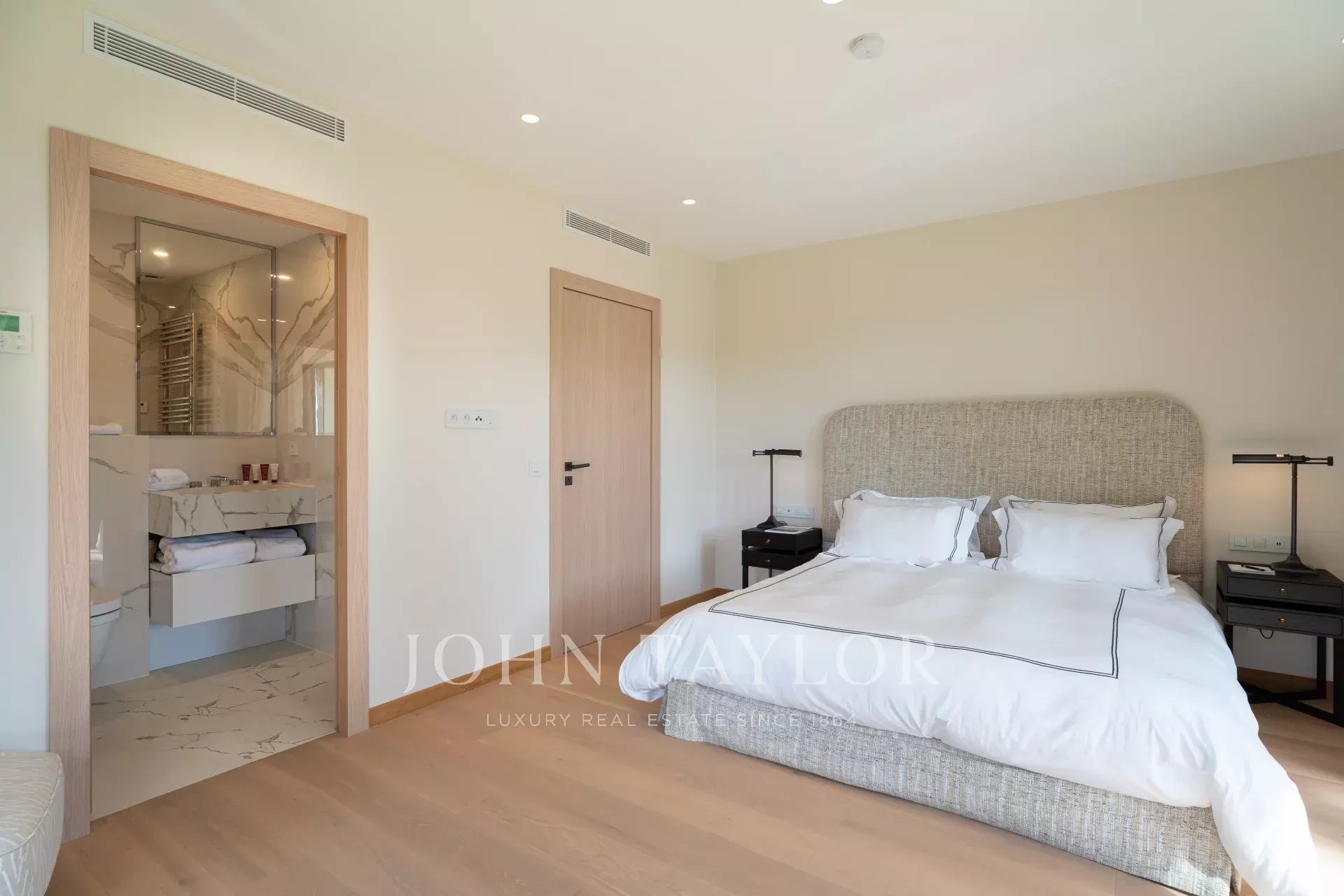 Коридор ведет к двум спальням (кровати 160), каждая с собственной душевой комнатой/туалетом, а также к спальне (кровать 180), гардеробной и душевой комнате/туалету. Отдельная спальня (кровать/180), гардеробная и душевая комната/туалет.