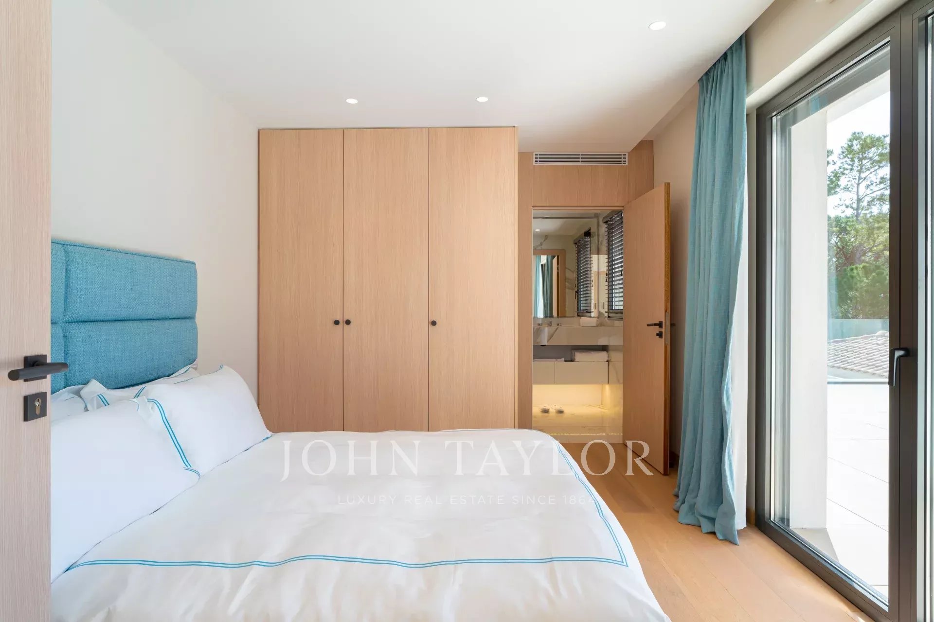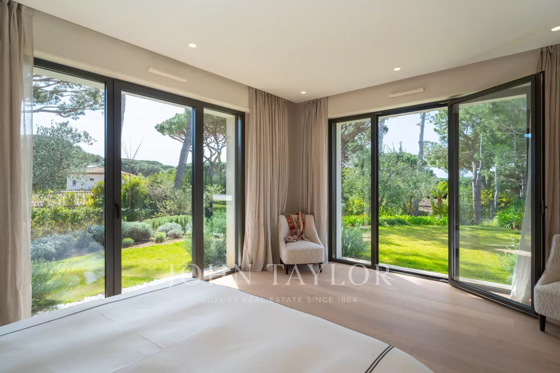 Просторная спальня (кровать/200), кабинет, ванная/душ/туалет и гардеробная, выходящая на частную террасу с видом на сад и зонтичные сосны.