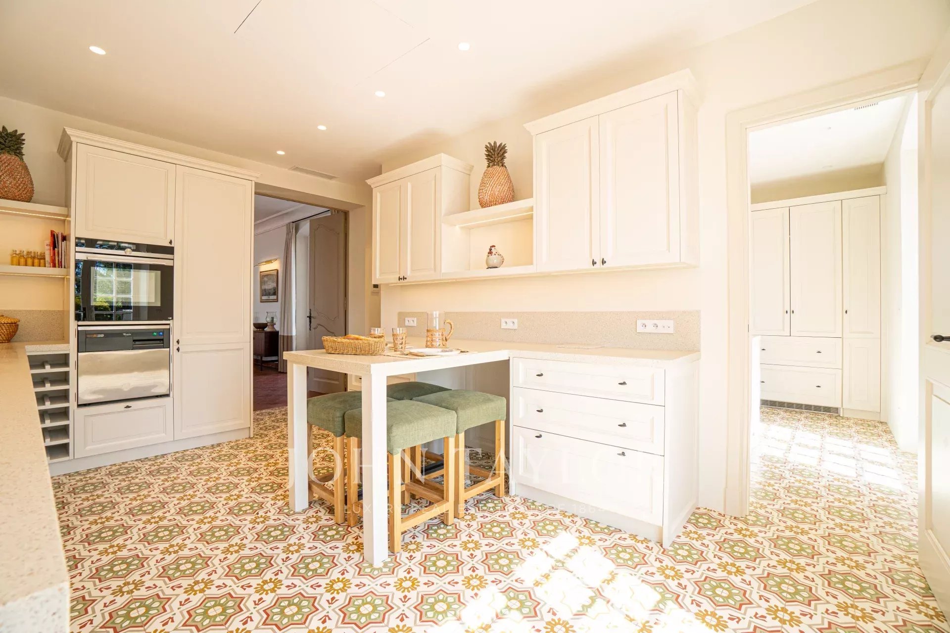 На первом этаже расположены гостиная с двойным видом, выходящая на просторные террасы, ТВ-салон, столовая и кухня с подсобным помещением.