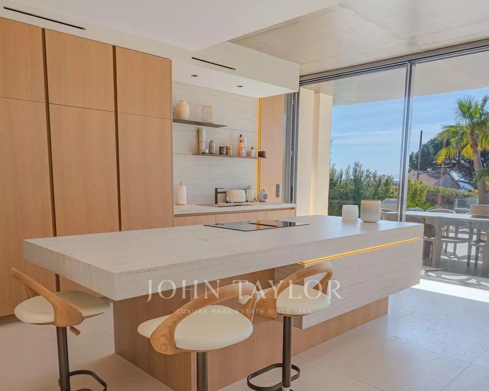 - Вход, ведущий в просторную гостиную с полностью оборудованной кухней открытого плана (2 холодильника, традиционная духовка, микроволновая печь, кофейный уголок, техника SMEG), гостиную и столовую, выходящую на террасу с видом на море.