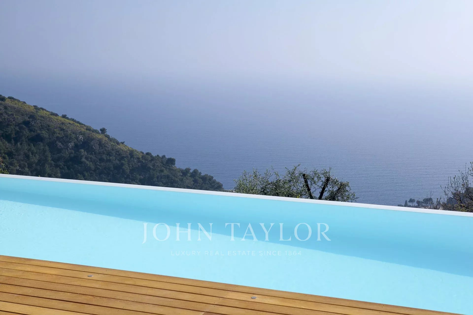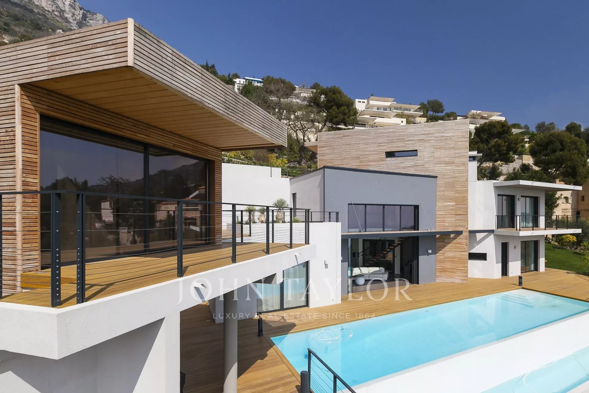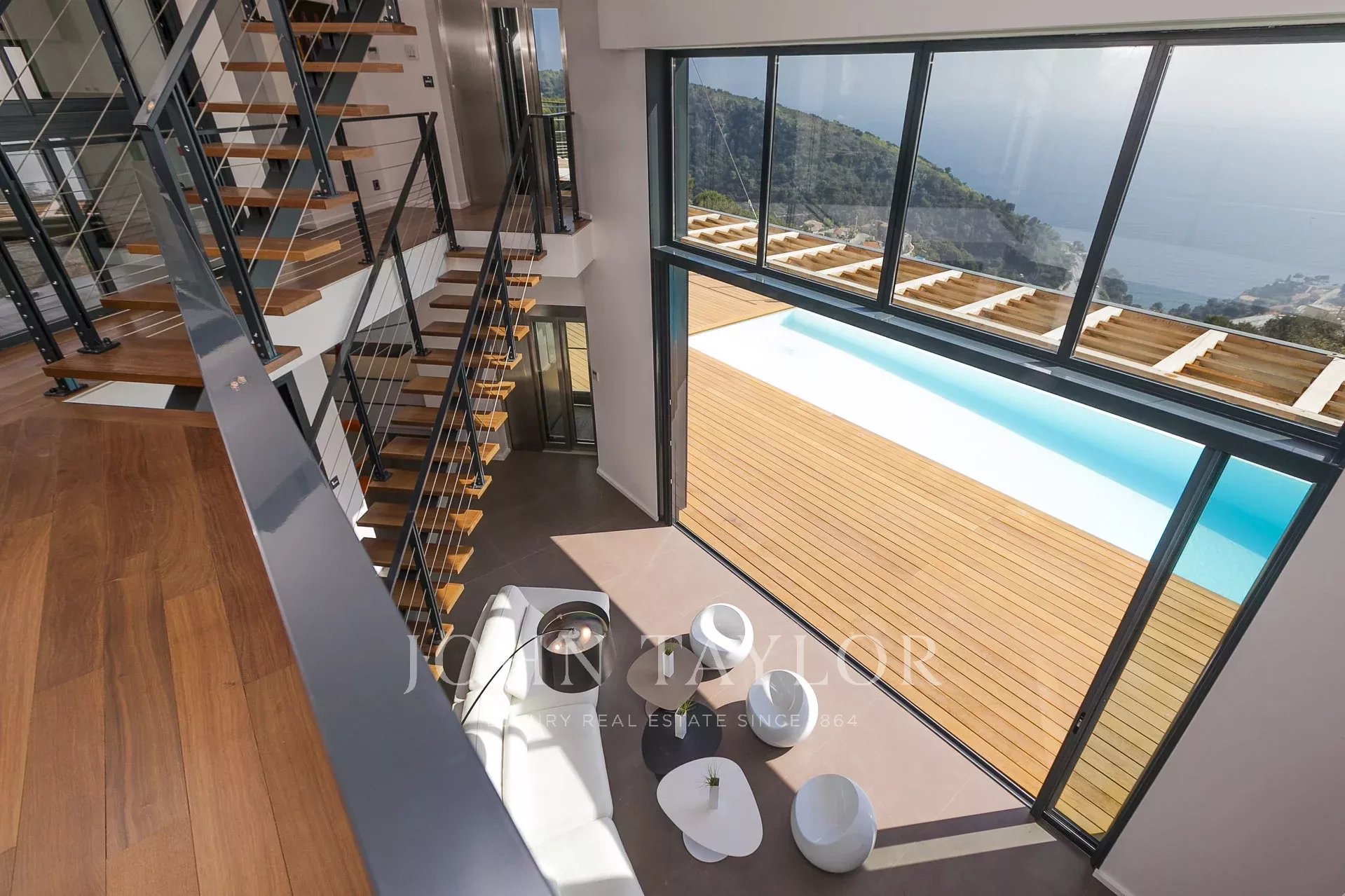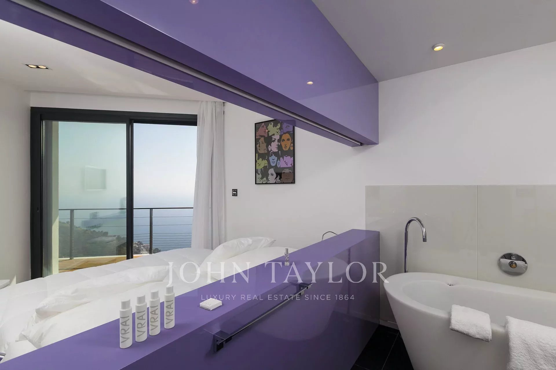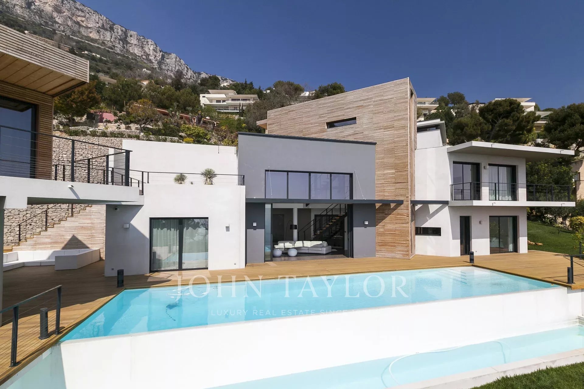 Великолепная вилла в современном стиле, площадью 350 кв м жилой площади на участке площадью около 2 200 м2, расположена на холмах Эз в жилом районе, с прекрасным видом на море и холмы. Вилла состоит из 5 спален (каждая со своей ванной комнатой или душем, гостиная с выходом на просторную террасу и бассейном с подогревом, столовая, полностью оборудованная кухня с полу-профессиональной кладовой. Павильон для гостей с одной спальней, ванной и душ.