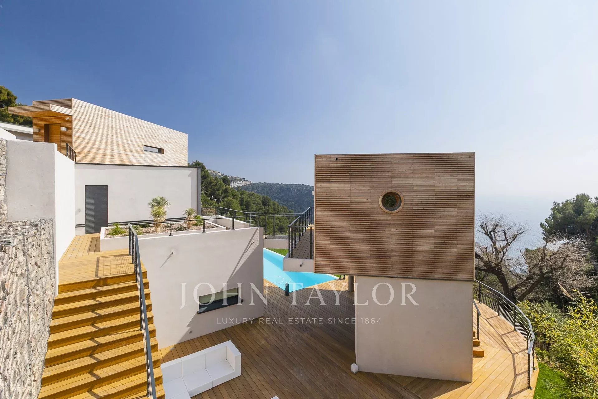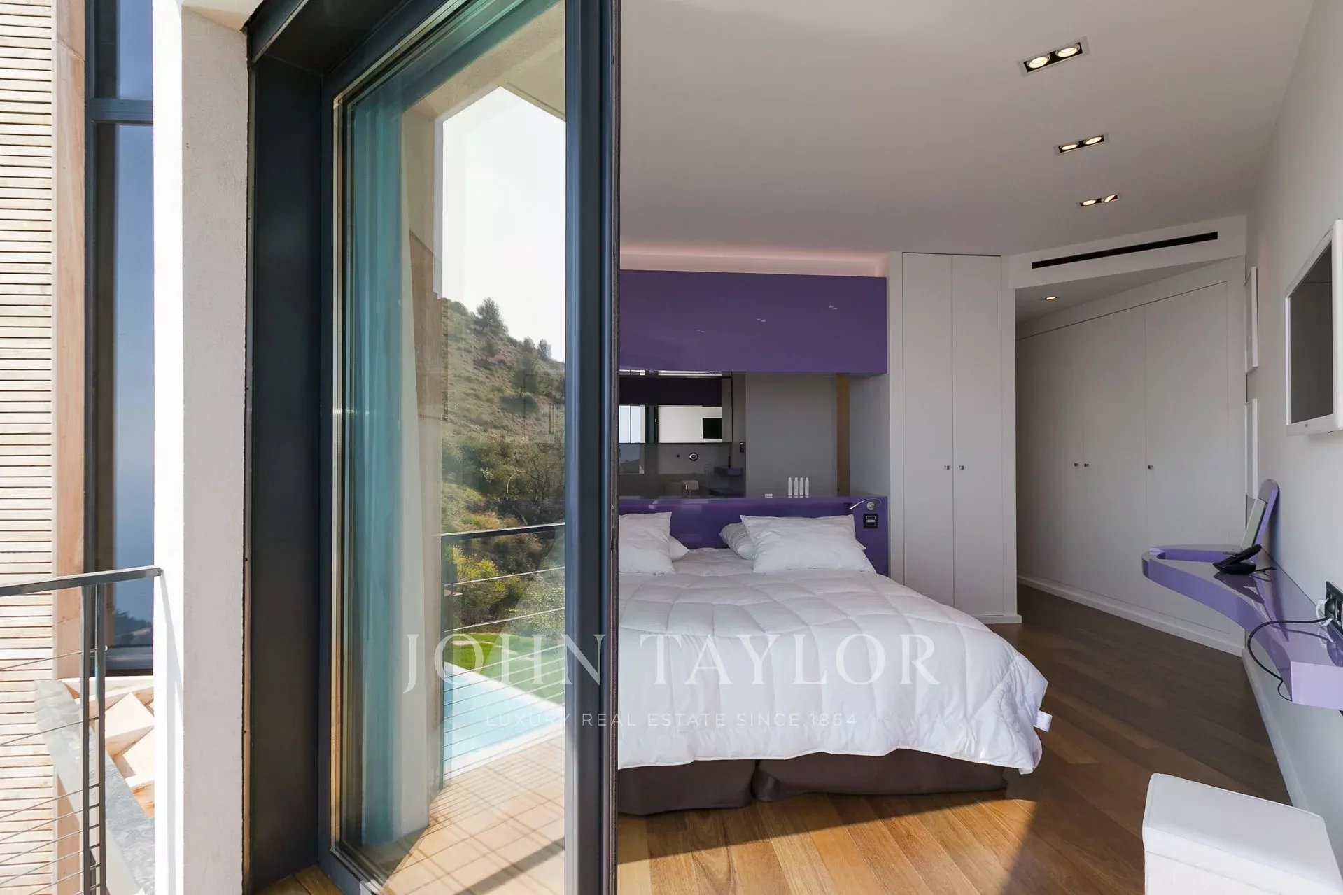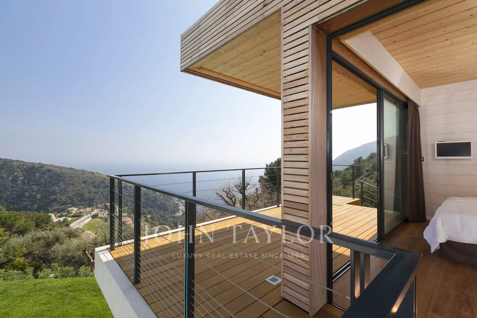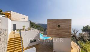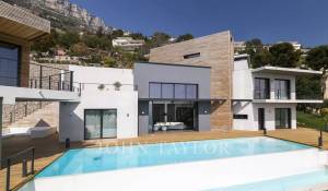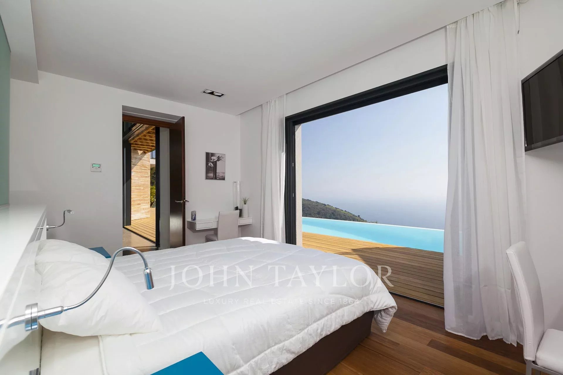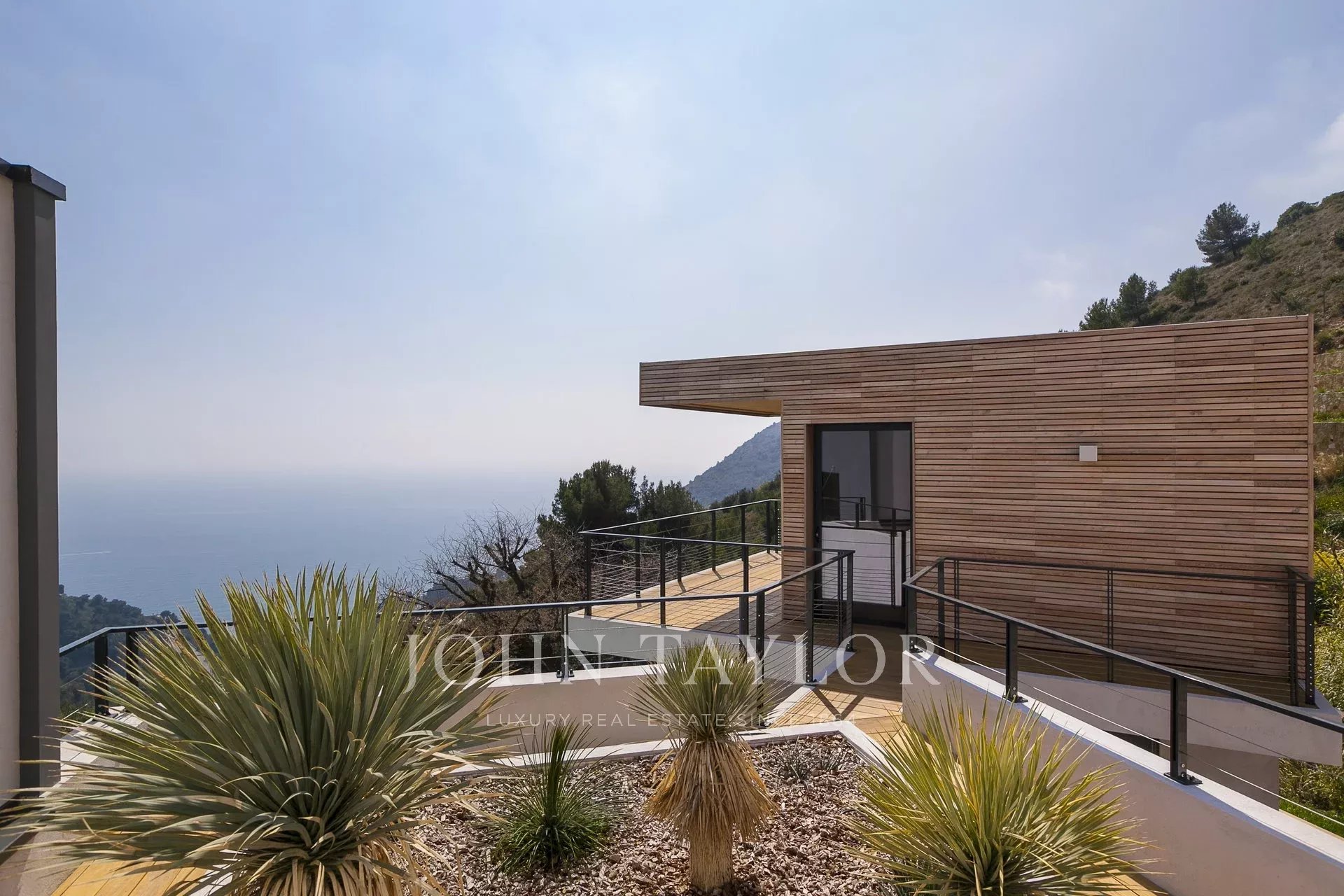 Великолепная вилла в современном стиле, площадью 350 кв м жилой площади на участке площадью около 2 200 м2, расположена на холмах Эз в жилом районе, с прекрасным видом на море и холмы. Вилла состоит из 5 спален (каждая со своей ванной комнатой или душем, гостиная с выходом на просторную террасу и бассейном с подогревом, столовая, полностью оборудованная кухня с полу-профессиональной кладовой. Павильон для гостей с одной спальней, ванной и душ.