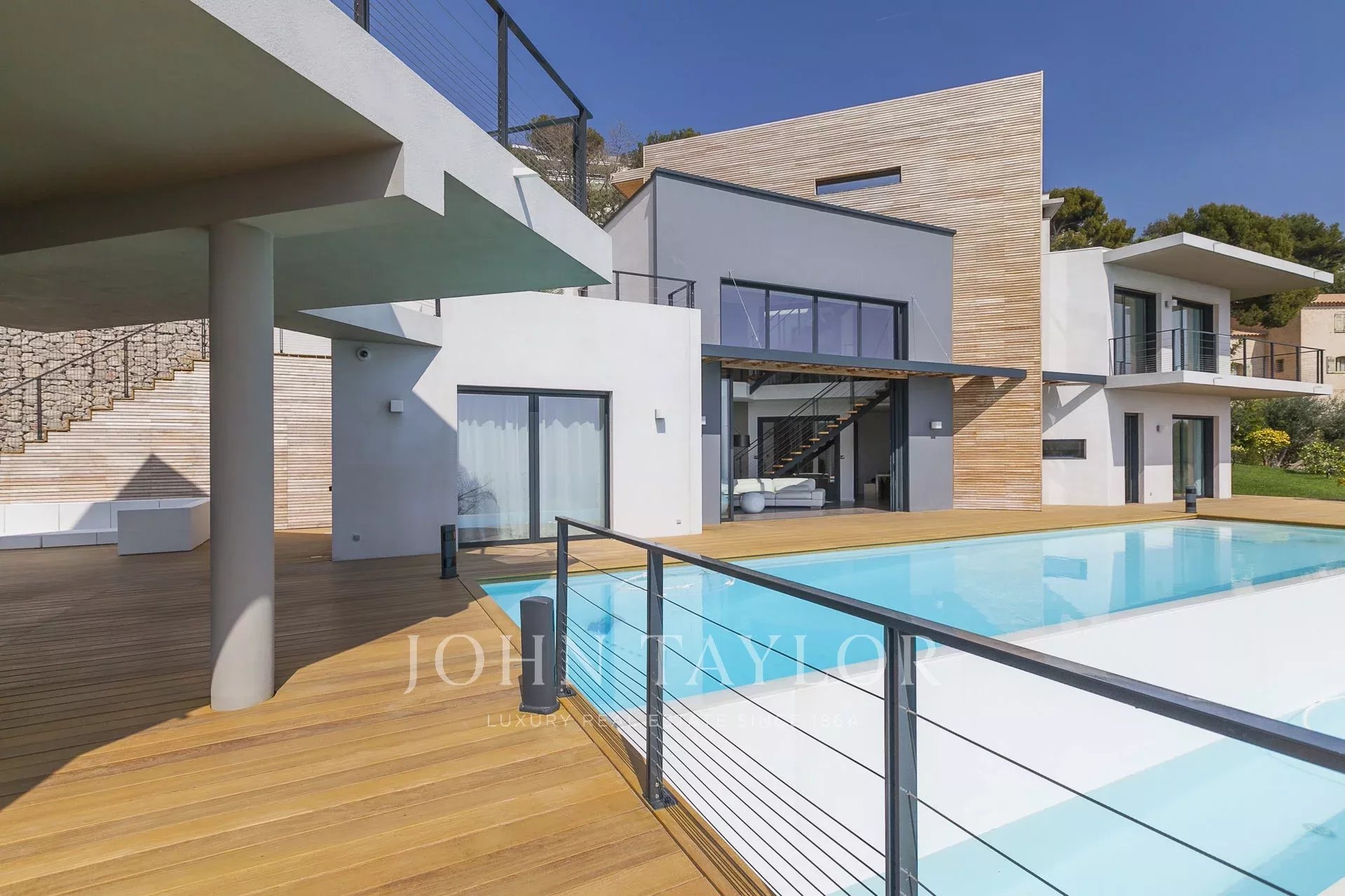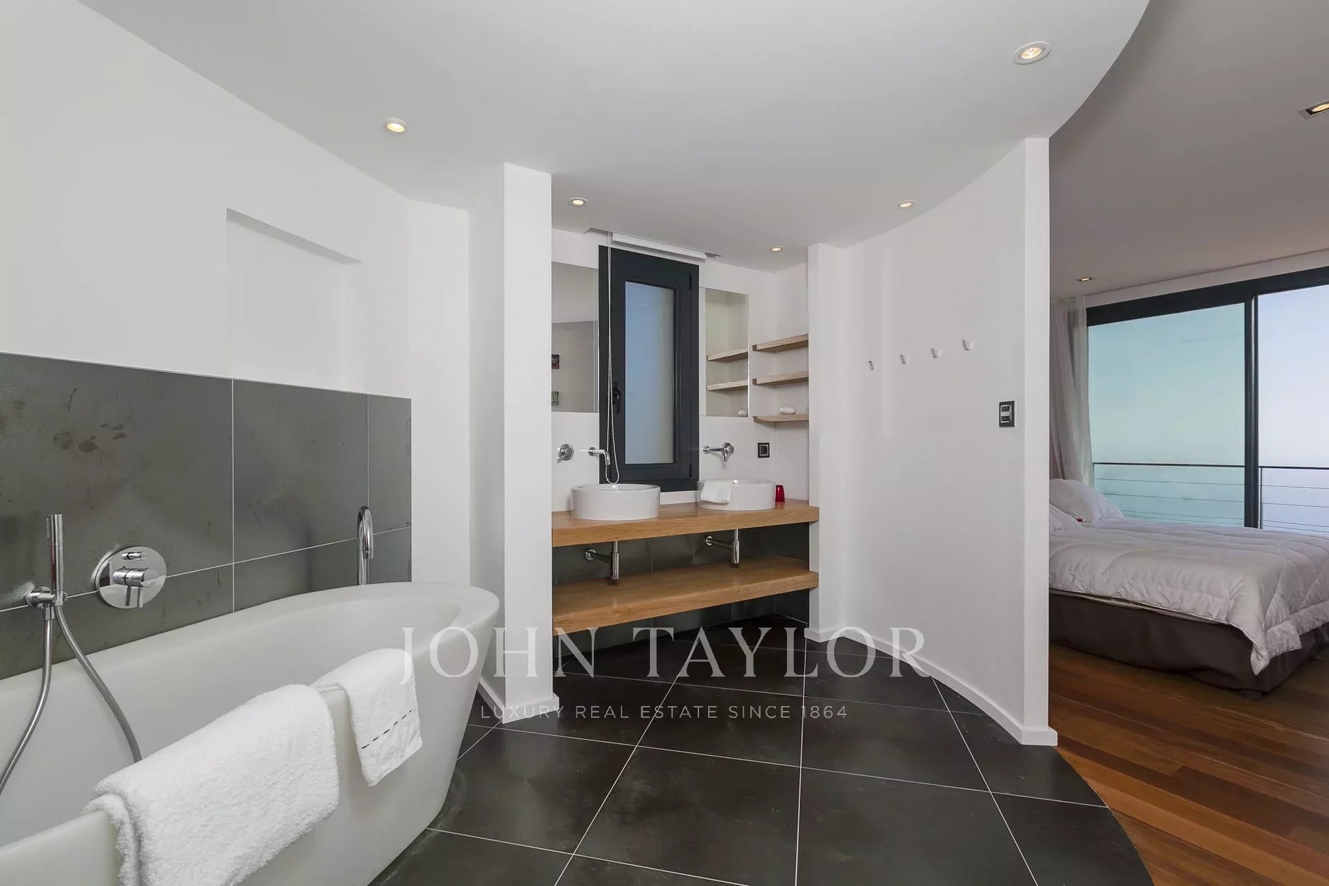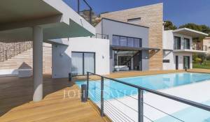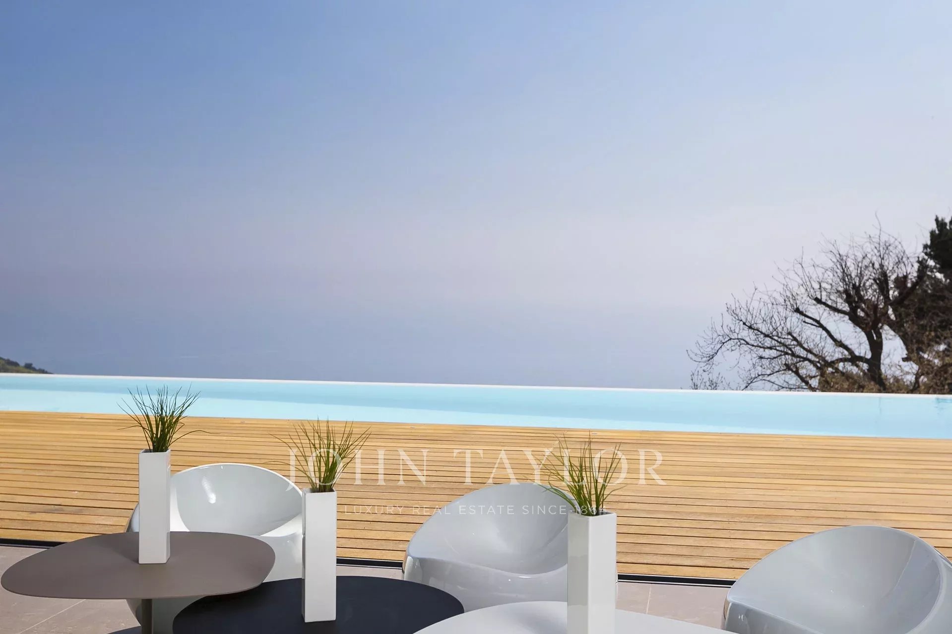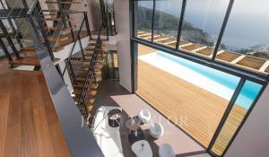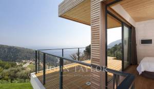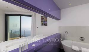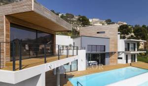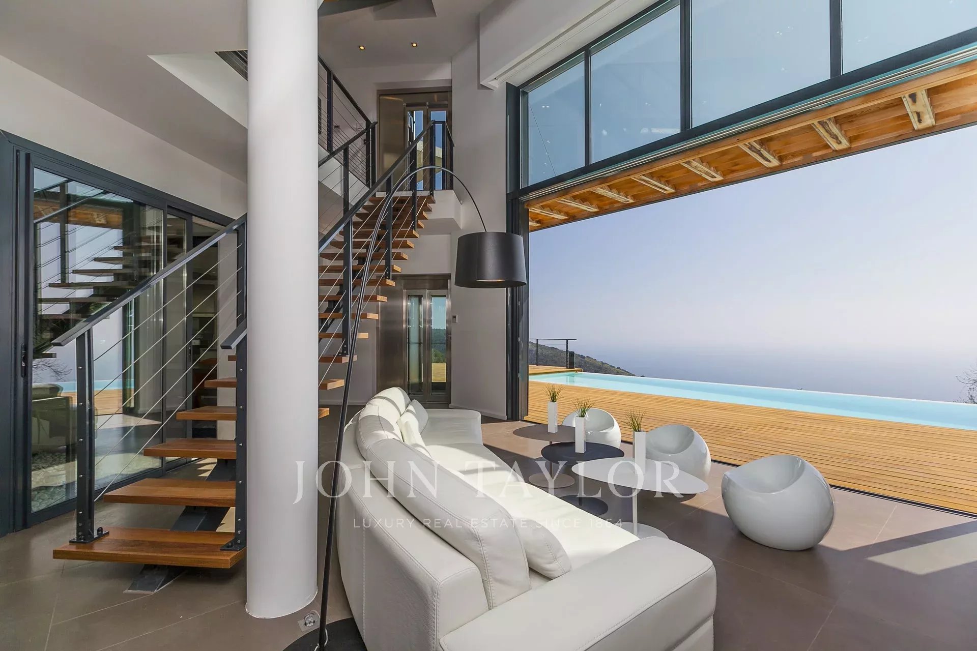 Великолепная вилла в современном стиле, площадью 350 кв м жилой площади на участке площадью около 2 200 м2, расположена на холмах Эз в жилом районе, с прекрасным видом на море и холмы. Вилла состоит из 5 спален (каждая со своей ванной комнатой или душем, гостиная с выходом на просторную террасу и бассейном с подогревом, столовая, полностью оборудованная кухня с полу-профессиональной кладовой. Павильон для гостей с одной спальней, ванной и душ.